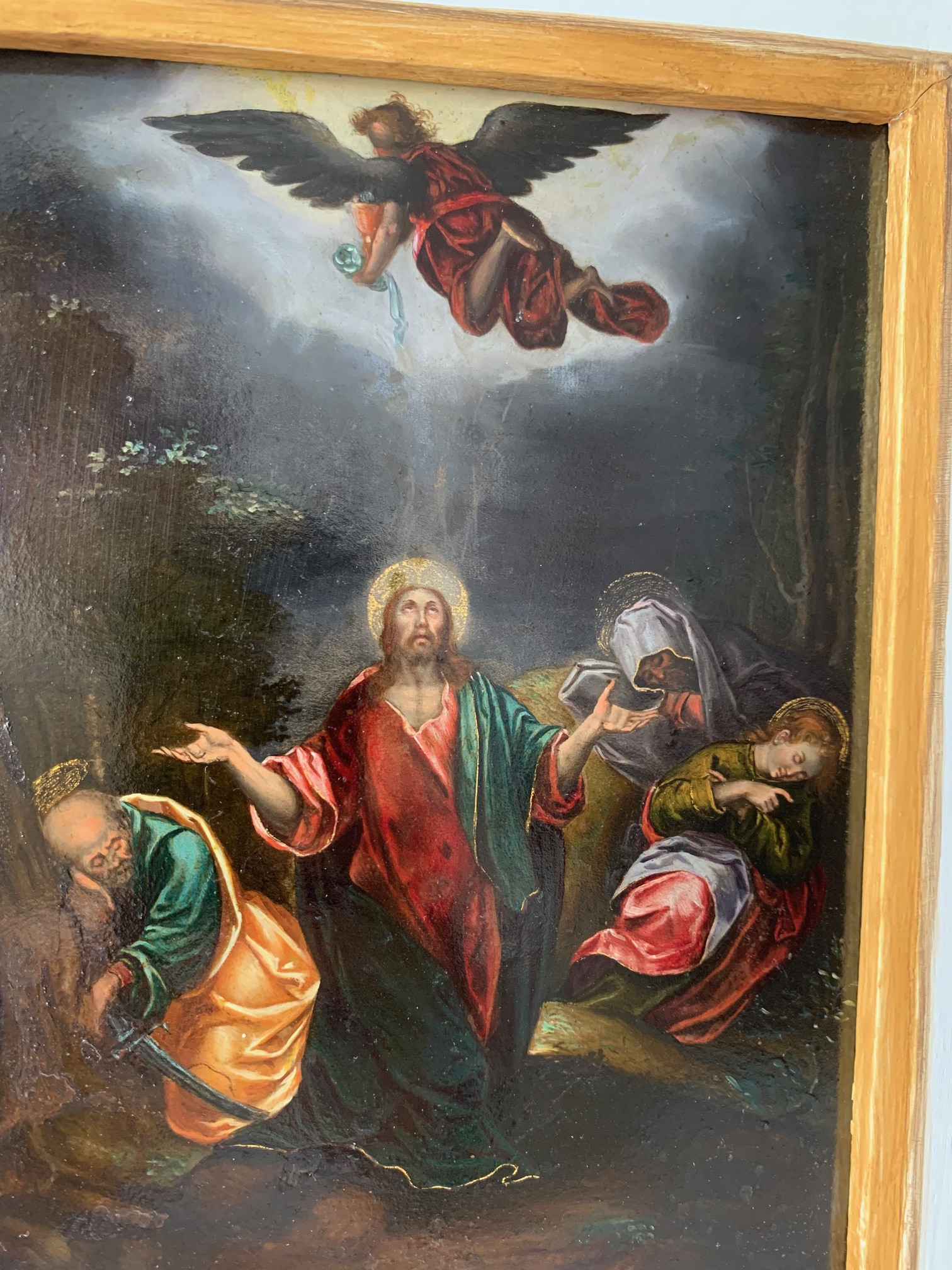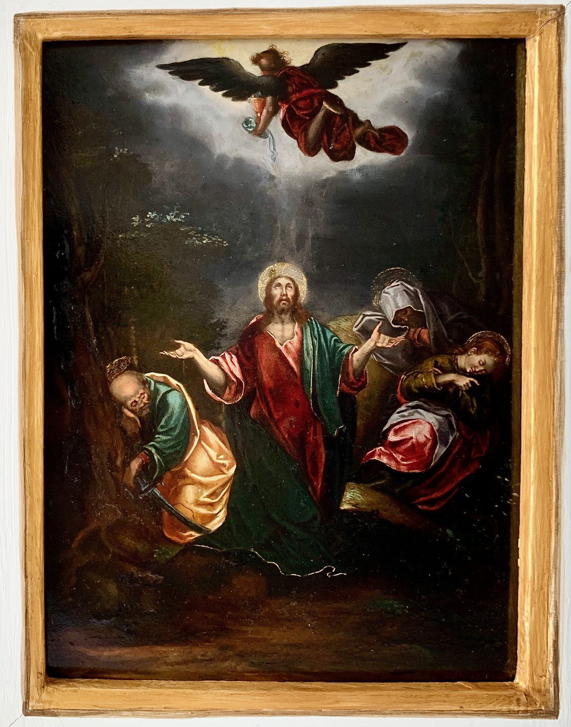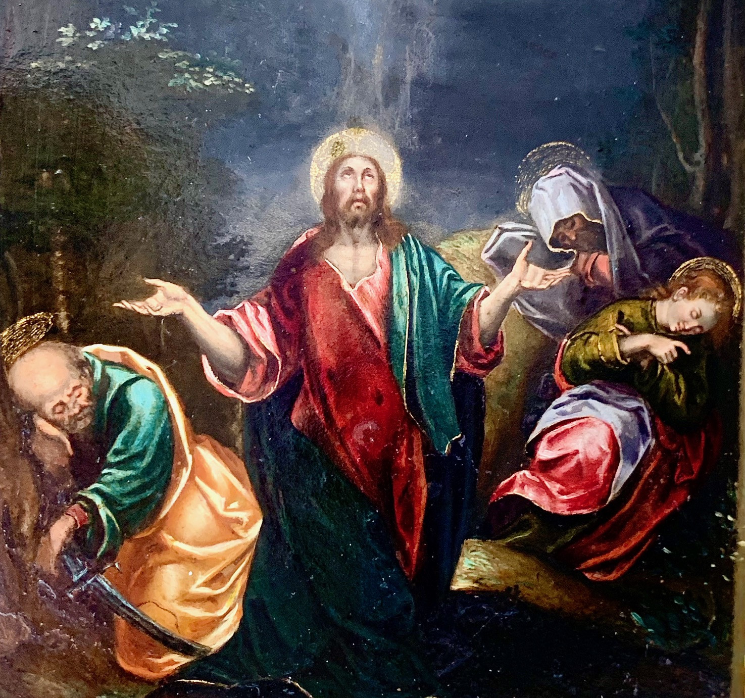 Oración en el huerto de Getsemaní, óleo sobre cobre y resplandores en oro fino, pintura flamenca de mediados del siglo XVII. En la escena se representa Jesús en su ultima oración antecediendo su captura y al inicio de su pasión y muerte, durmiendo a su lado, San Pedro, Santiago y Juan.