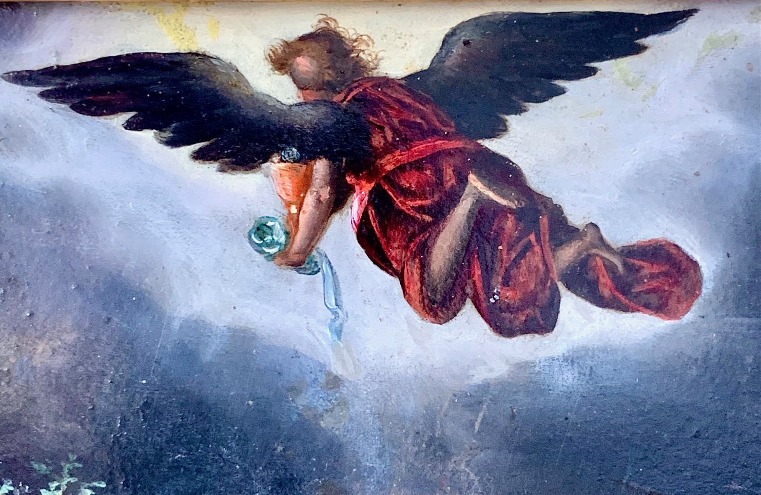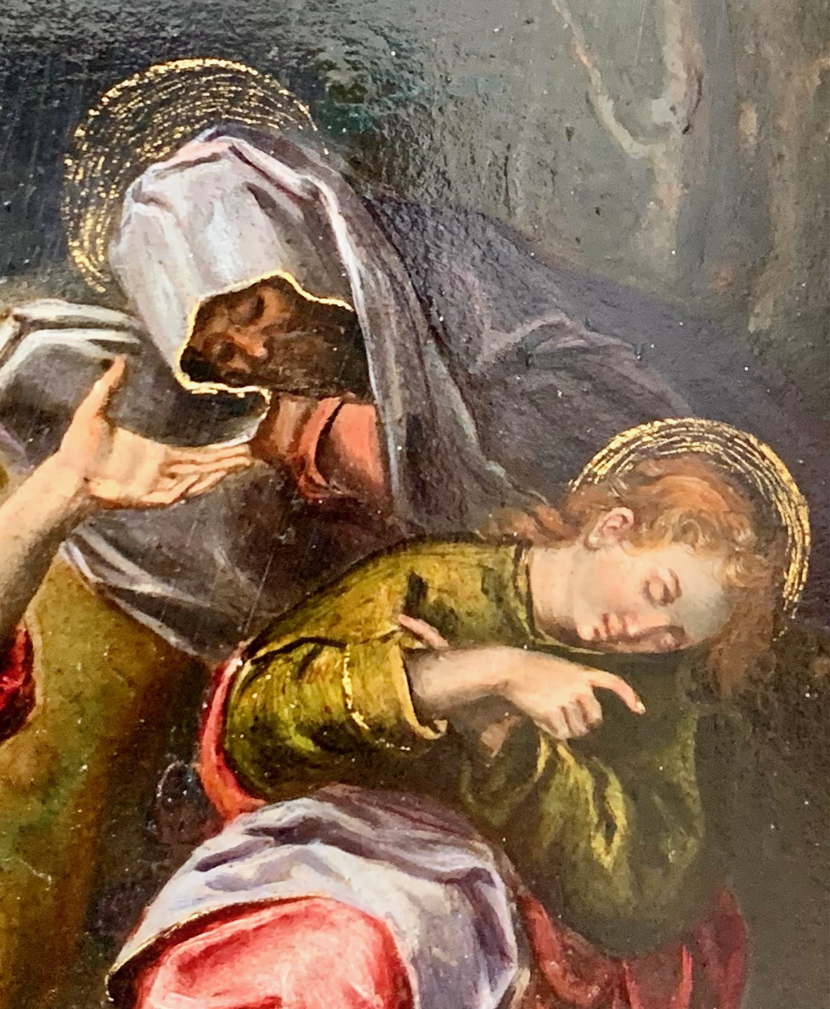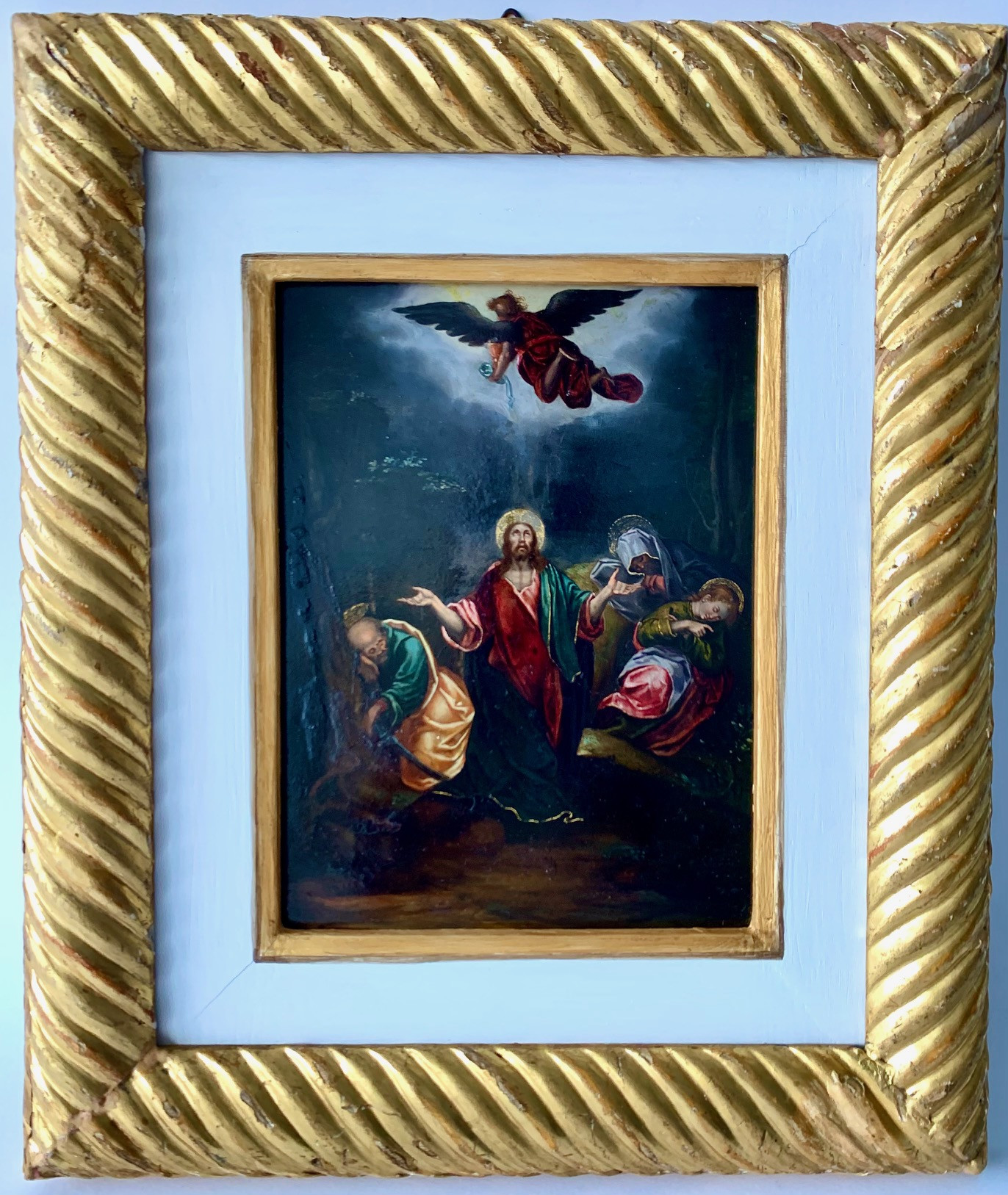 Oración en el huerto de Getsemaní, óleo sobre cobre y resplandores en oro fino, pintura flamenca de mediados del siglo XVII. En la escena se representa Jesús en su ultima oración antecediendo su captura y al inicio de su pasión y muerte, durmiendo a su lado, San Pedro, Santiago y Juan.