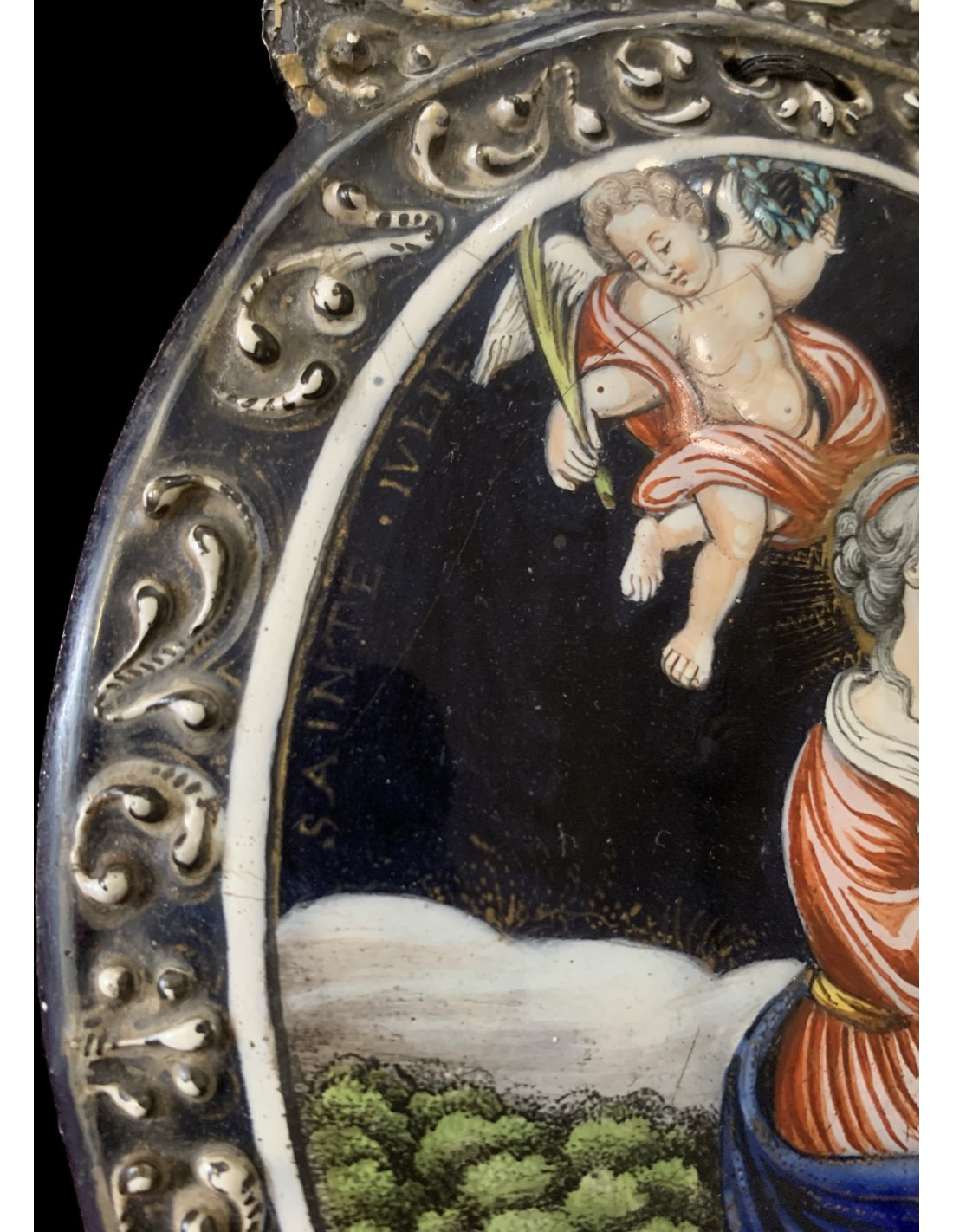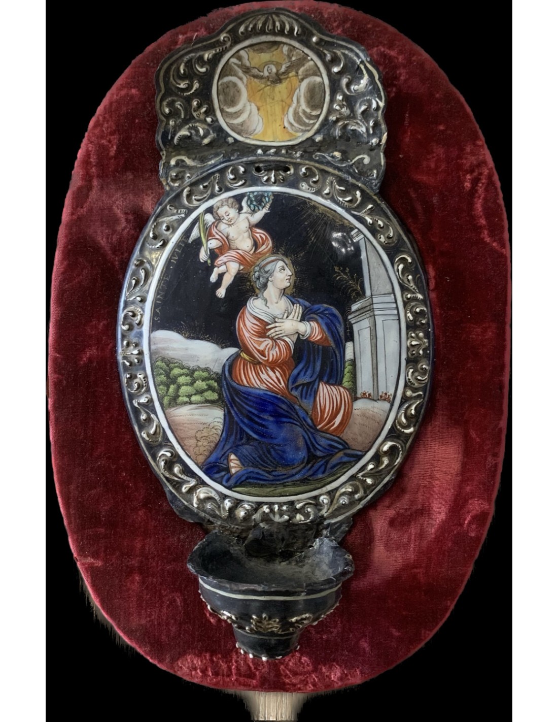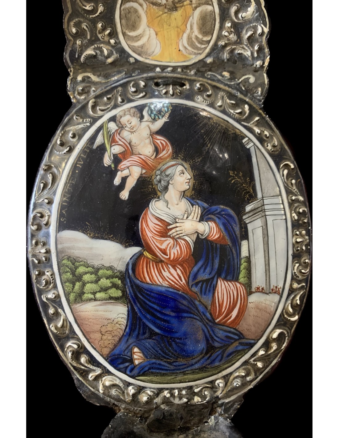 Esmalte de Limoges del siglo XVIII, benditera esmaltada representando Santa Julia “Sainte Julie”, firmado en el lado posterior Jean-Baptiste Nouailher (1699-1775).