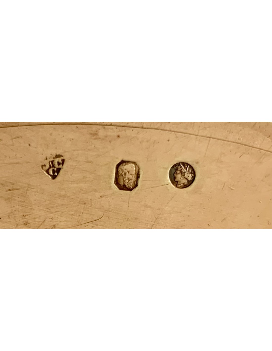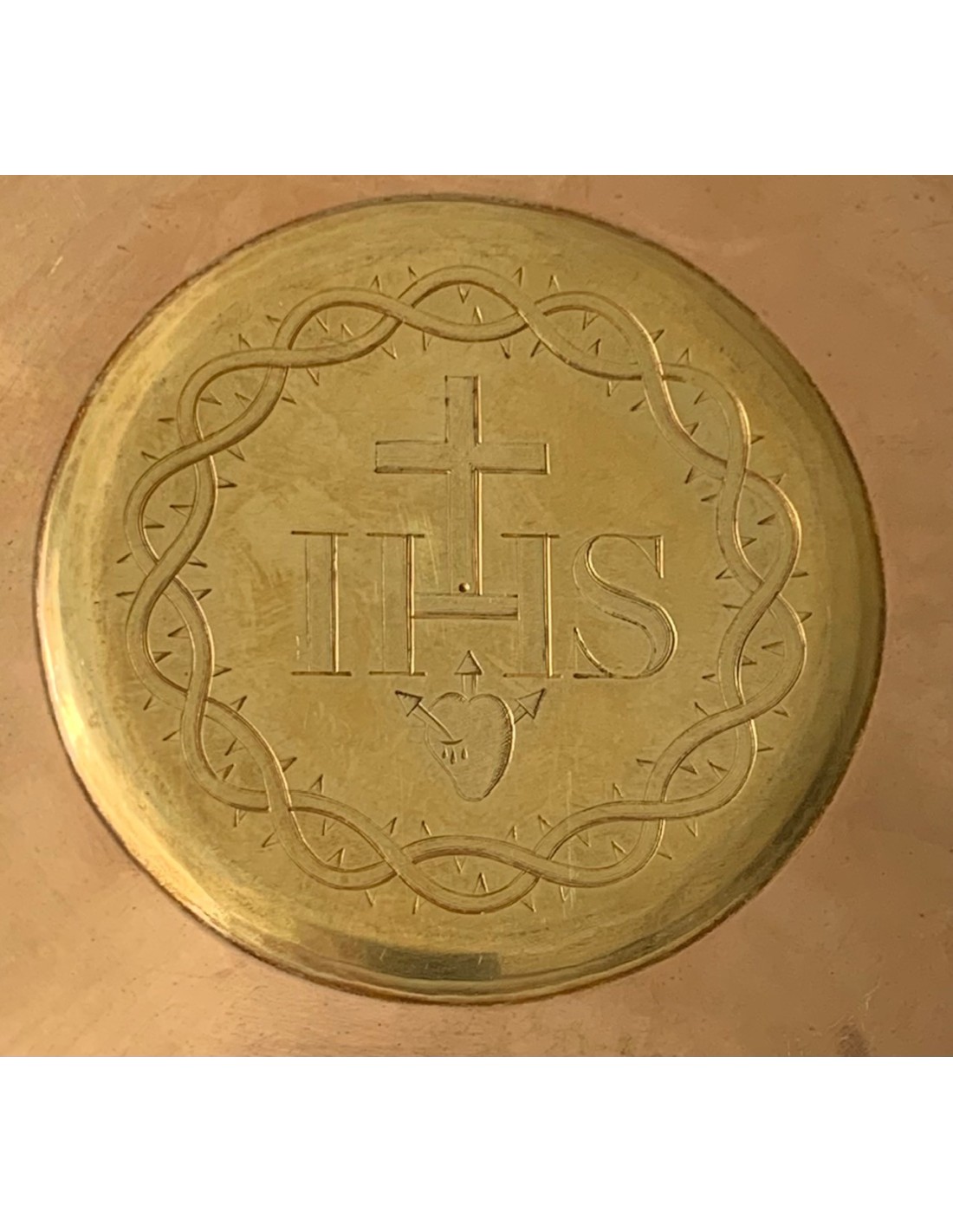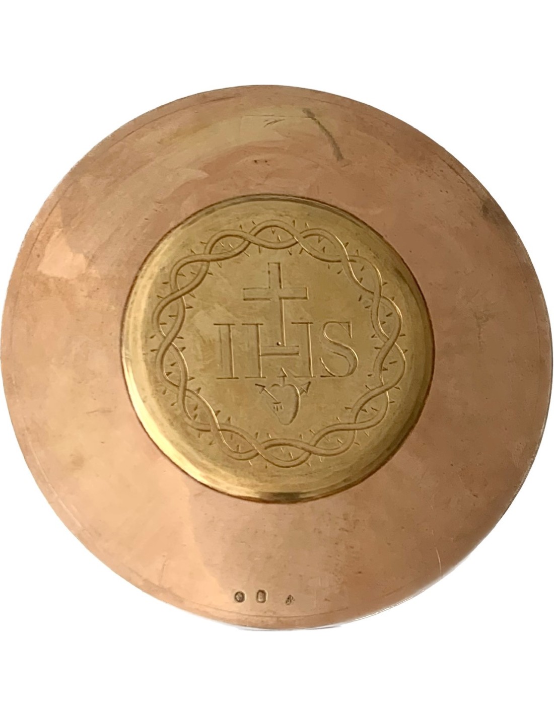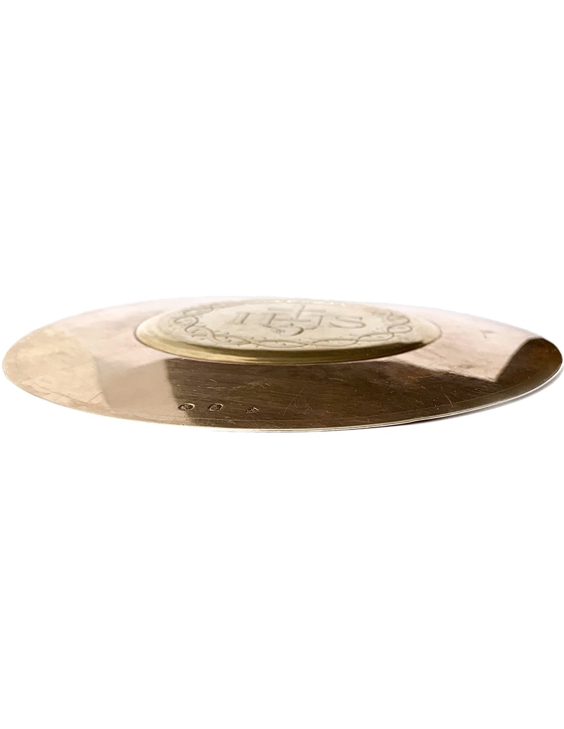 Patena de plata dorada del siglo XIX, Paris Francia, producido entre 1819 y 1838. Tres contraste visibles en la parte trasera. El hombre con la barba representa la pureza de la plata de 950 milésimas realizada en Paris, el redondo con en su interior la diosa Ceres representa la buena garantía de l’objeto.