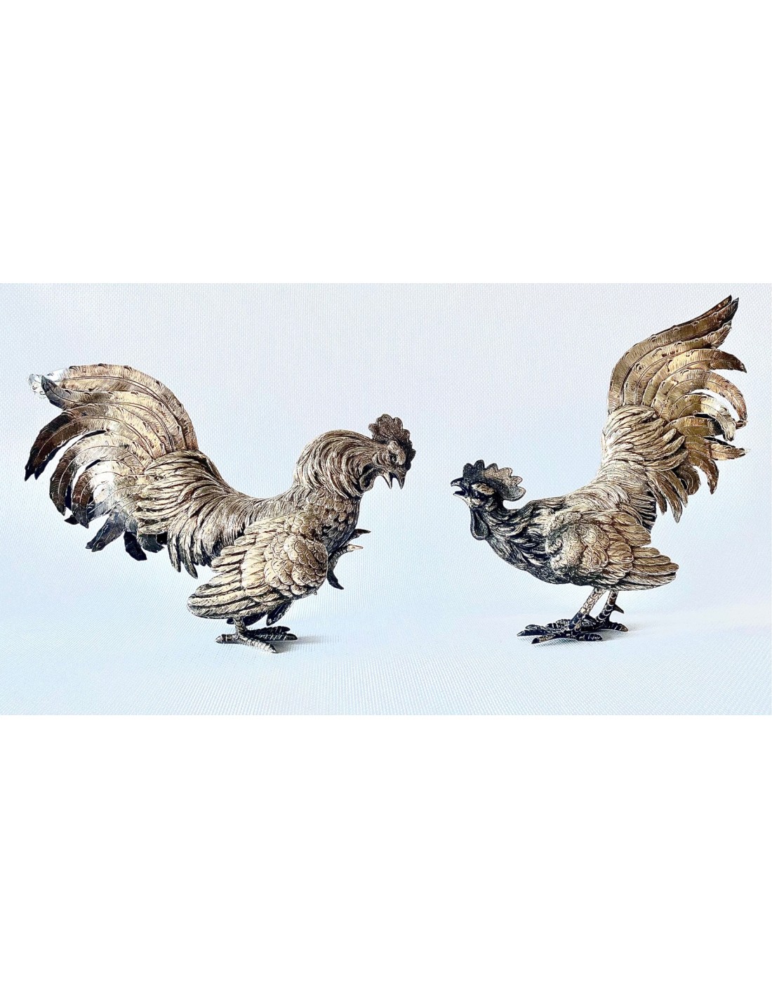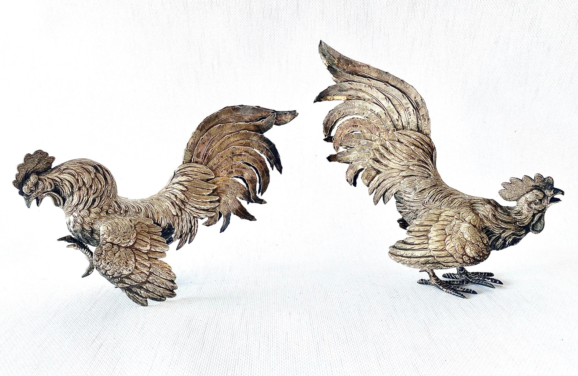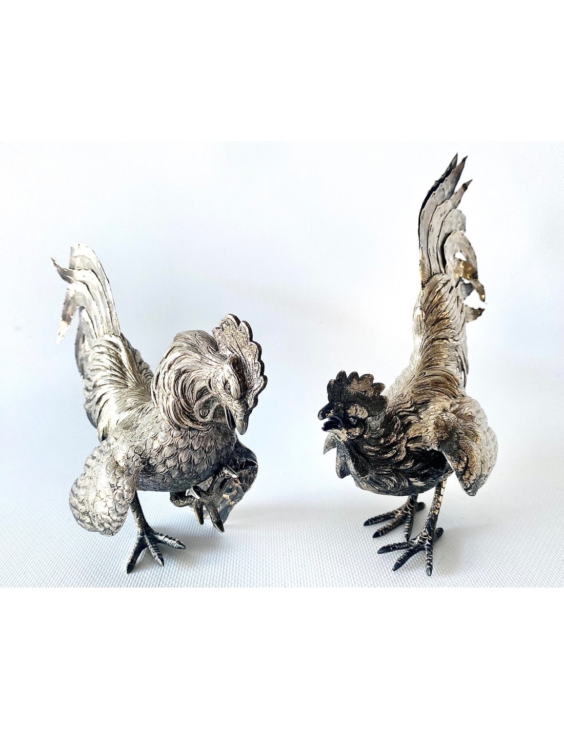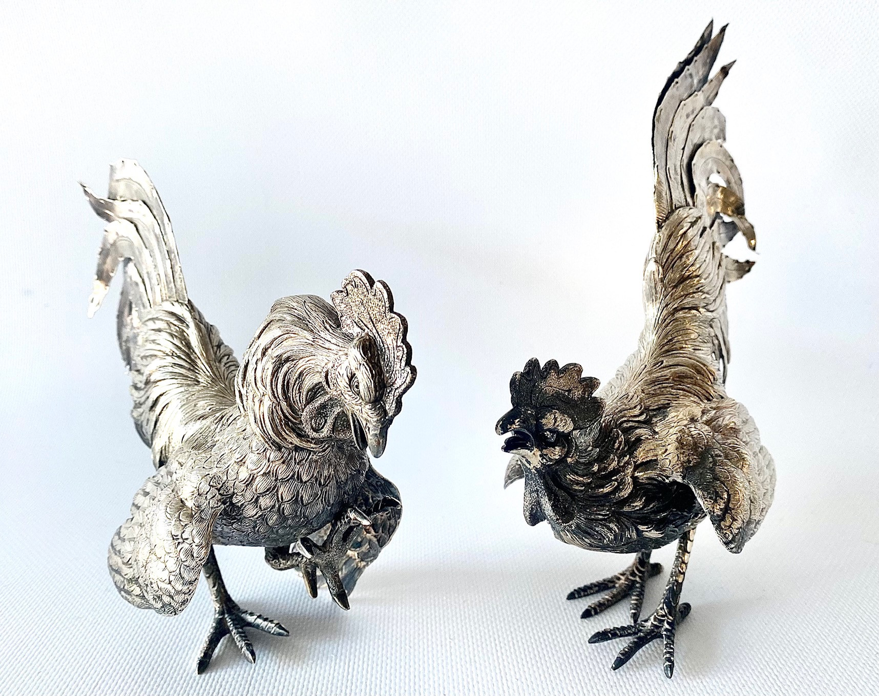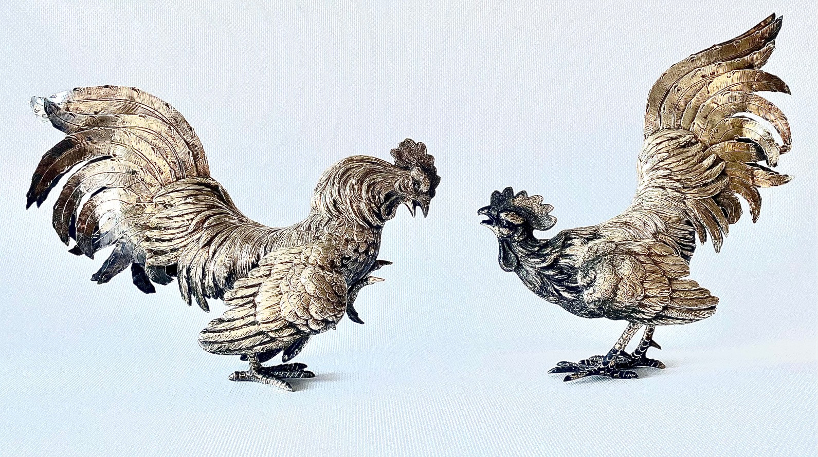 Pareja de “Coqs” gallos de pelea en plata de ley, España Siglo XX.