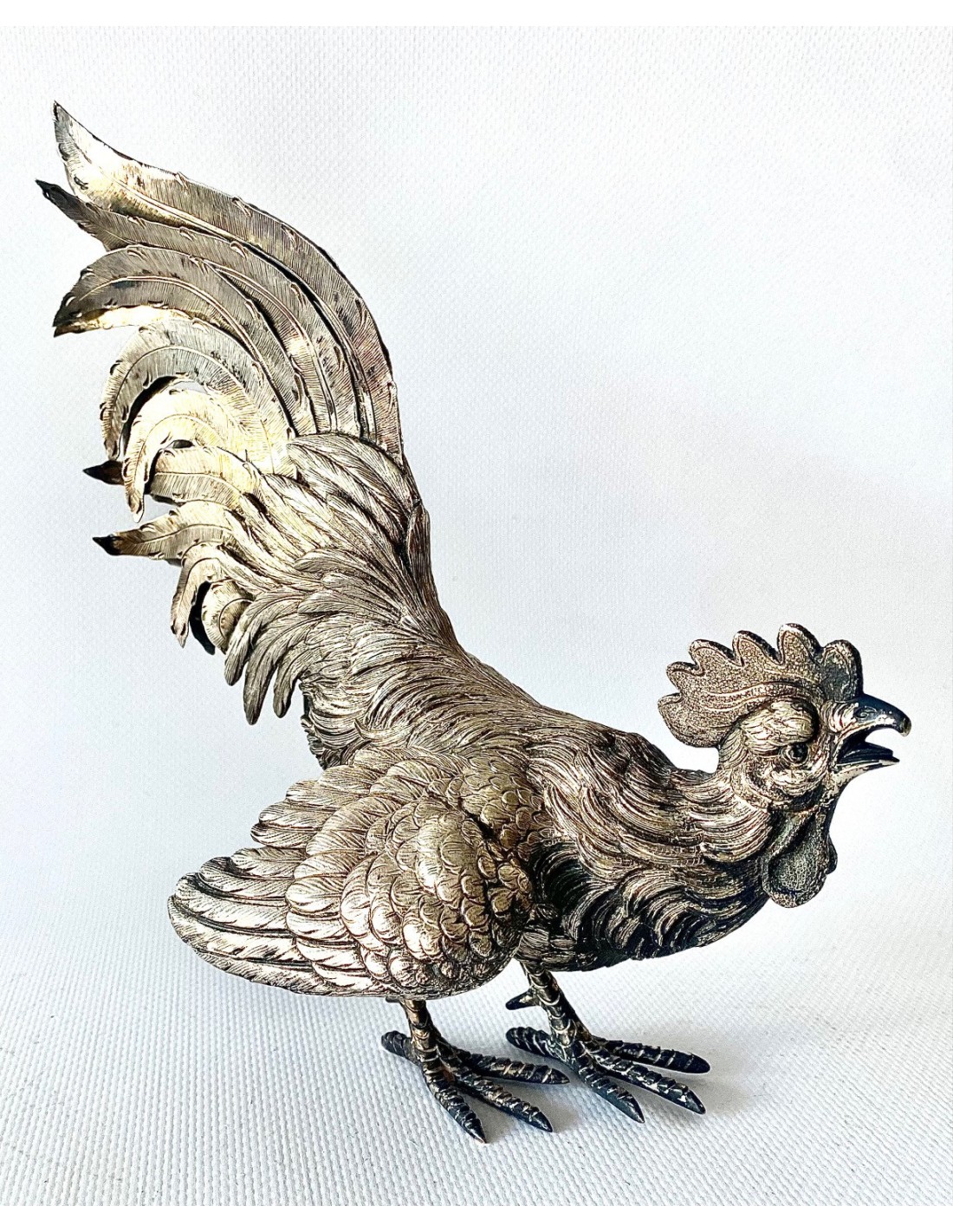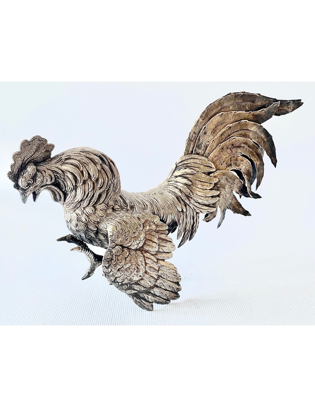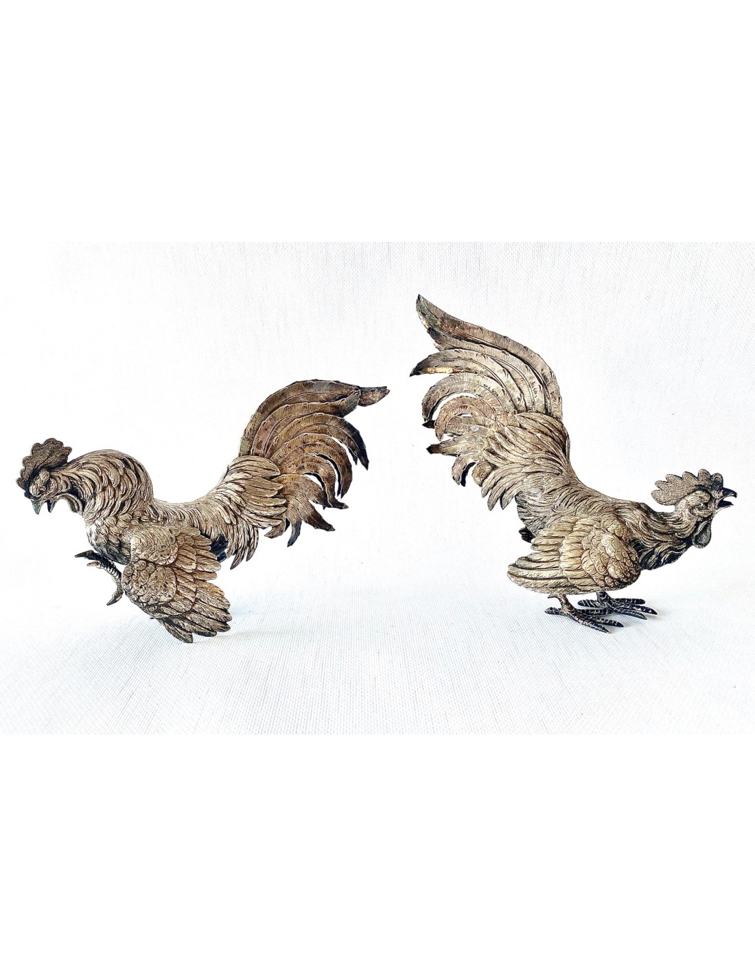 Pareja de Gallos de pelea, artesanales realizados en Plata de Ley 915/1000 punzonada. España, Siglo XX. Magnífico trabajo artesanal, con detalles profusos y labrados. Gallos en postura de pelea. Pequeñas abolladuras, pero en general, buen estado de conservación.
