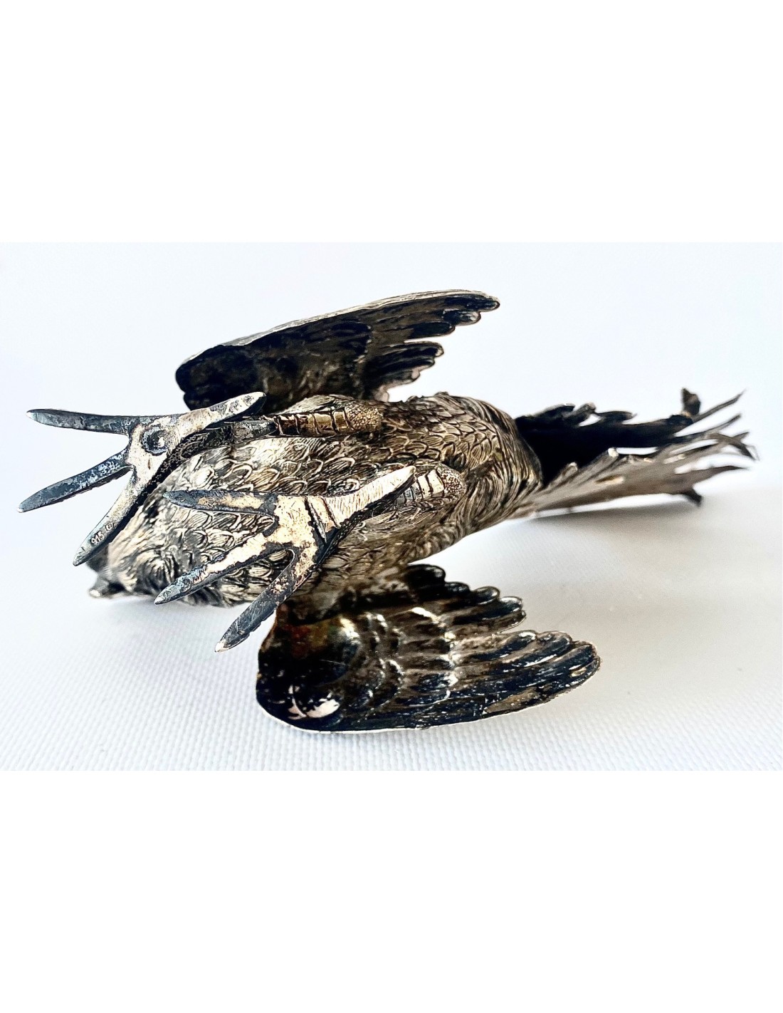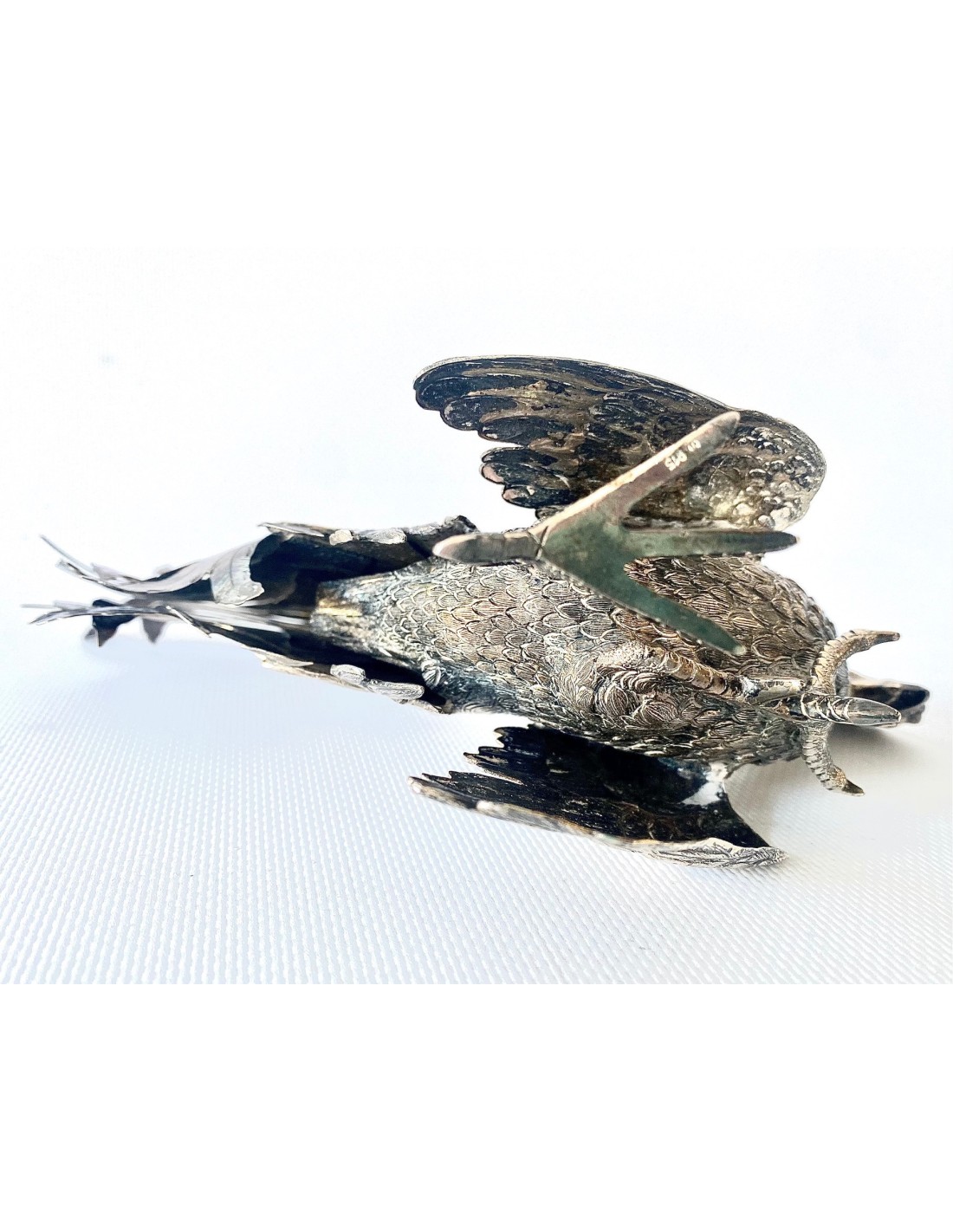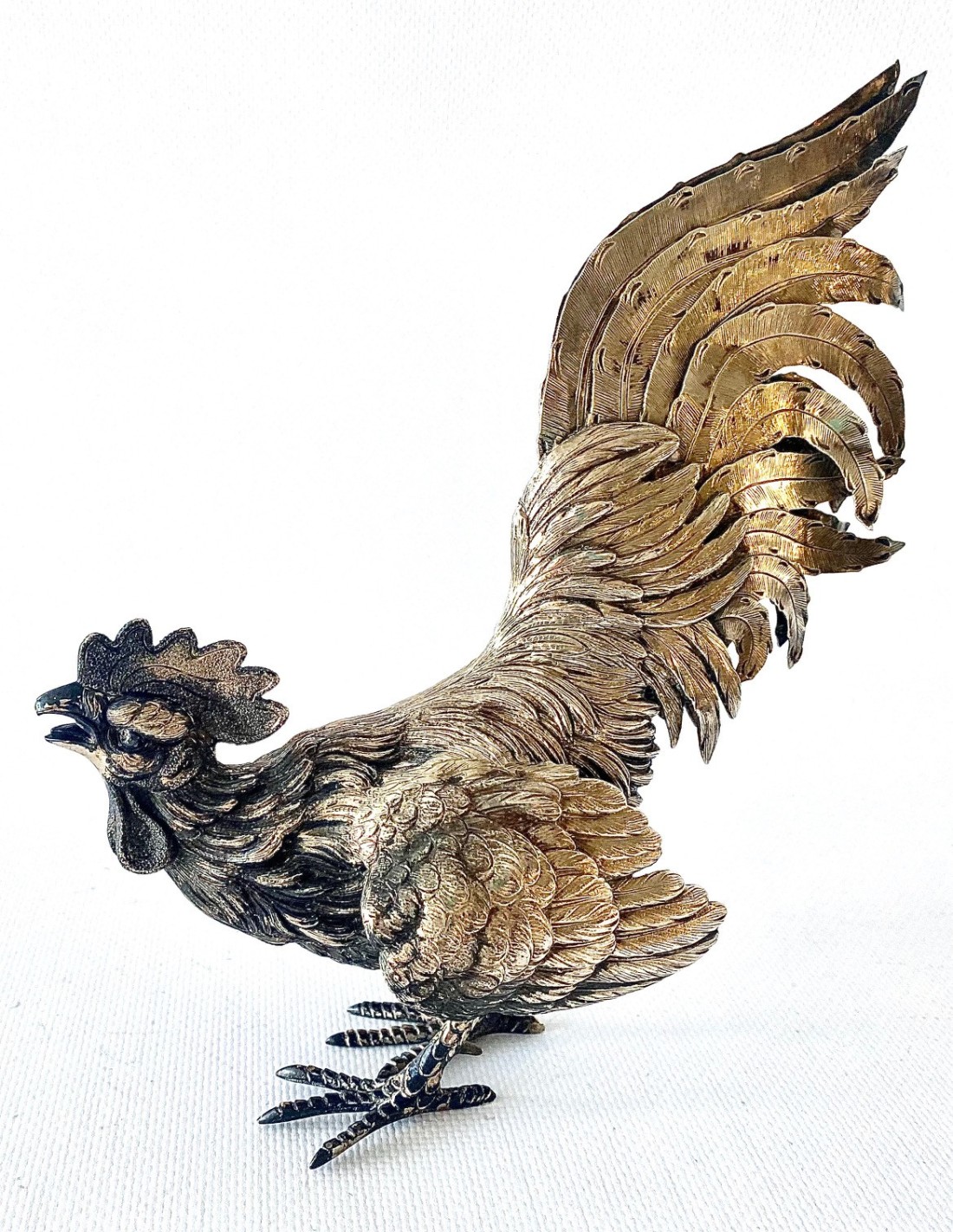 Pareja de Gallos de pelea, artesanales realizados en Plata de Ley 915/1000 punzonada. España, Siglo XX. Magnífico trabajo artesanal, con detalles profusos y labrados. Gallos en postura de pelea. Pequeñas abolladuras, pero en general, buen estado de conservación.