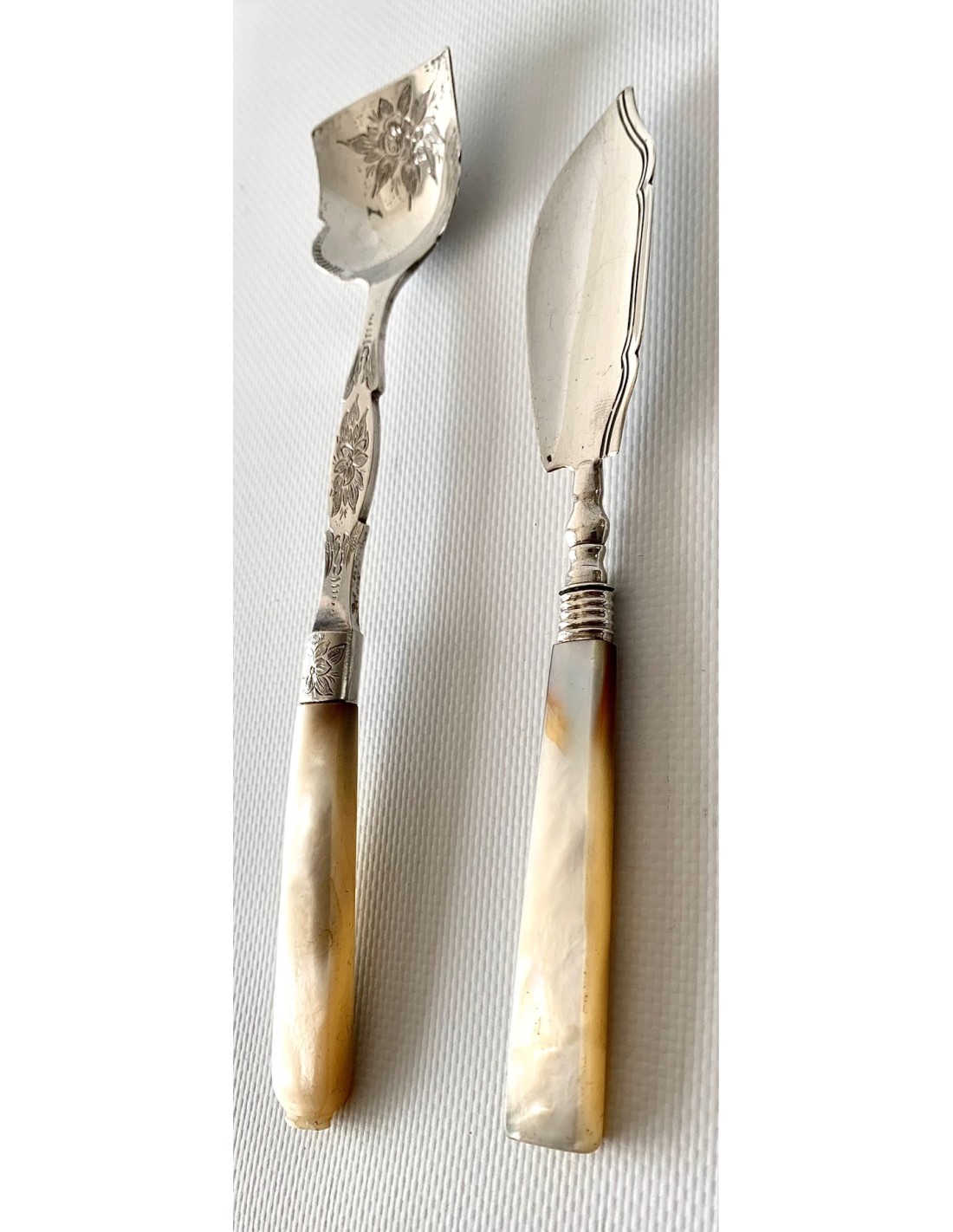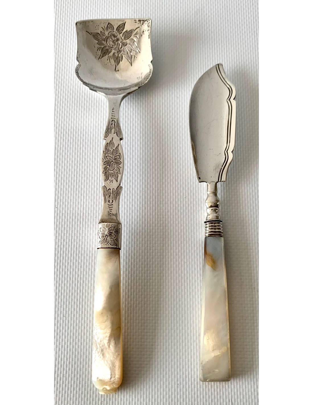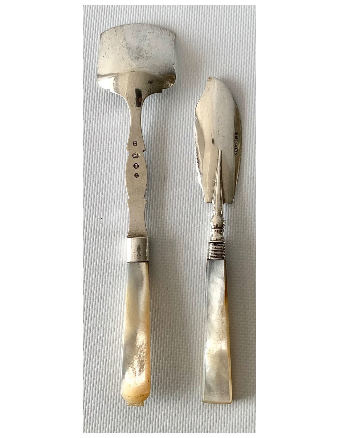 Pareja de cubiertos de plata de ley y nácar, finales del Siglo XIX, Inglaterra, Birmingham 1898