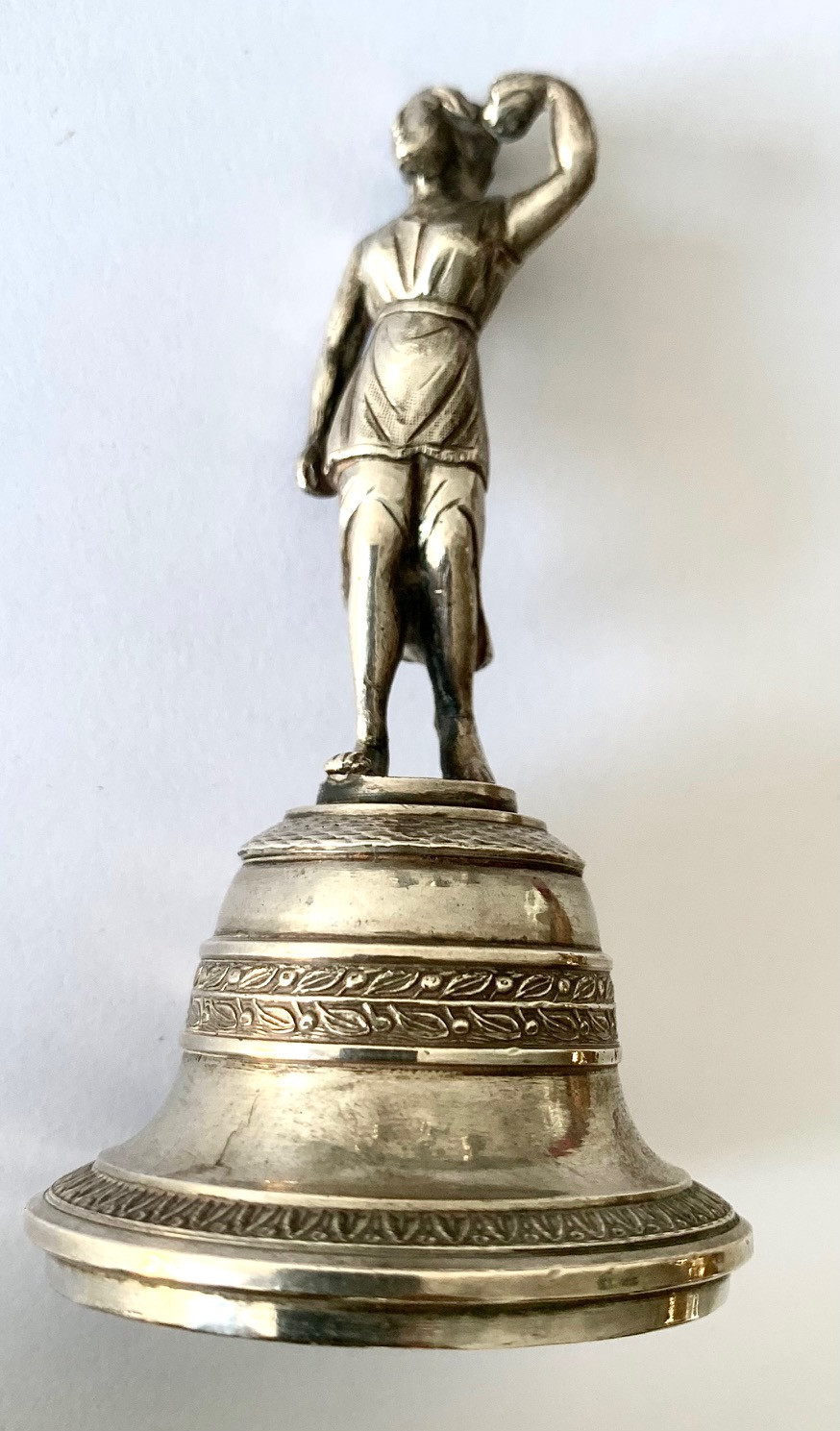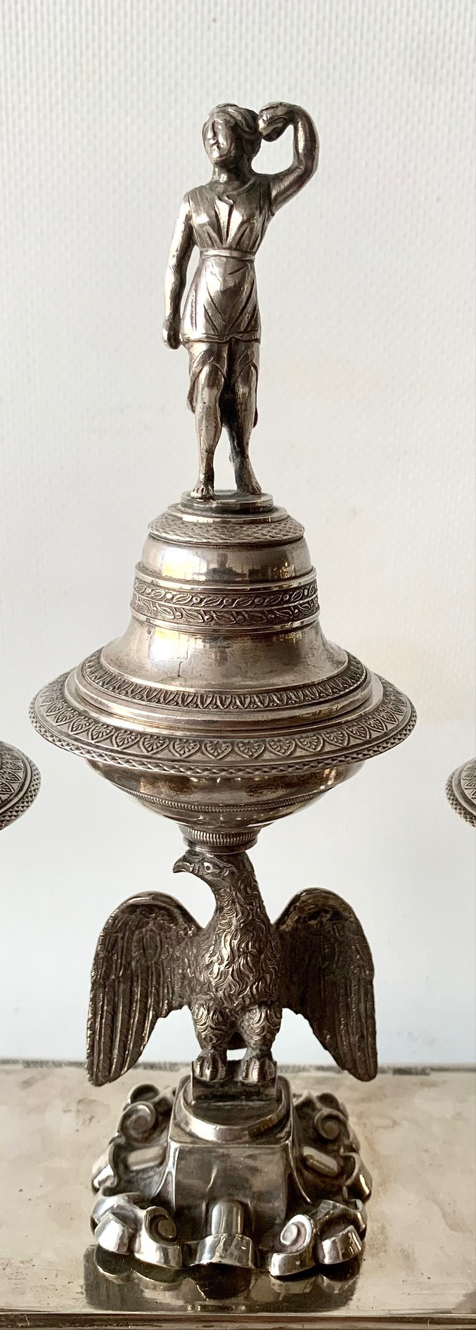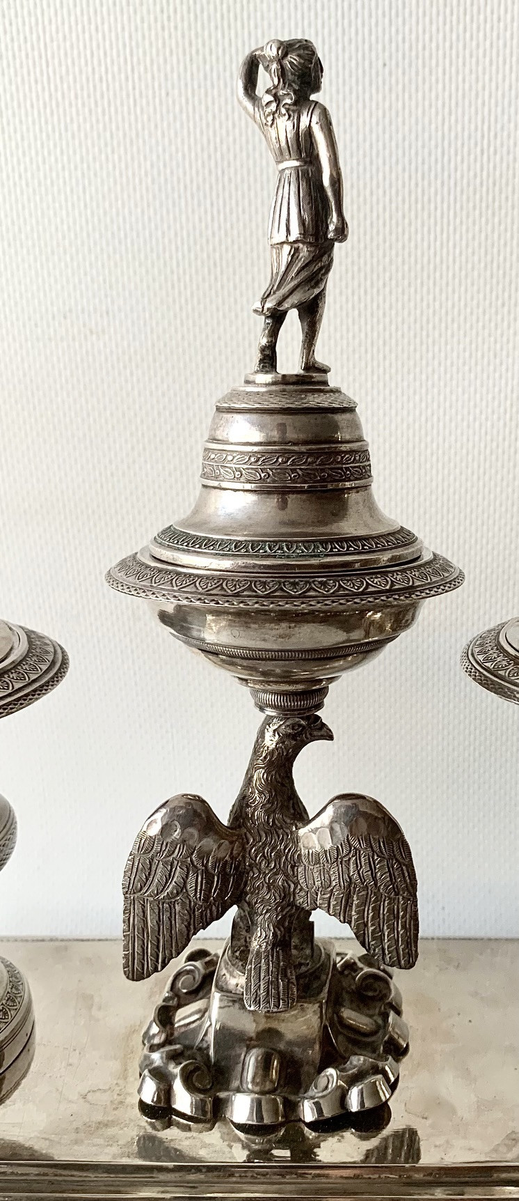 Campanilla central con mango en forma de figura femenina que descansa encima de un águila con alas abiertas. En cada lado, dos tinteros con tapas. Base rectangular soportada por cuatro patas. Todo el conjunto está abundantemente cincelado.