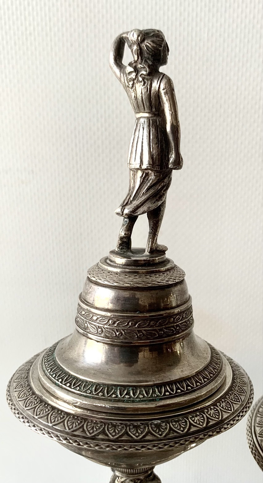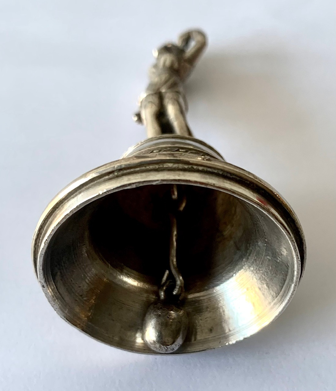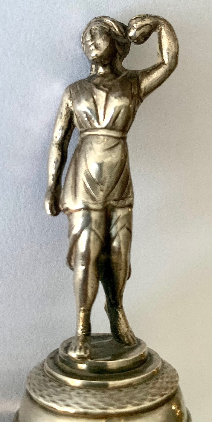 Campanilla central con mango en forma de figura femenina que descansa encima de un águila con alas abiertas. En cada lado, dos tinteros con tapas. Base rectangular soportada por cuatro patas. Todo el conjunto está abundantemente cincelado.