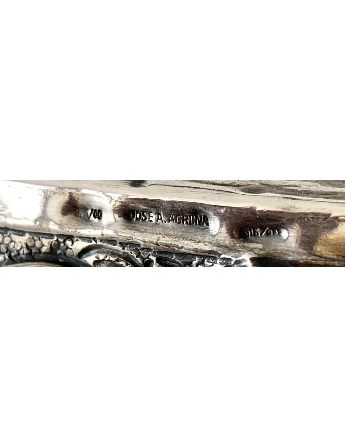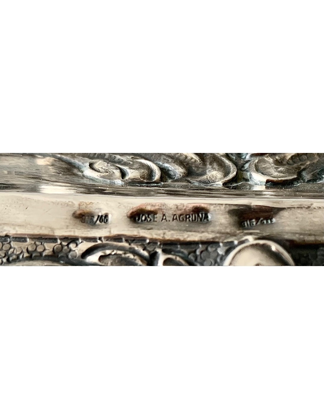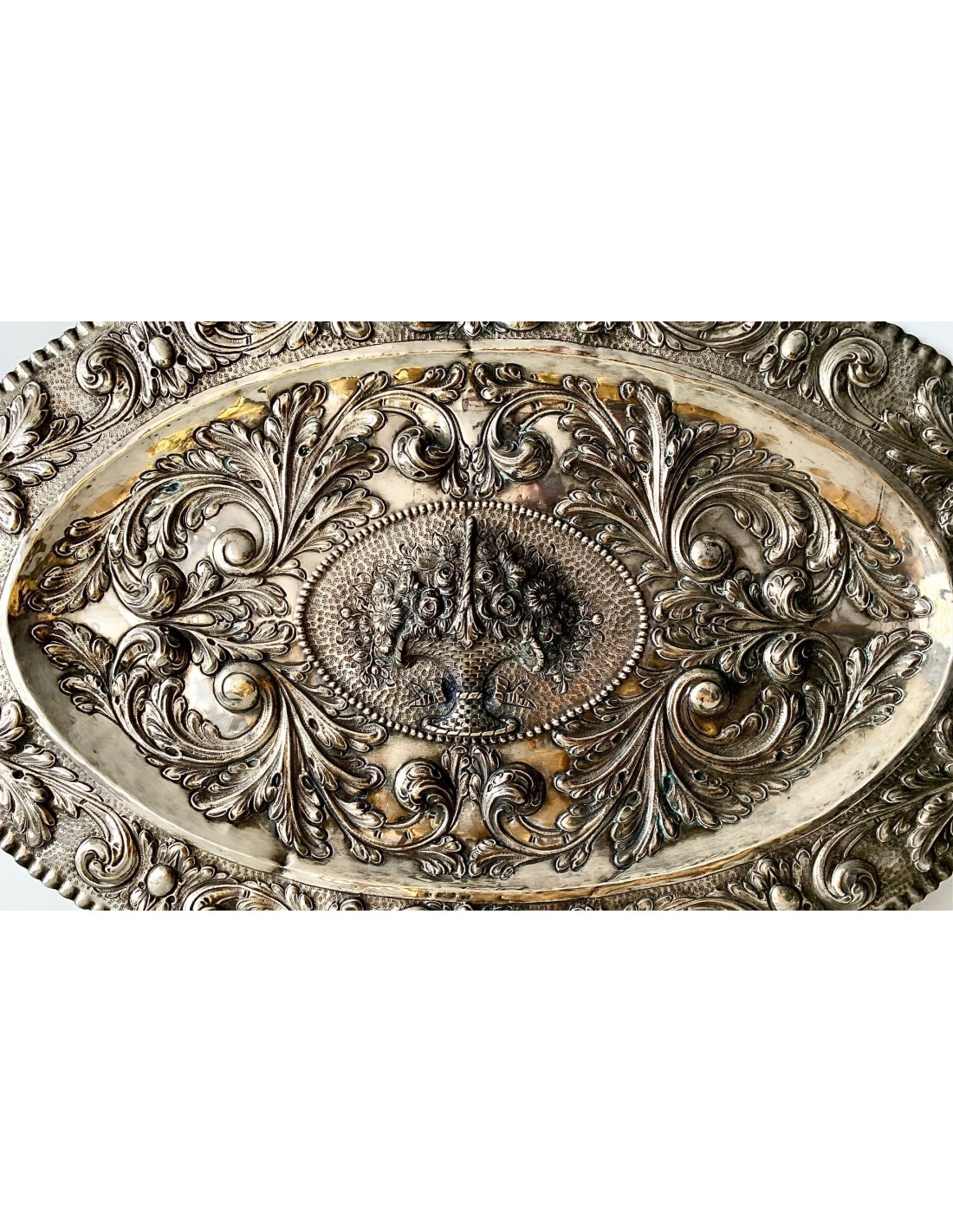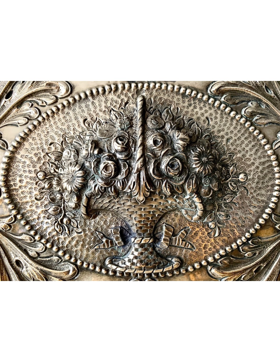 Grande bandeja de plata finemente repujada, del siglo XIX 1880-90 circa, del platero Jose Antonio Agruña, 815 milésimas de plata. Decoraciones divididas en tres secciones, la mas pequeña e interior con cesto de flores y fondo cincelado con pequeños círculos, la segunda e intermedia con decoraciones de hojas y fondo liso, la tercera y mas externa siempre con decoraciones de hojas y fondo cincelado (como la mas pequeña) con pequeños círculos.
