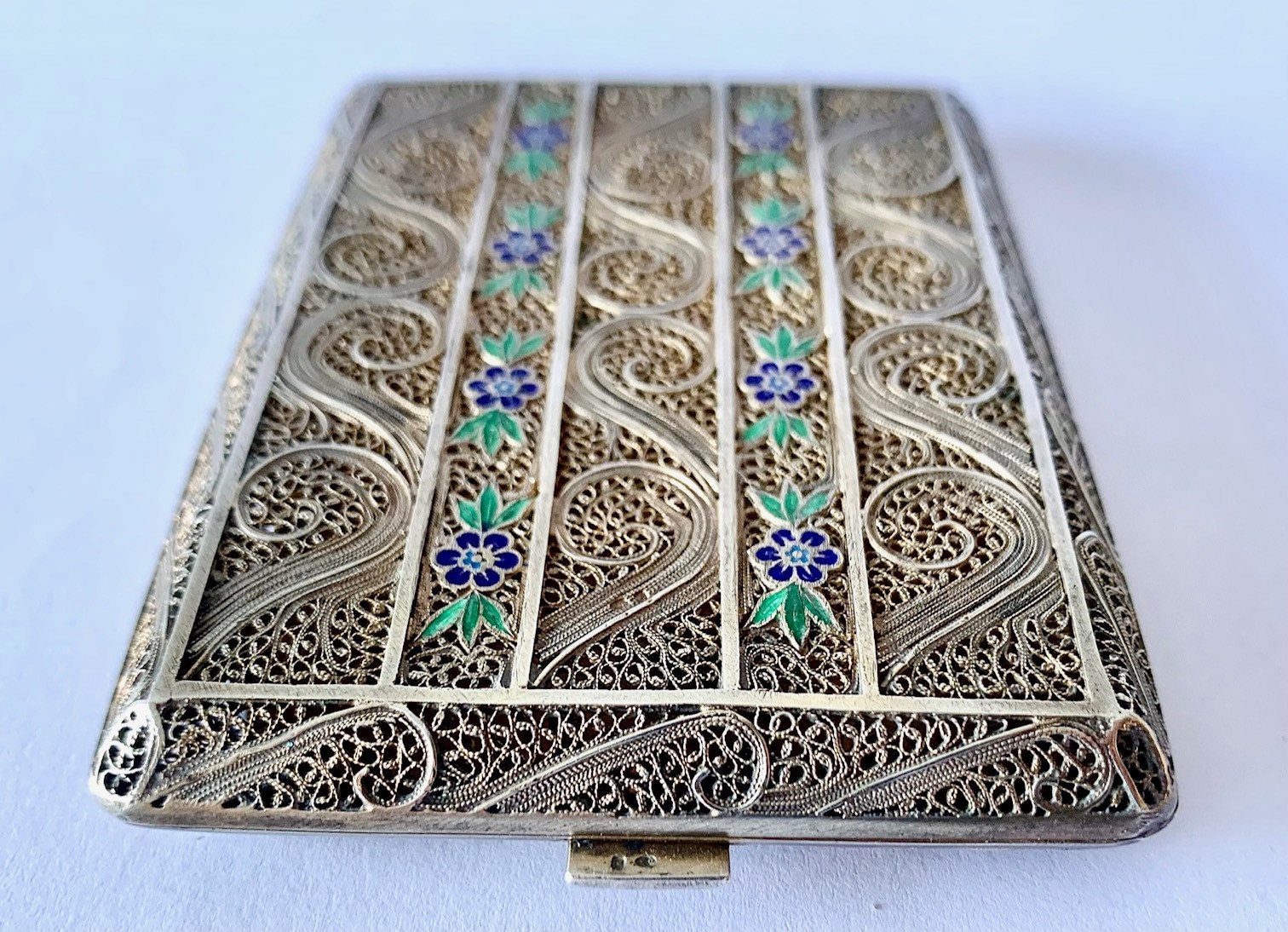 Pitillera hecha en filigrana de plata con decoración de cenefas y esmaltada en azul y verde decoración de flores y hojas. Plata contrastada. Trabajo portugués de principios del Siglo XX.
