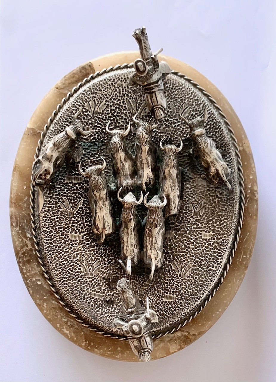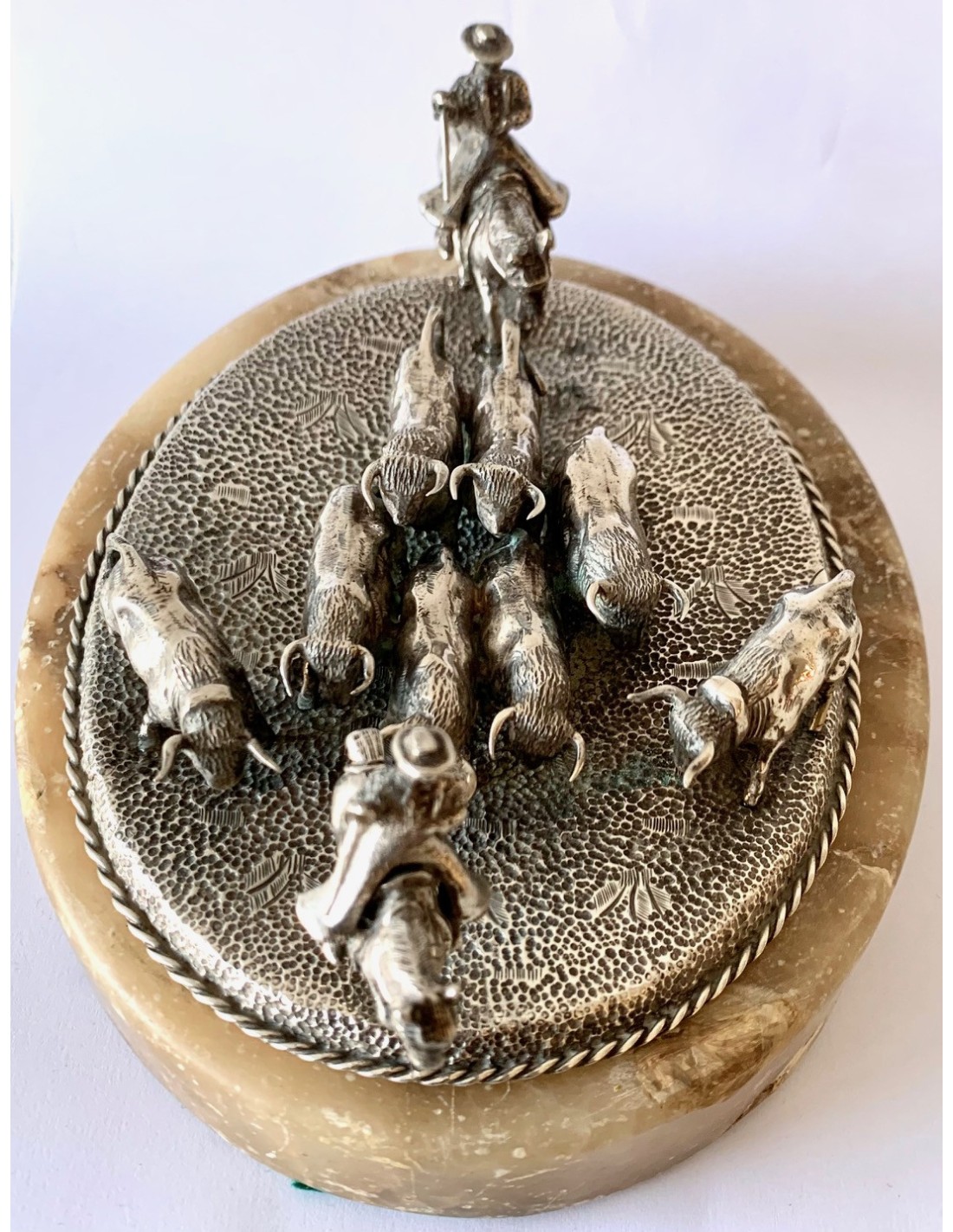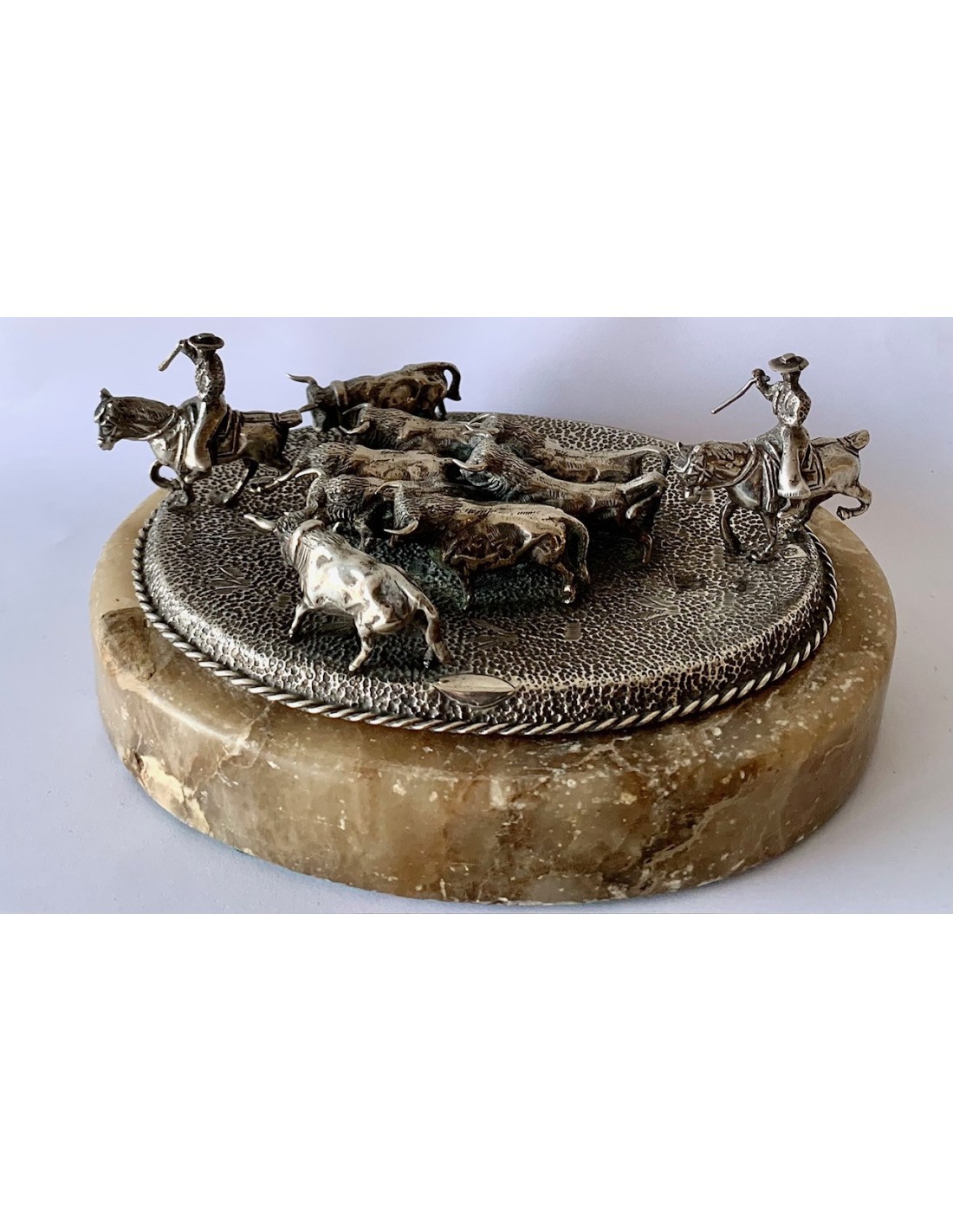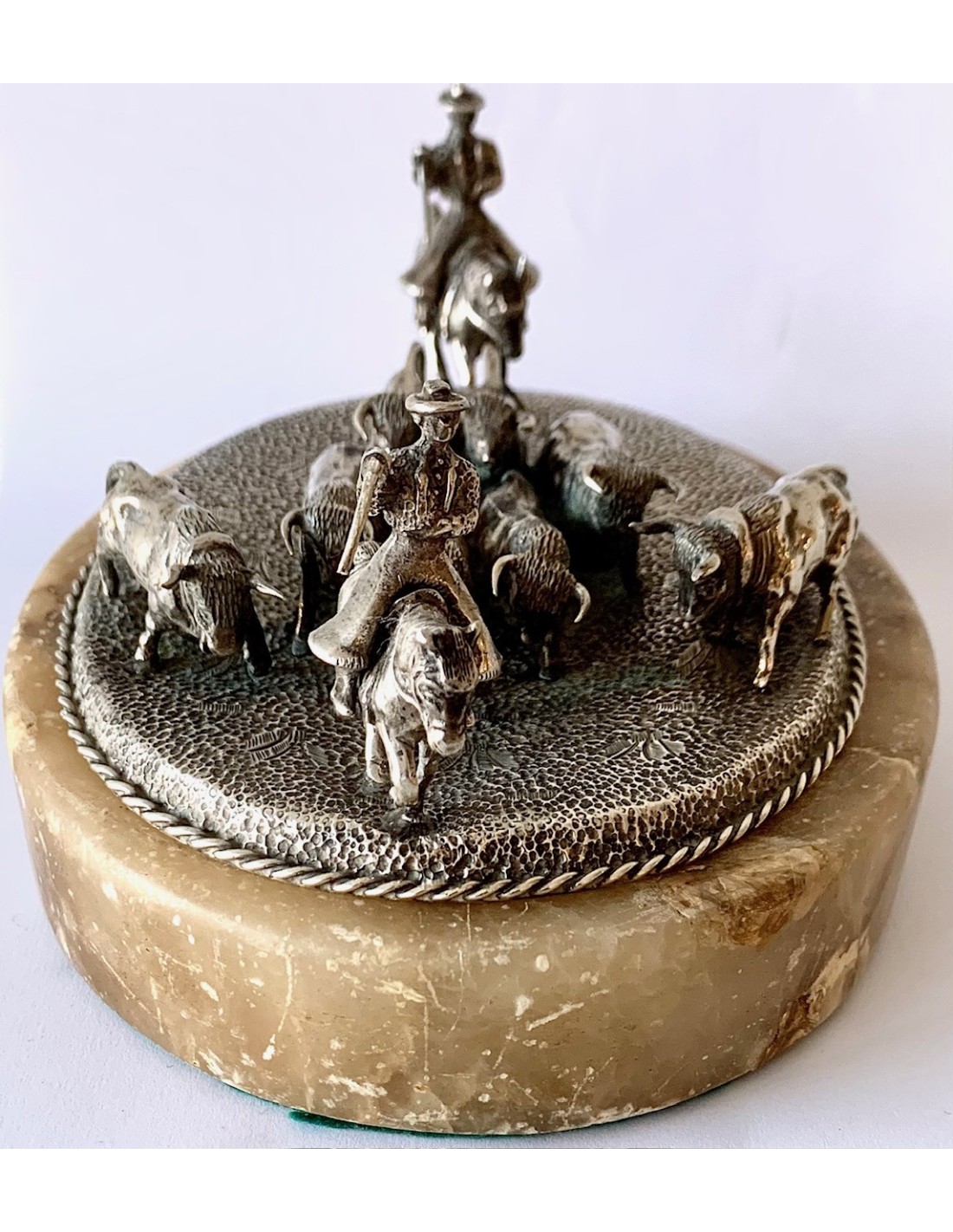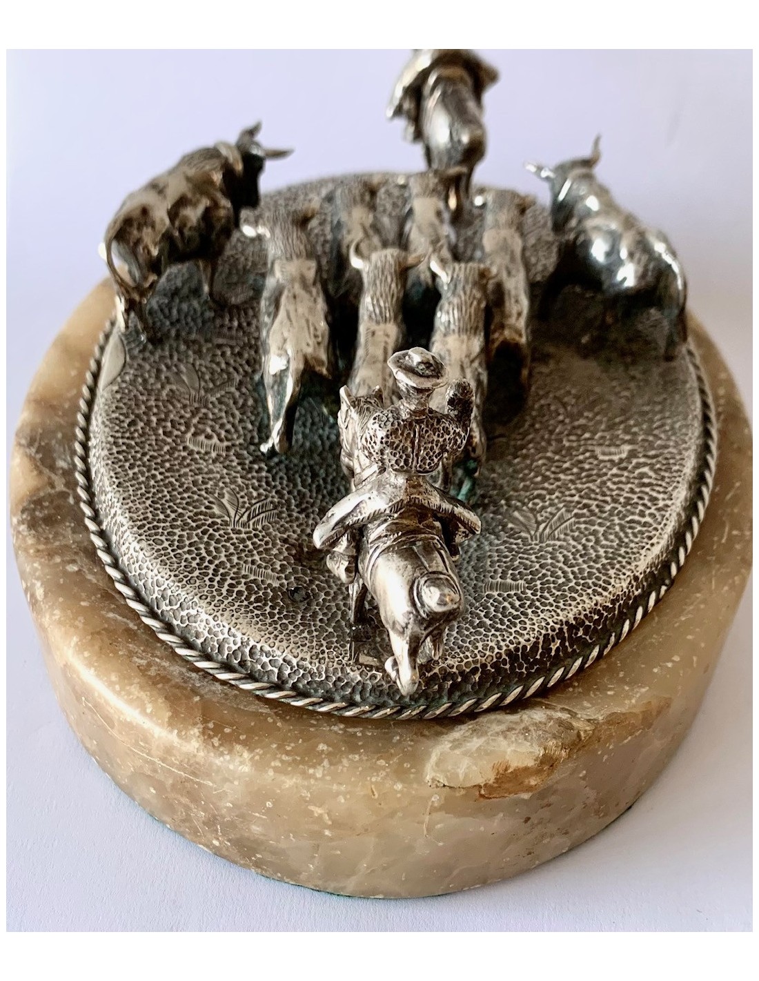 Escena de pastoreo taurino, conjunto de plata y base de alabastro. Primera mitad del Siglo XX.