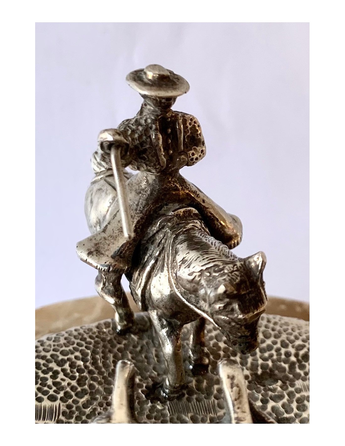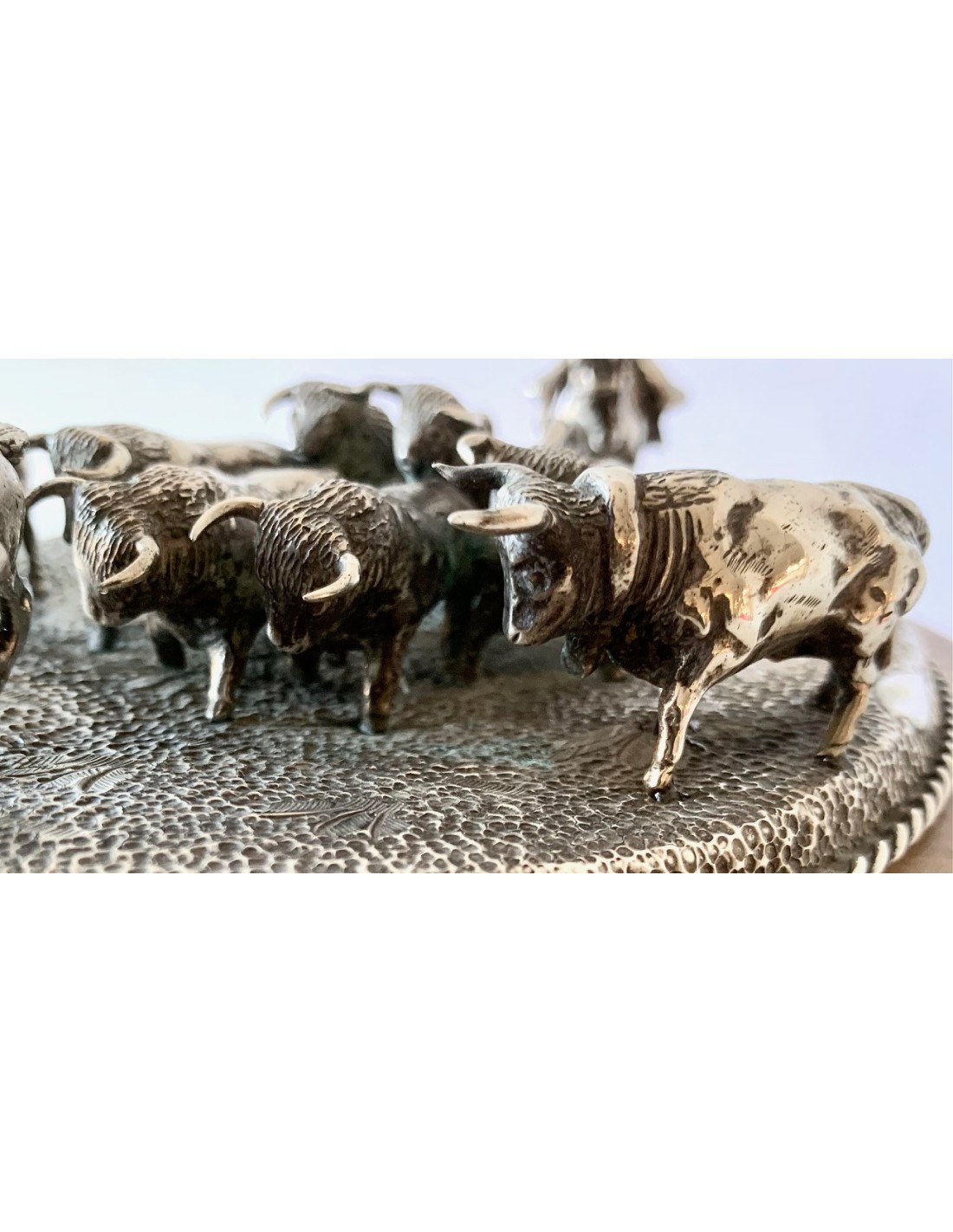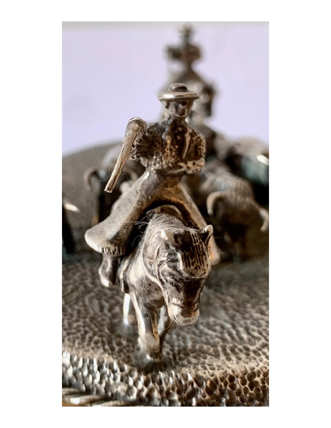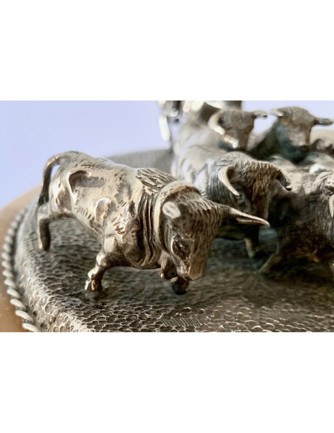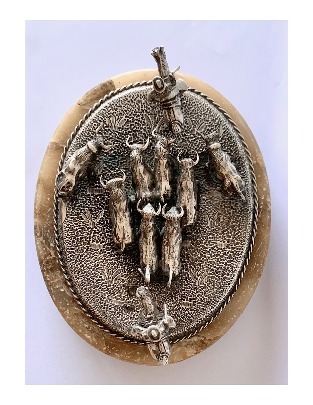 Escena de pastoreo taurino, conjunto de plata y base de alabastro. Primera mitad del Siglo XX.