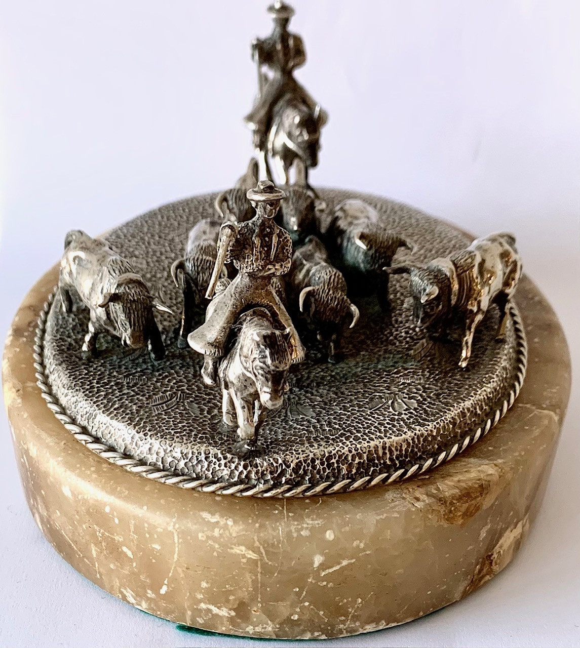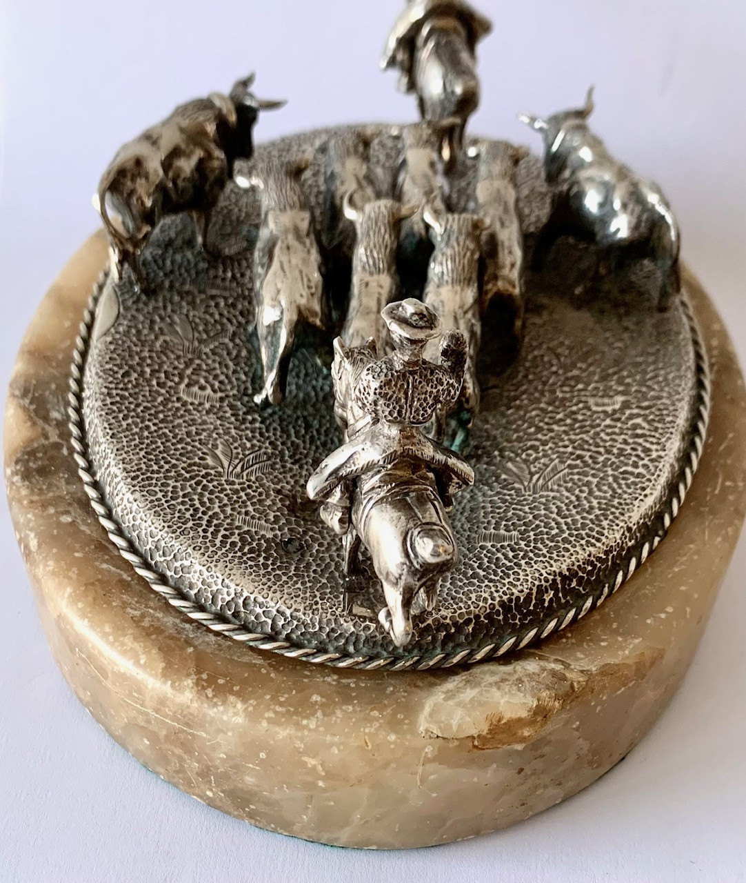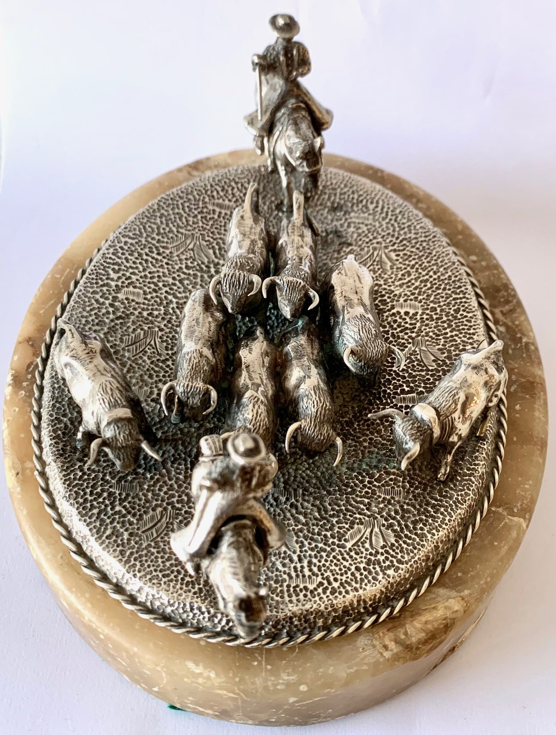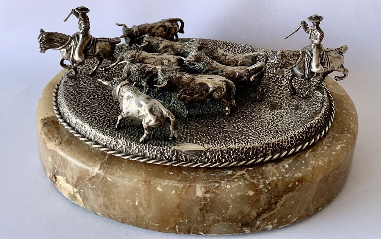 Escena campera con ocho figuras de toros y dos jinetes a caballo. Plata de ley con contrastes visibles en la base. Todo sobre una peana de alabastro.