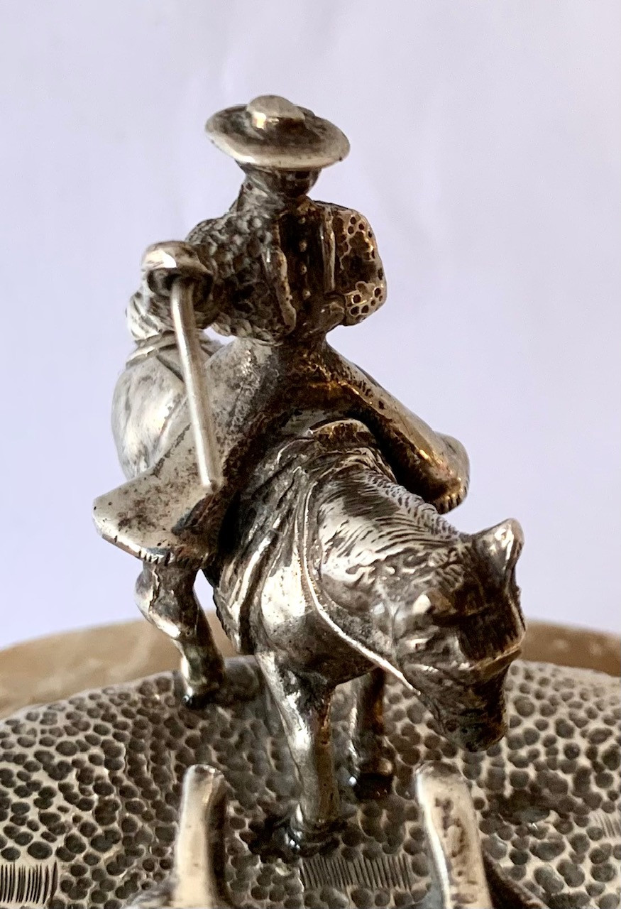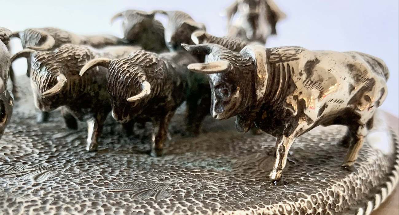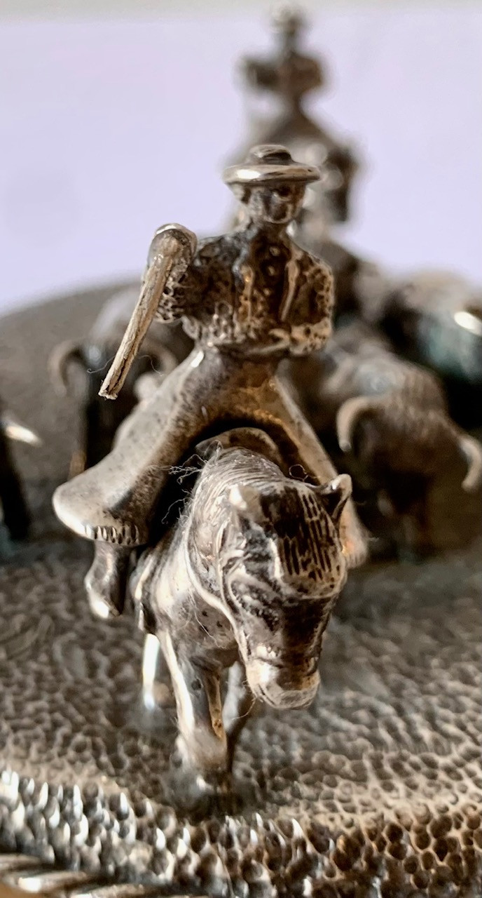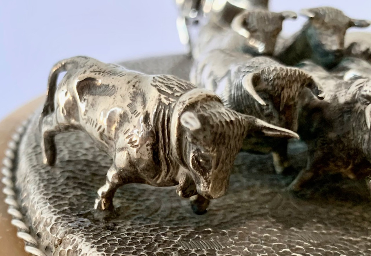 Escena campera con ocho figuras de toros y dos jinetes a caballo. Plata de ley con contrastes visibles en la base. Todo sobre una peana de alabastro.