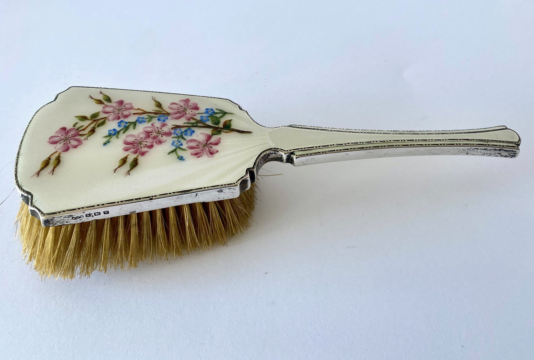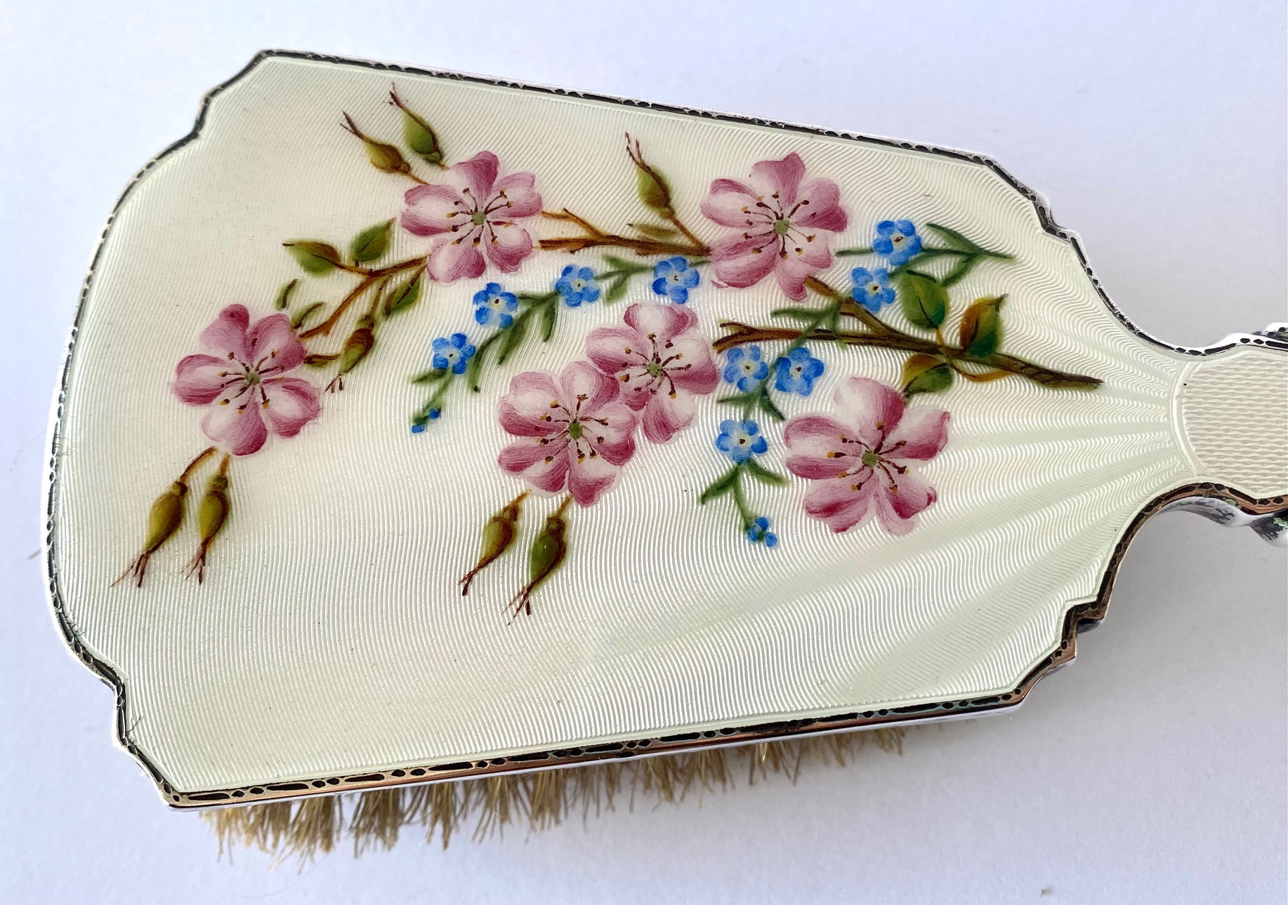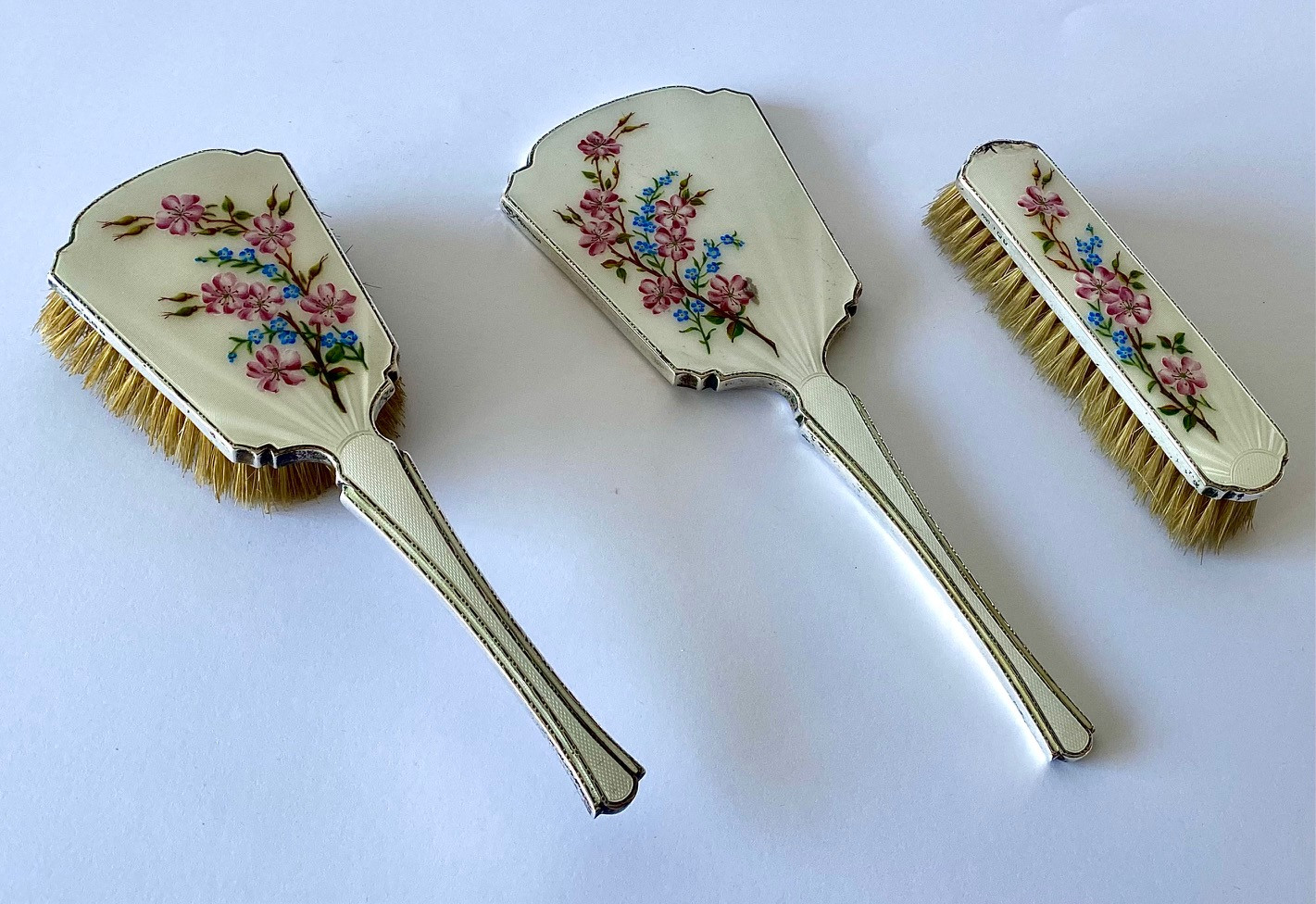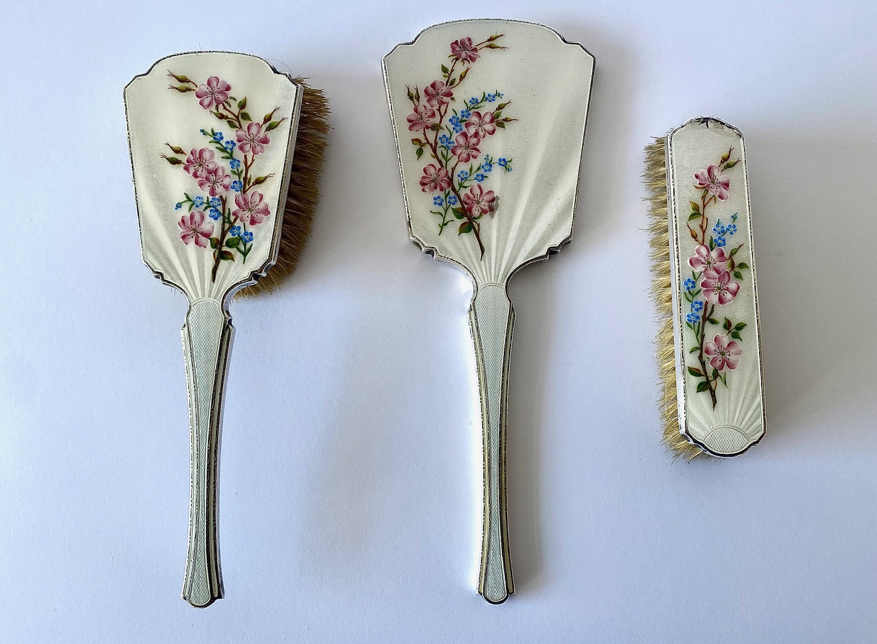 Conjunto de toilette de tres piezas de tocador, compuesto por dos cepillos y espejo de mano. Plata de ley inglesa contrastada y en la parte superior esmalte con decoración floral. Muy buen estado de conservación con algún leve pelo.