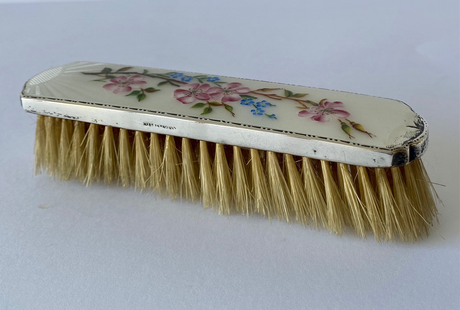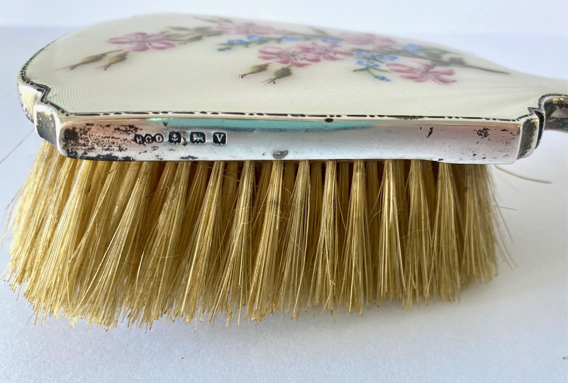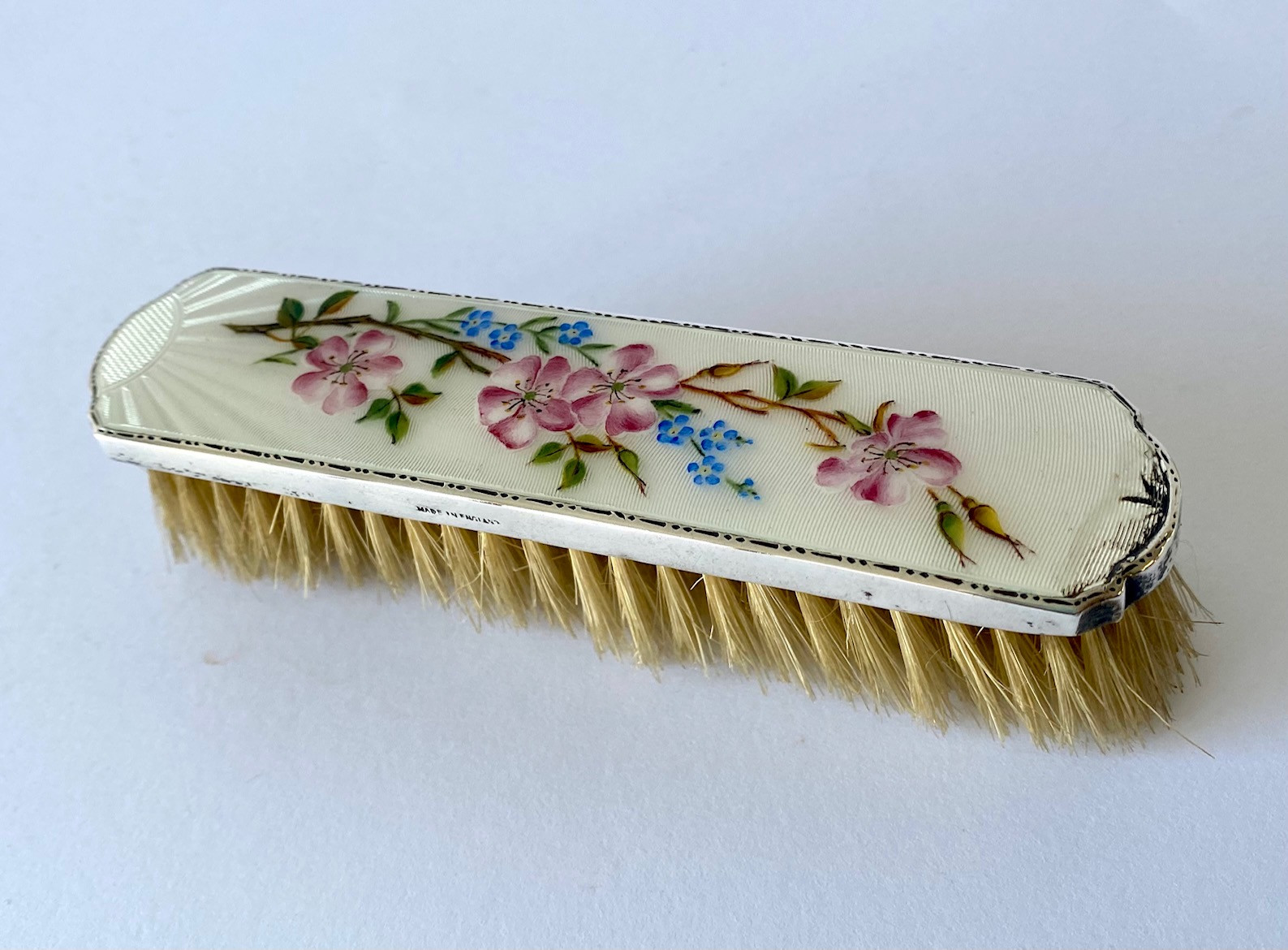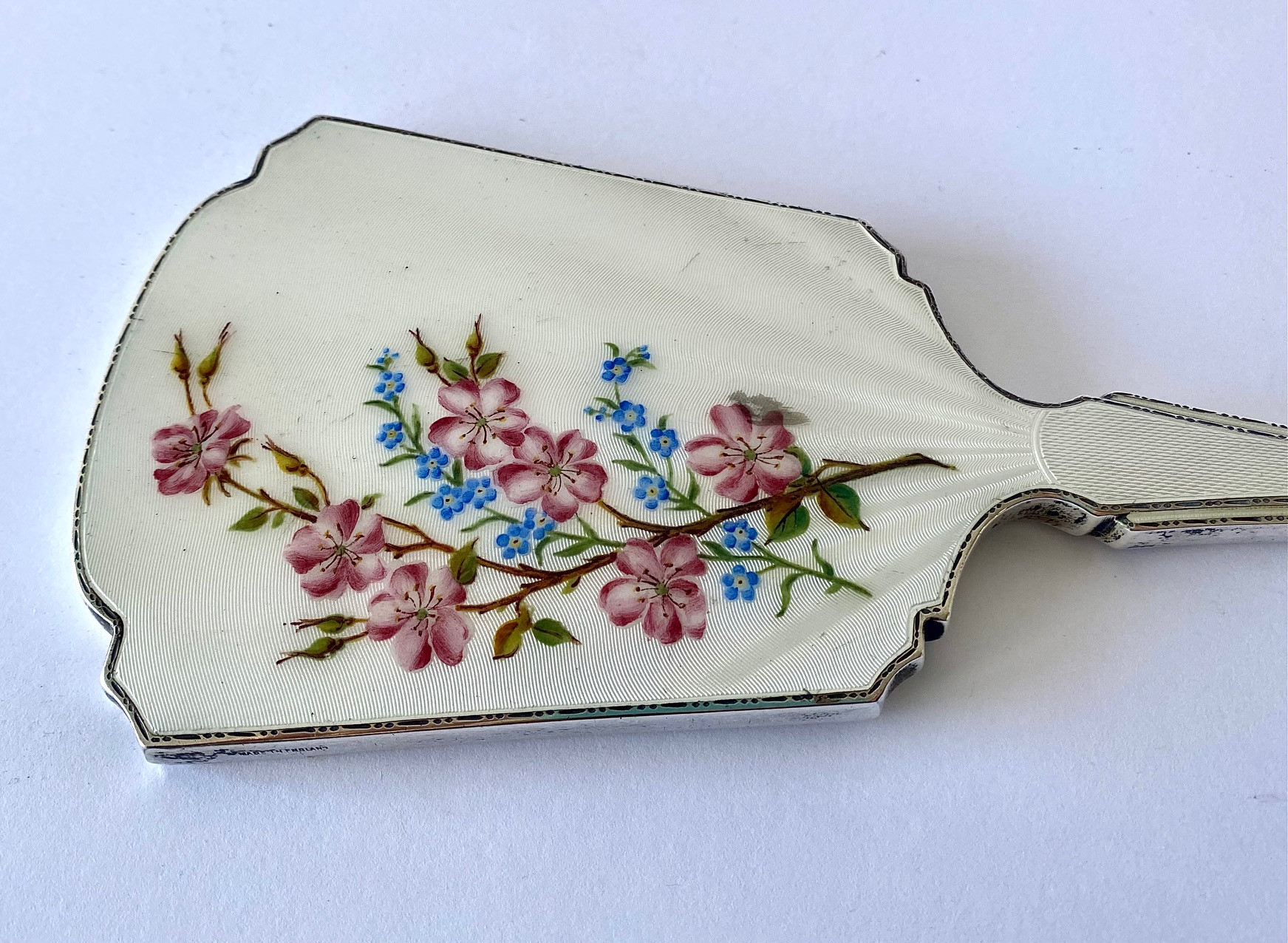 Conjunto de toilette de tres piezas de tocador, compuesto por dos cepillos y espejo de mano. Plata de ley inglesa contrastada y en la parte superior esmalte con decoración floral. Muy buen estado de conservación con algún leve pelo.