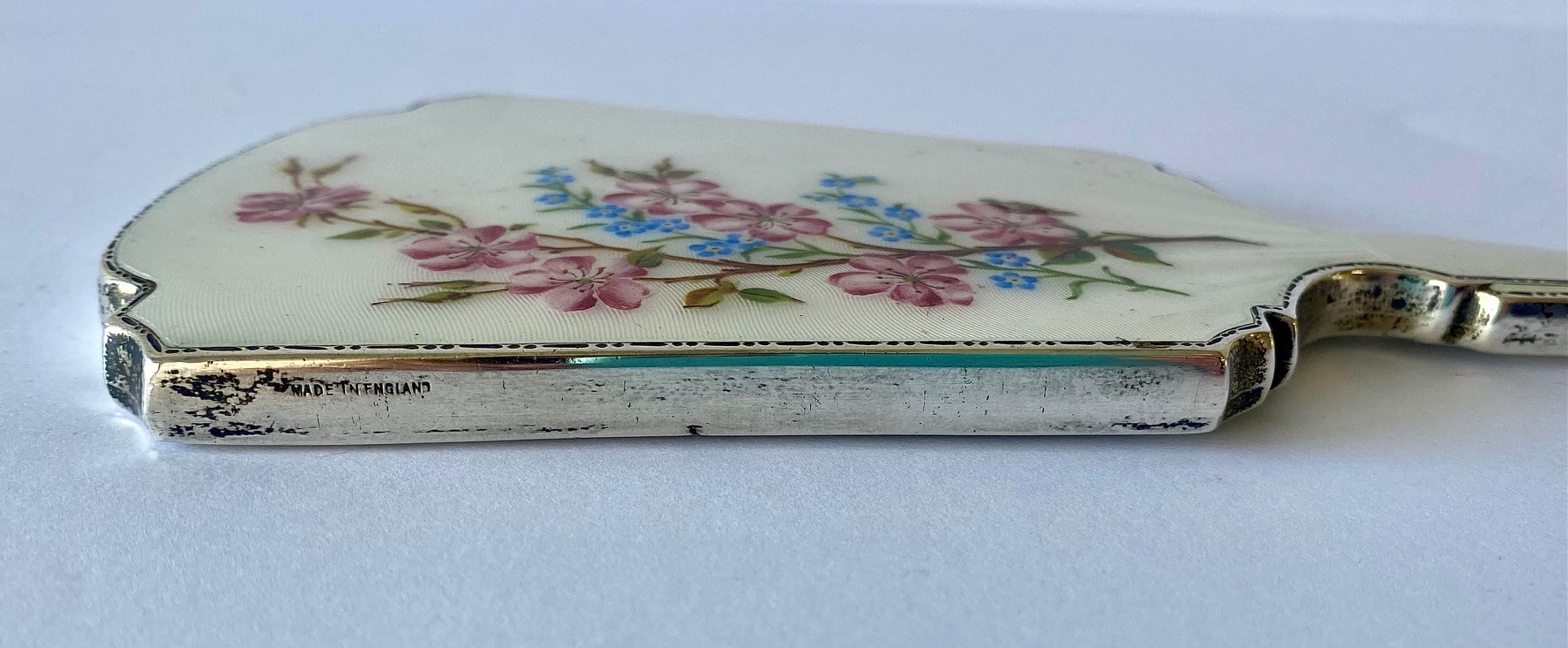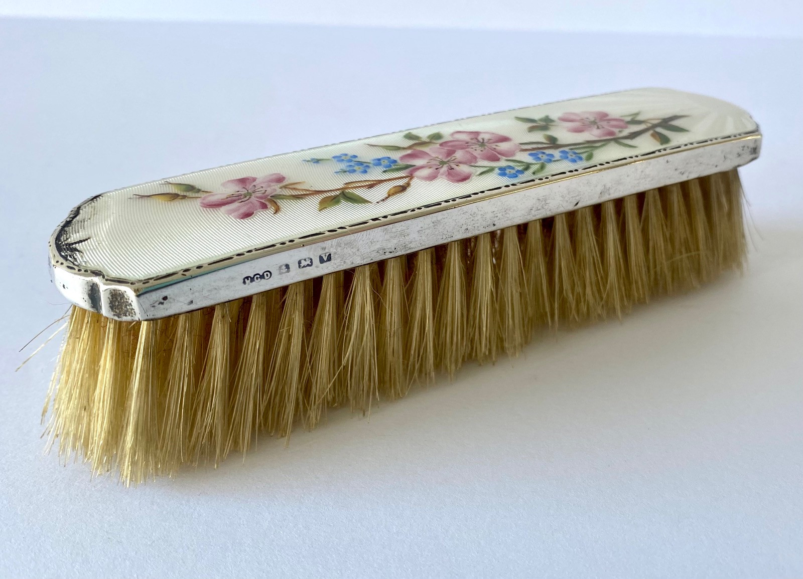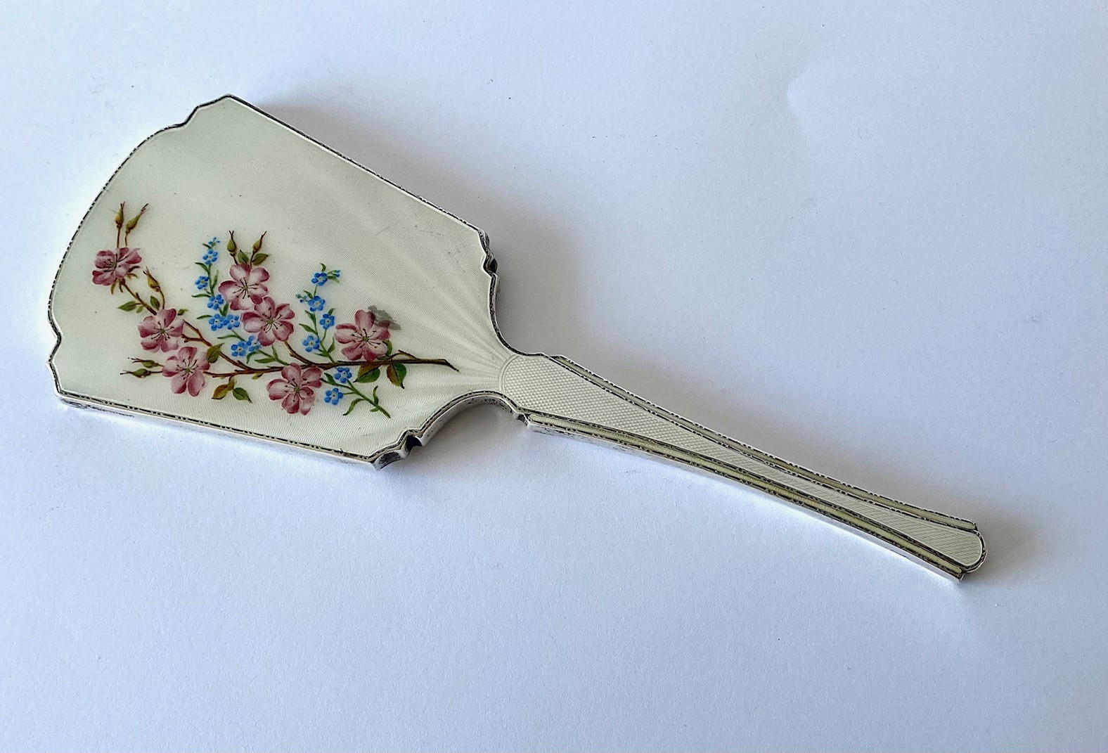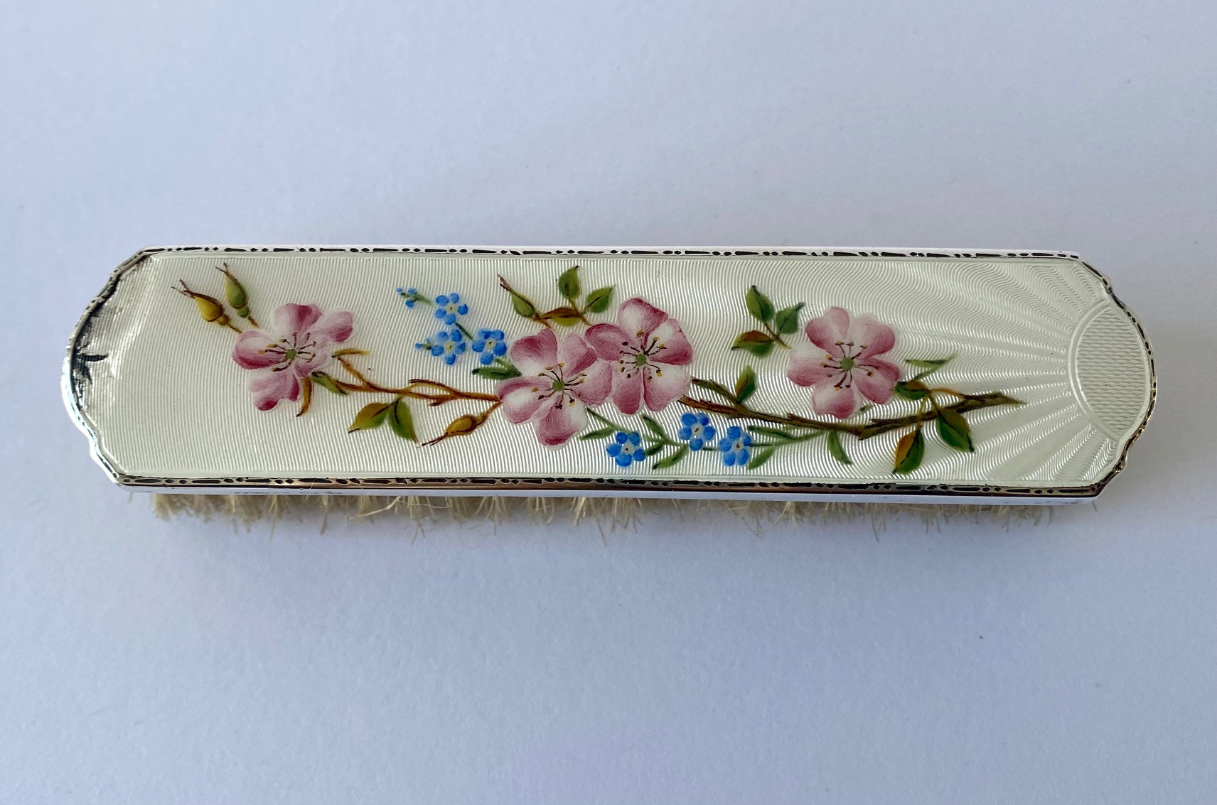 Conjunto de toilette de tres piezas de tocador, compuesto por dos cepillos y espejo de mano. Plata de ley inglesa contrastada y en la parte superior esmalte con decoración floral. Muy buen estado de conservación con algún leve pelo.