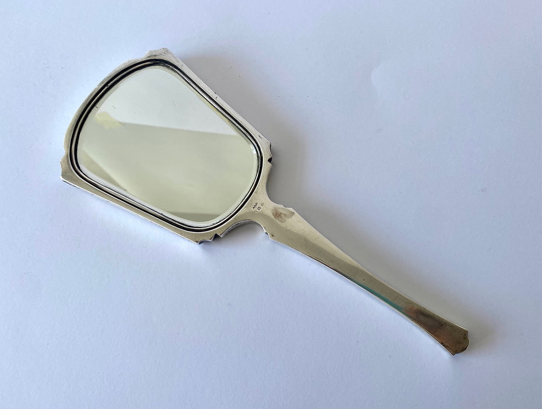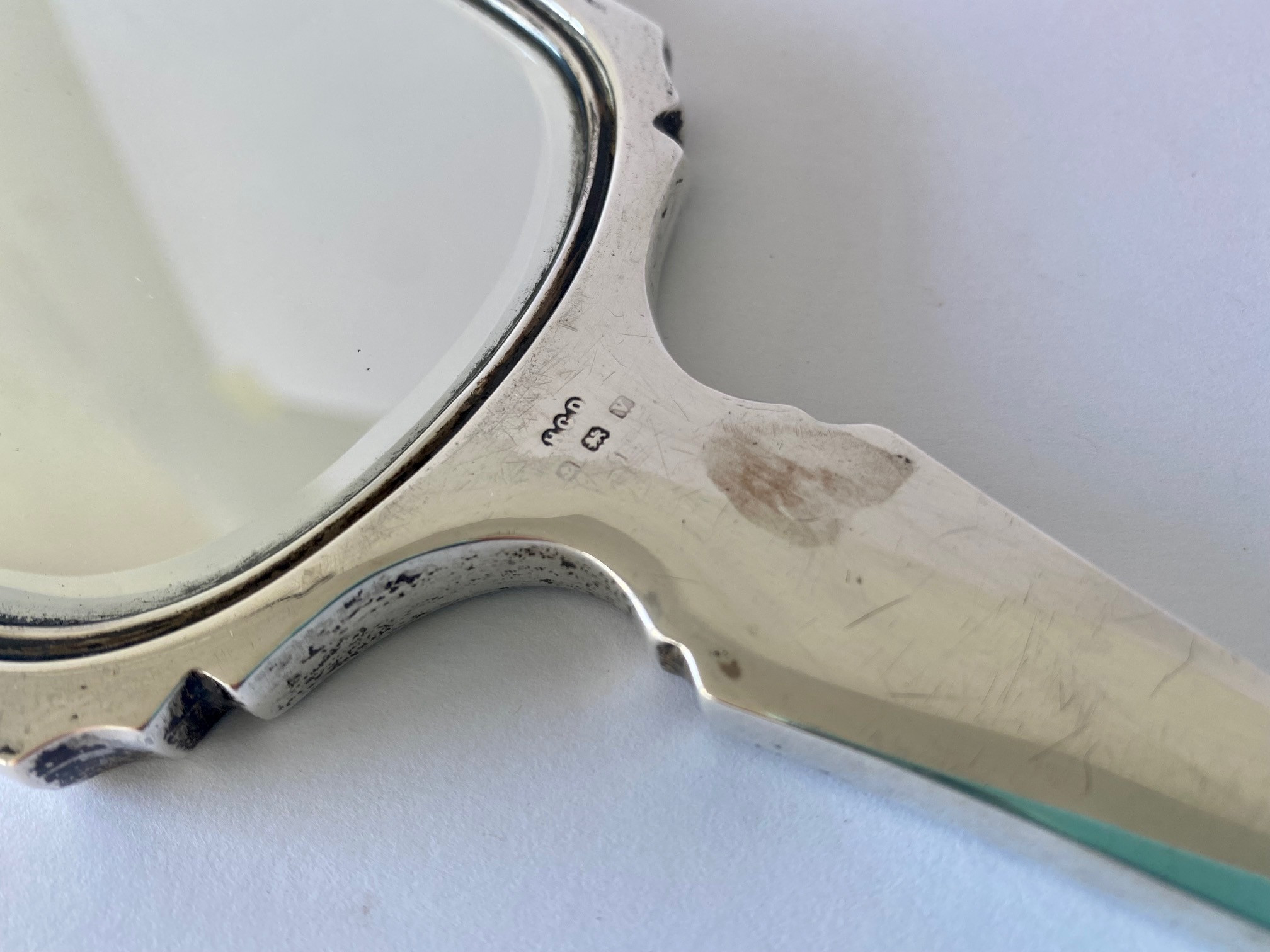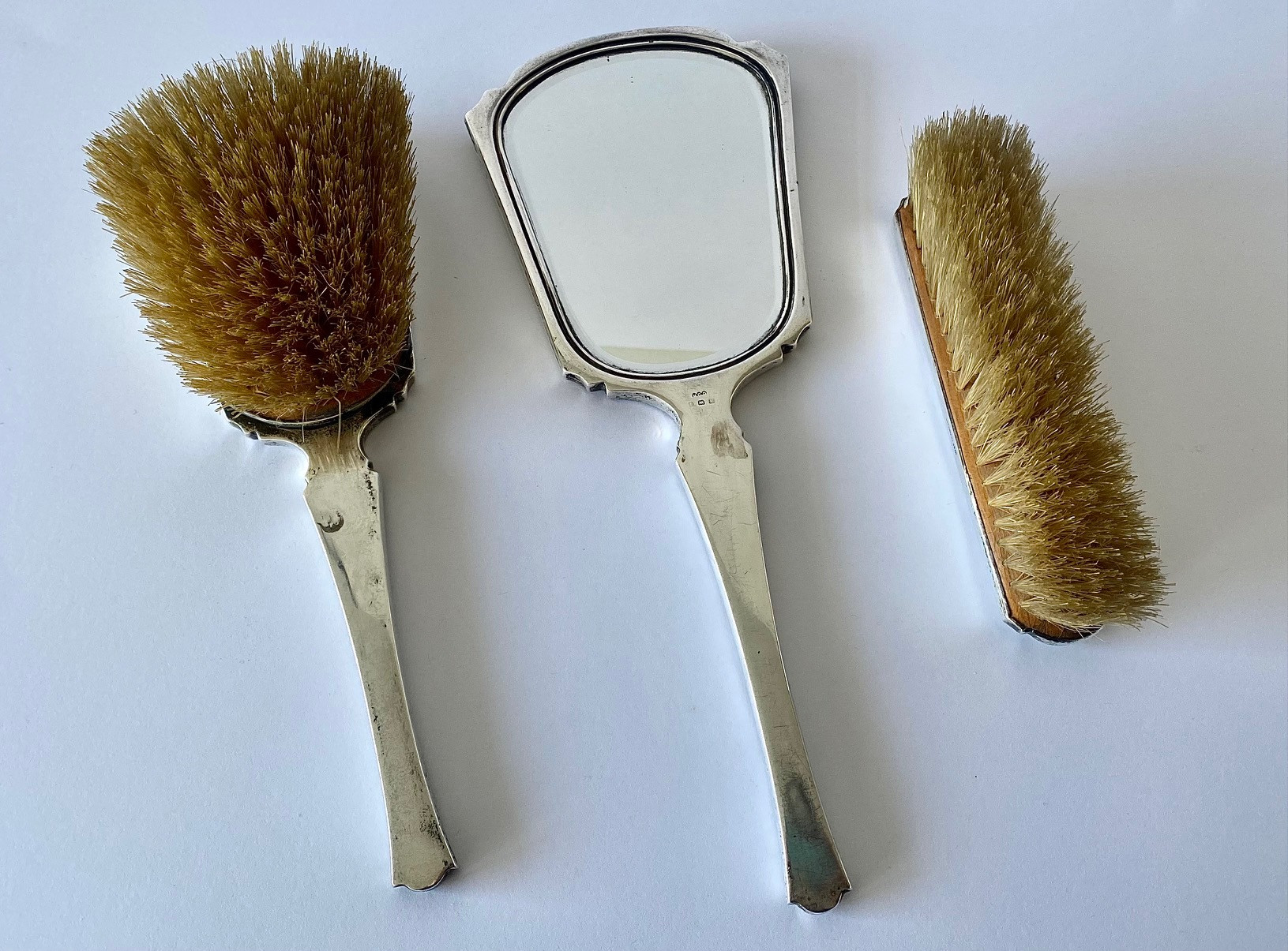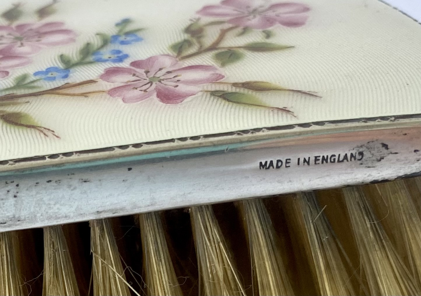 Conjunto de toilette de tres piezas de tocador, compuesto por dos cepillos y espejo de mano. Plata de ley inglesa contrastada y en la parte superior esmalte con decoración floral. Muy buen estado de conservación con algún leve pelo.