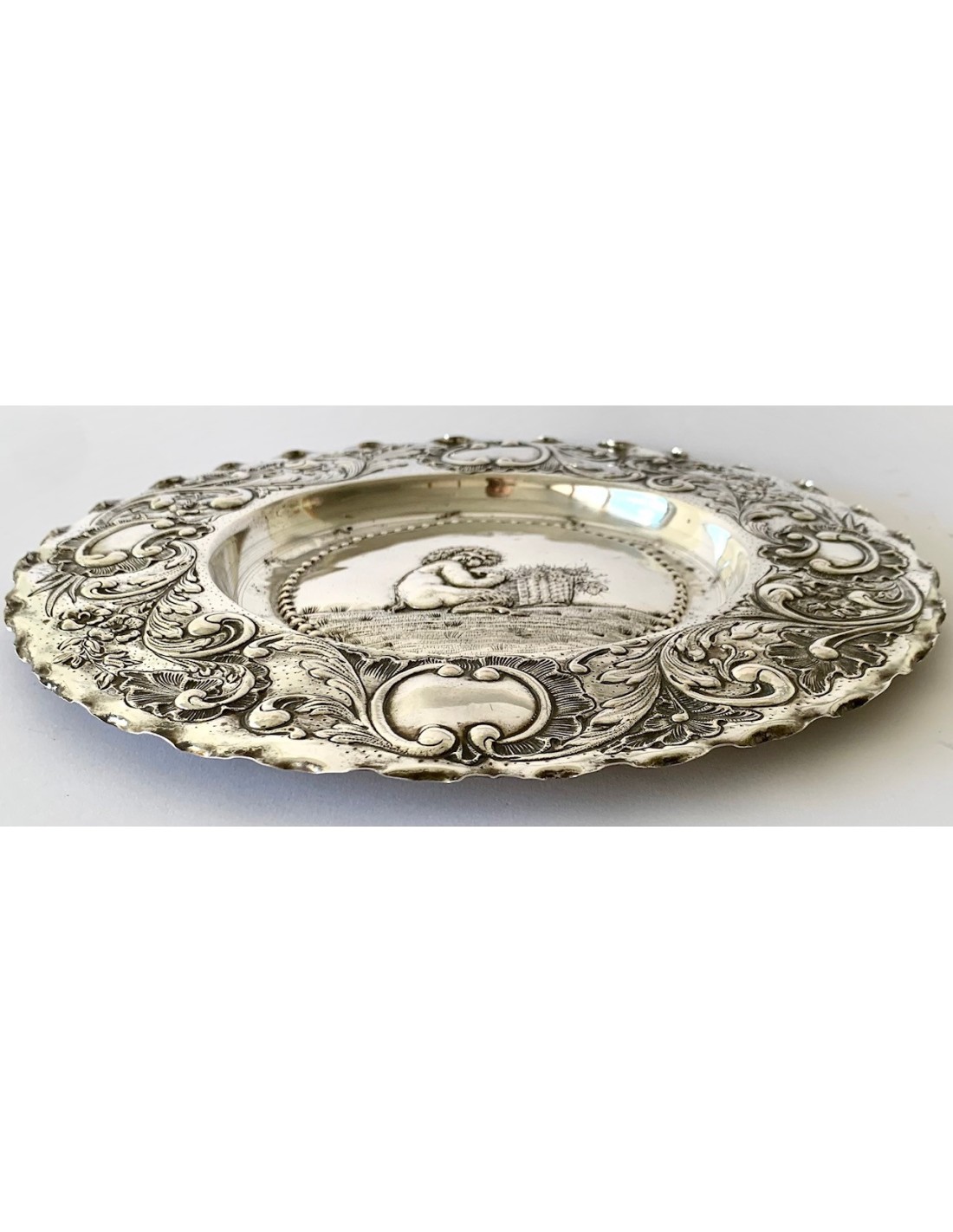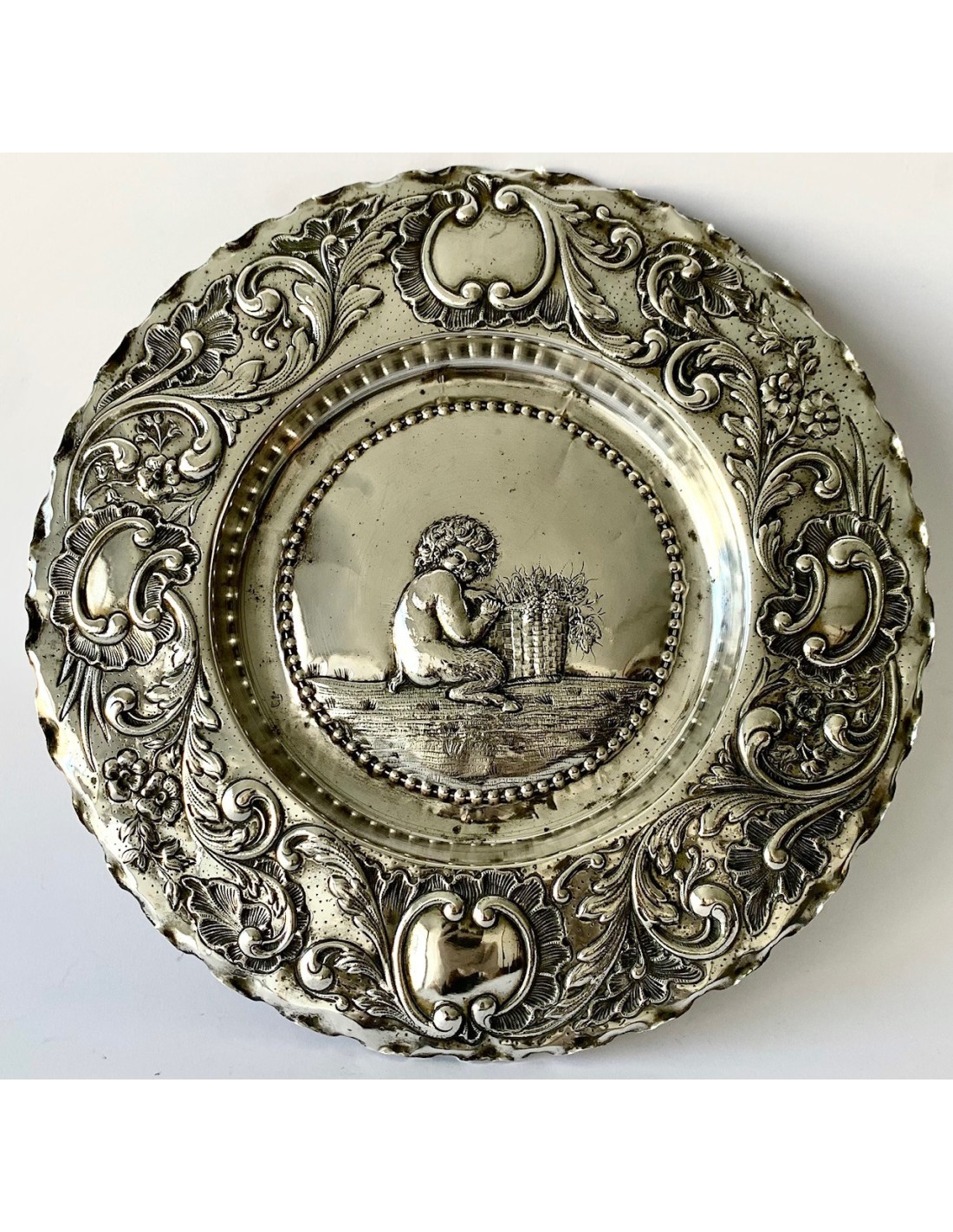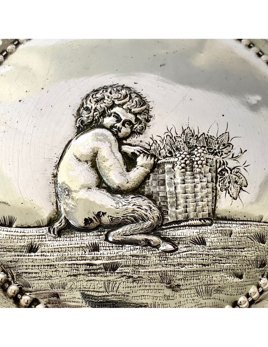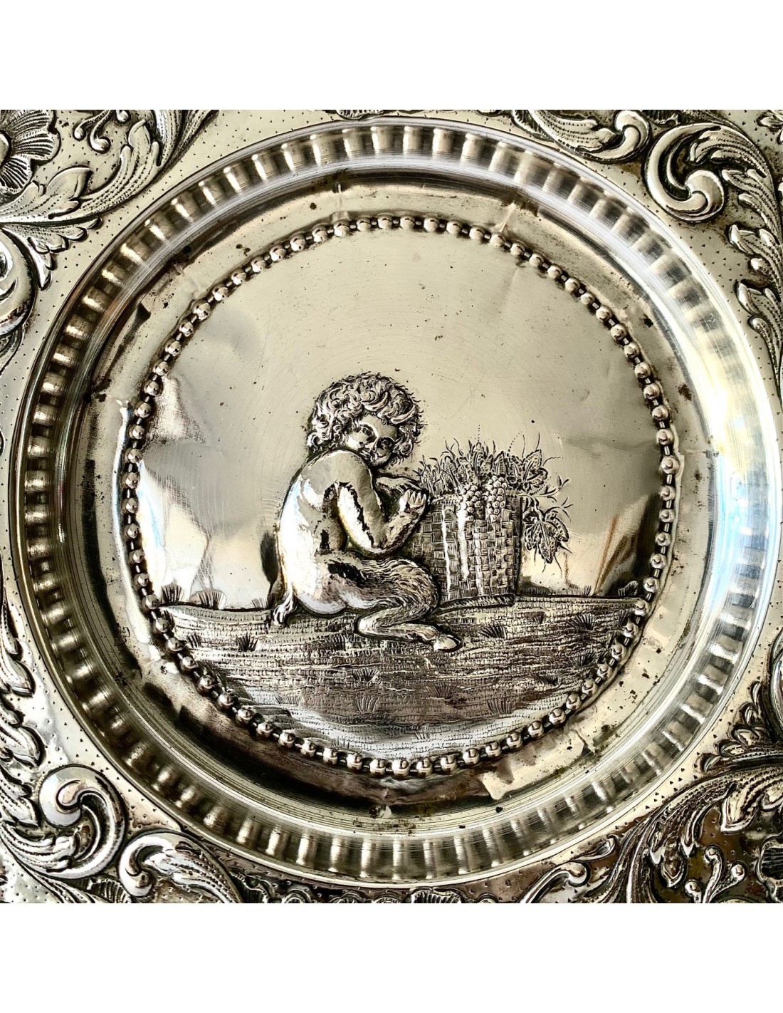 Bandeja de plata de ley cincelada, muy probablemente alemana del siglo XIX, escena central con fauno y cesta de uva, faja perimetral con decoraciones florales. Contraste visible en el margen inferior no identificado.