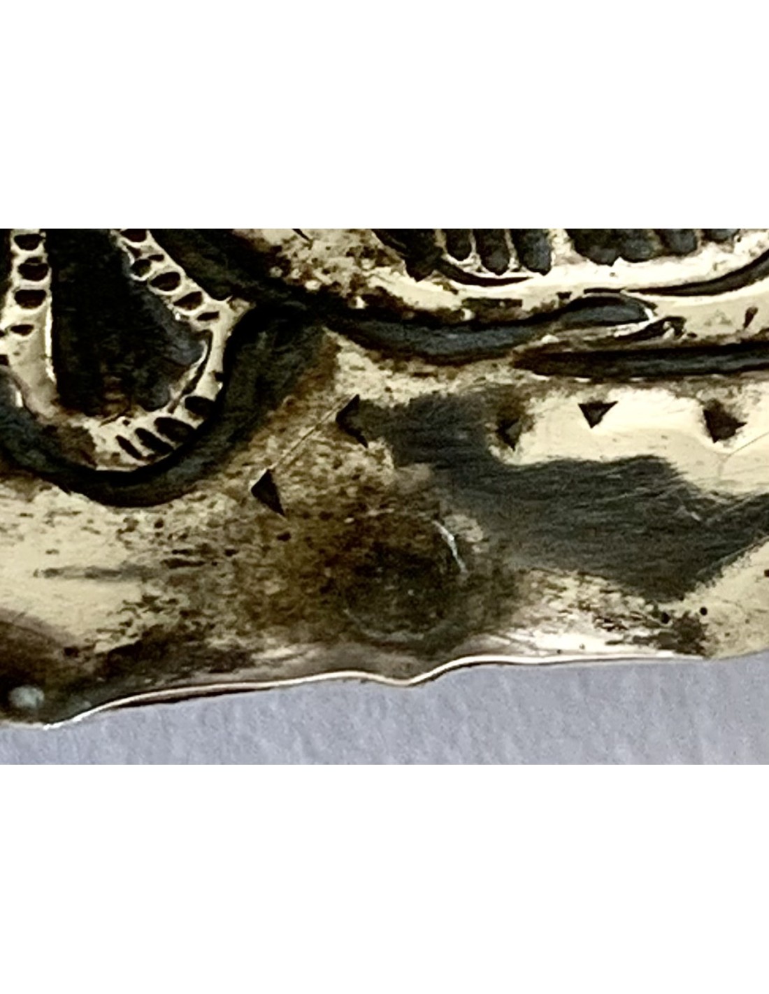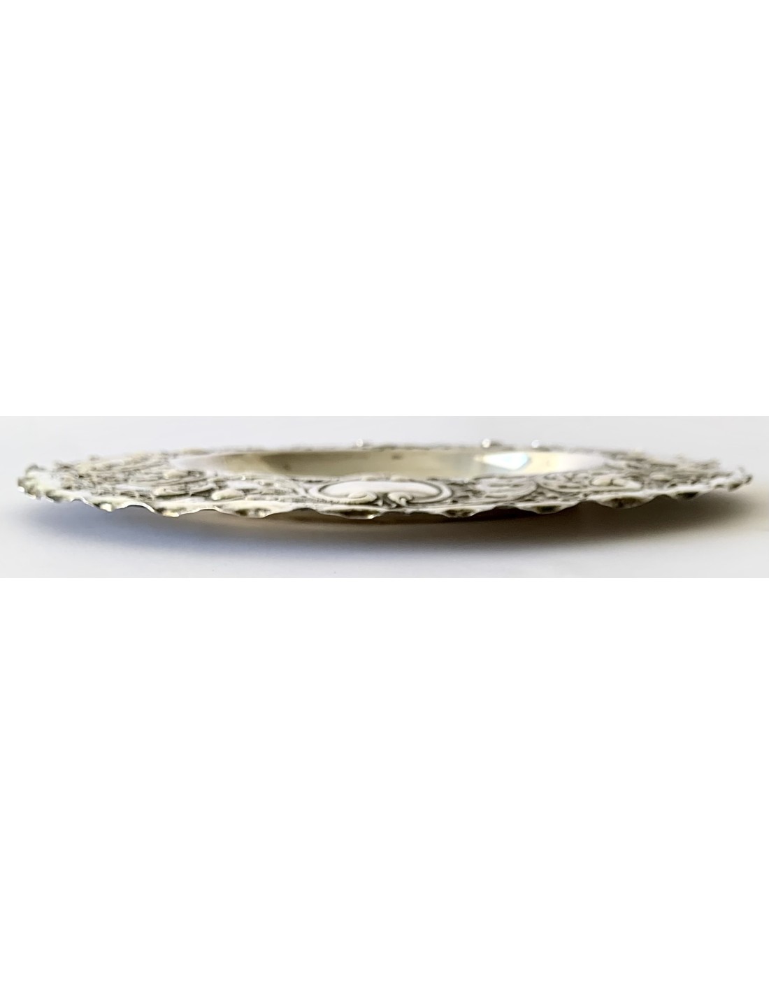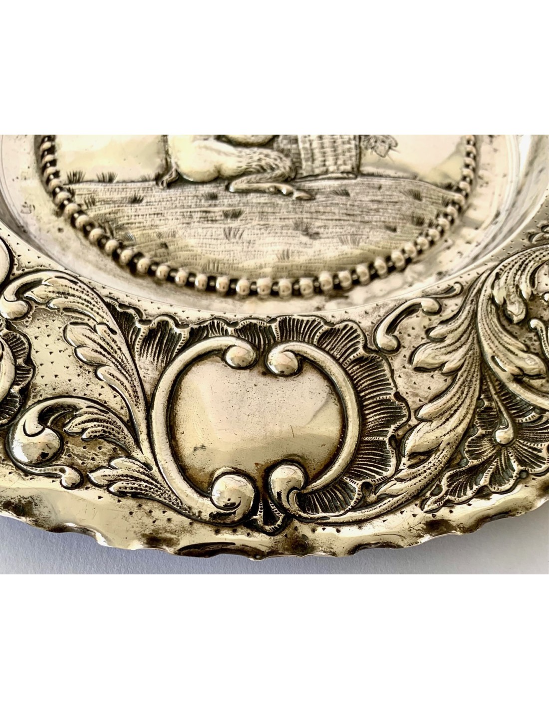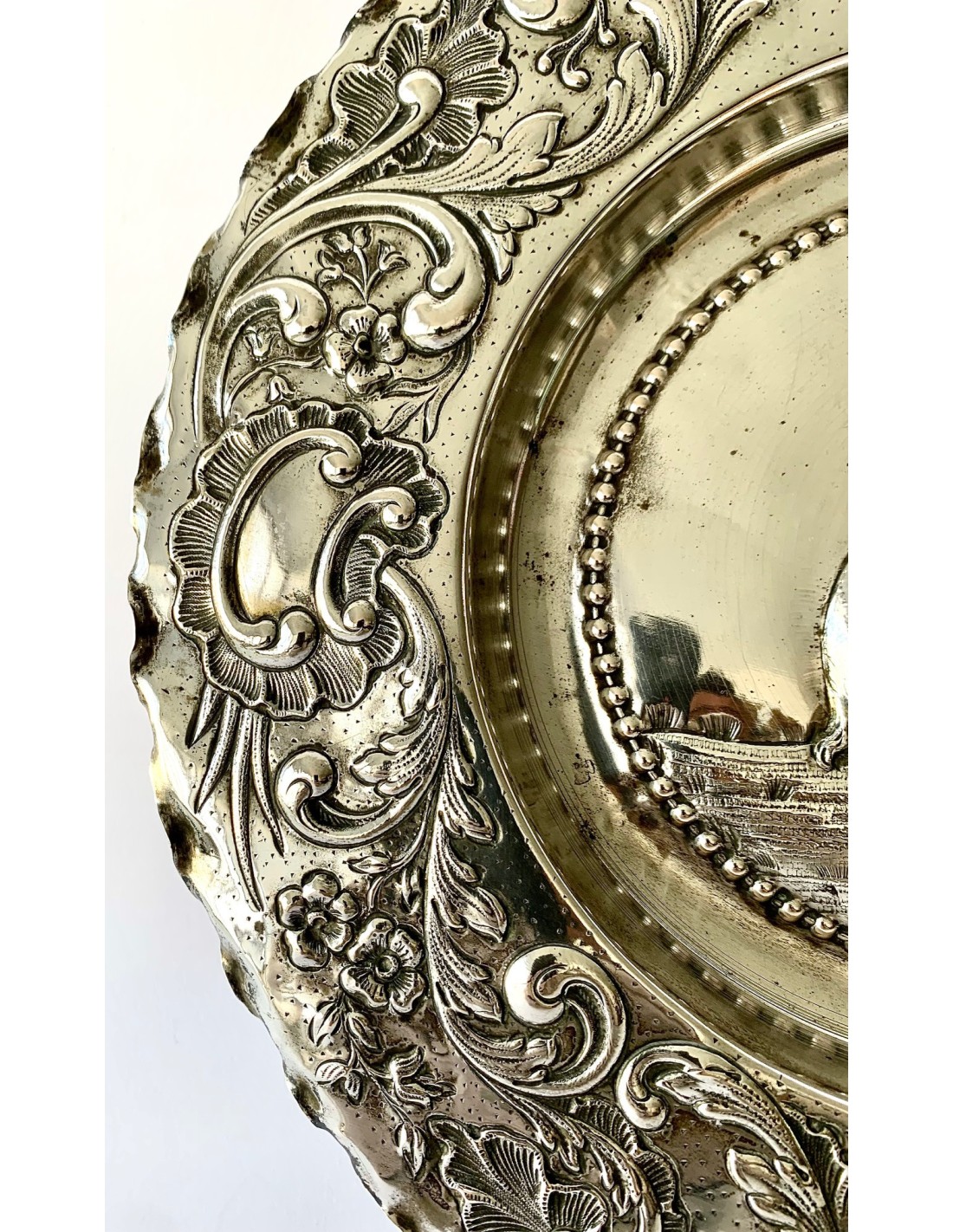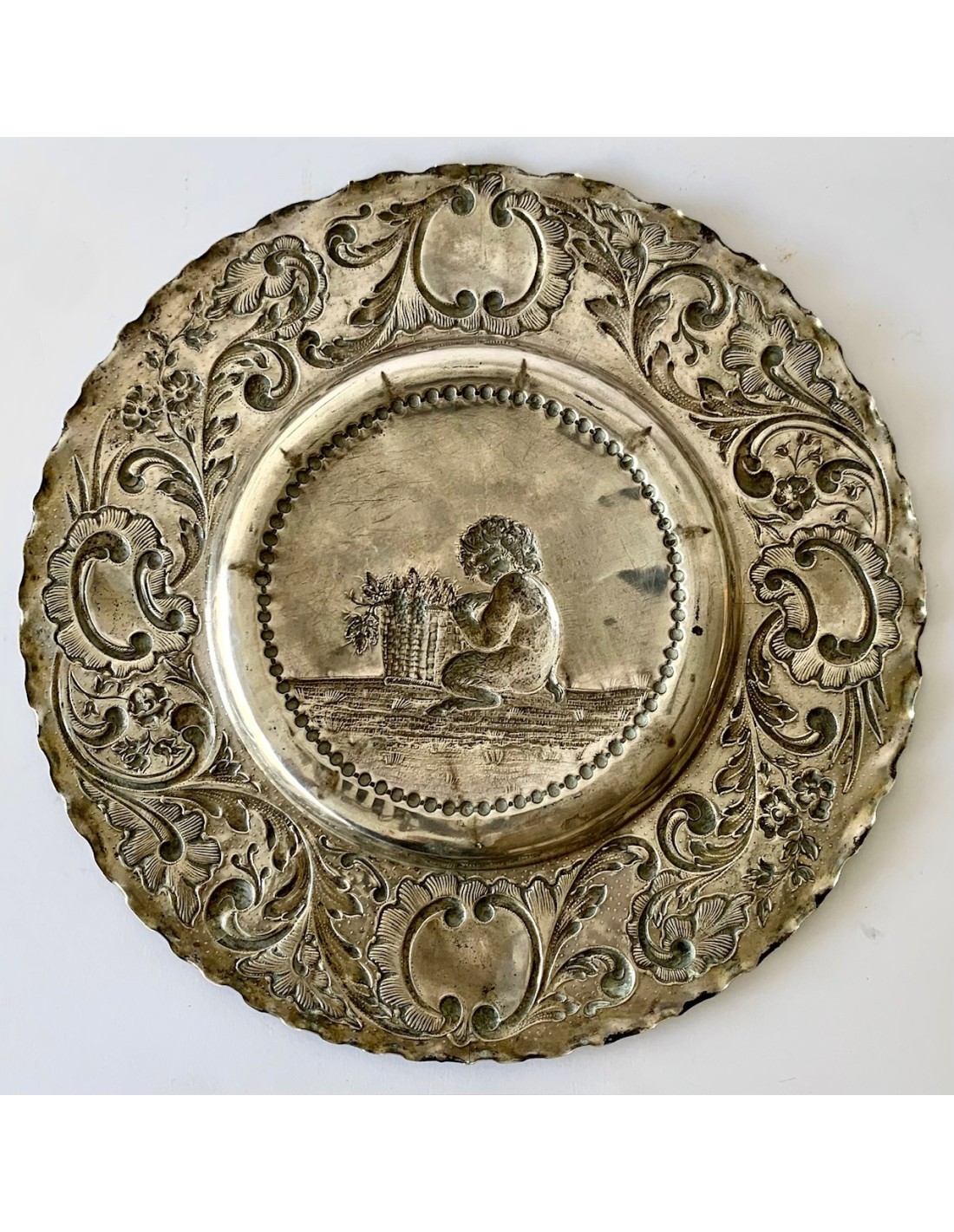 Bandeja de plata de ley cincelada, muy probablemente alemana del siglo XIX, escena central con fauno y cesta de uva, faja perimetral con decoraciones florales. Contraste visible en el margen inferior no identificado.