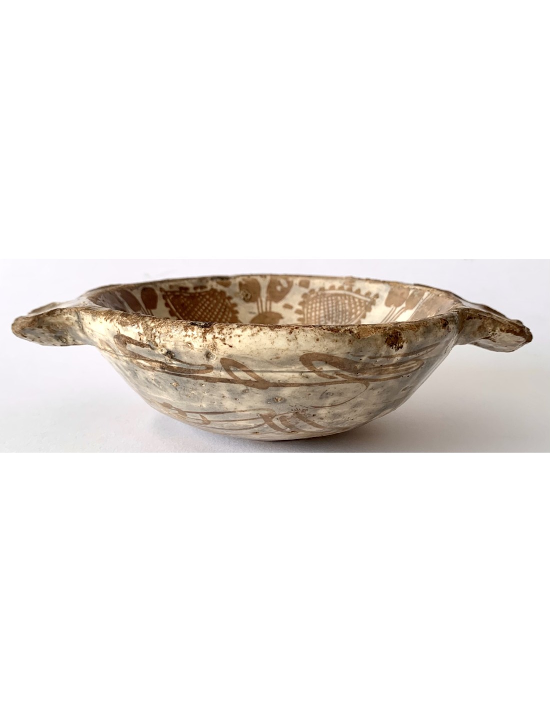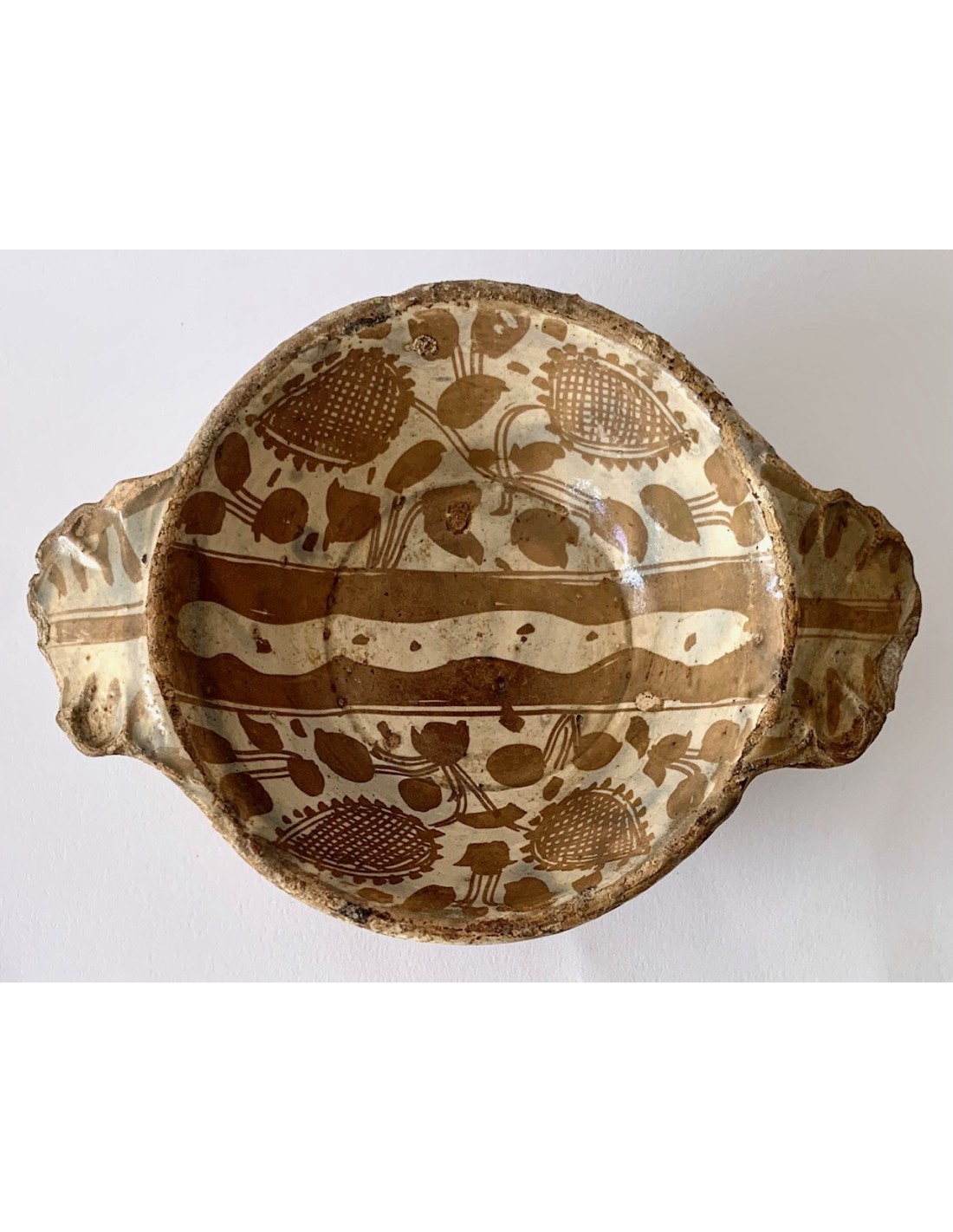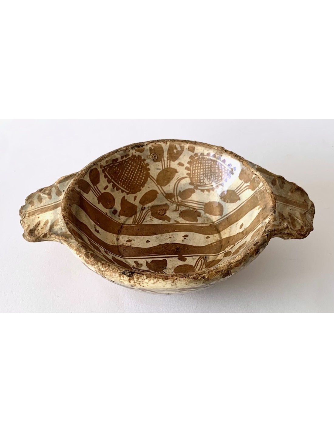 Escudella valenciana Manises, cerámica de reflejo metálico, entre finales del siglo XV principios del siglo XVI, decoraciones con motivos florales dividida por el medio por dos lineas paralelas, parte inferior también decorada. Muy buen estado de conservación sin rupturas, algún pequeño toque al esmalte normal por la época.