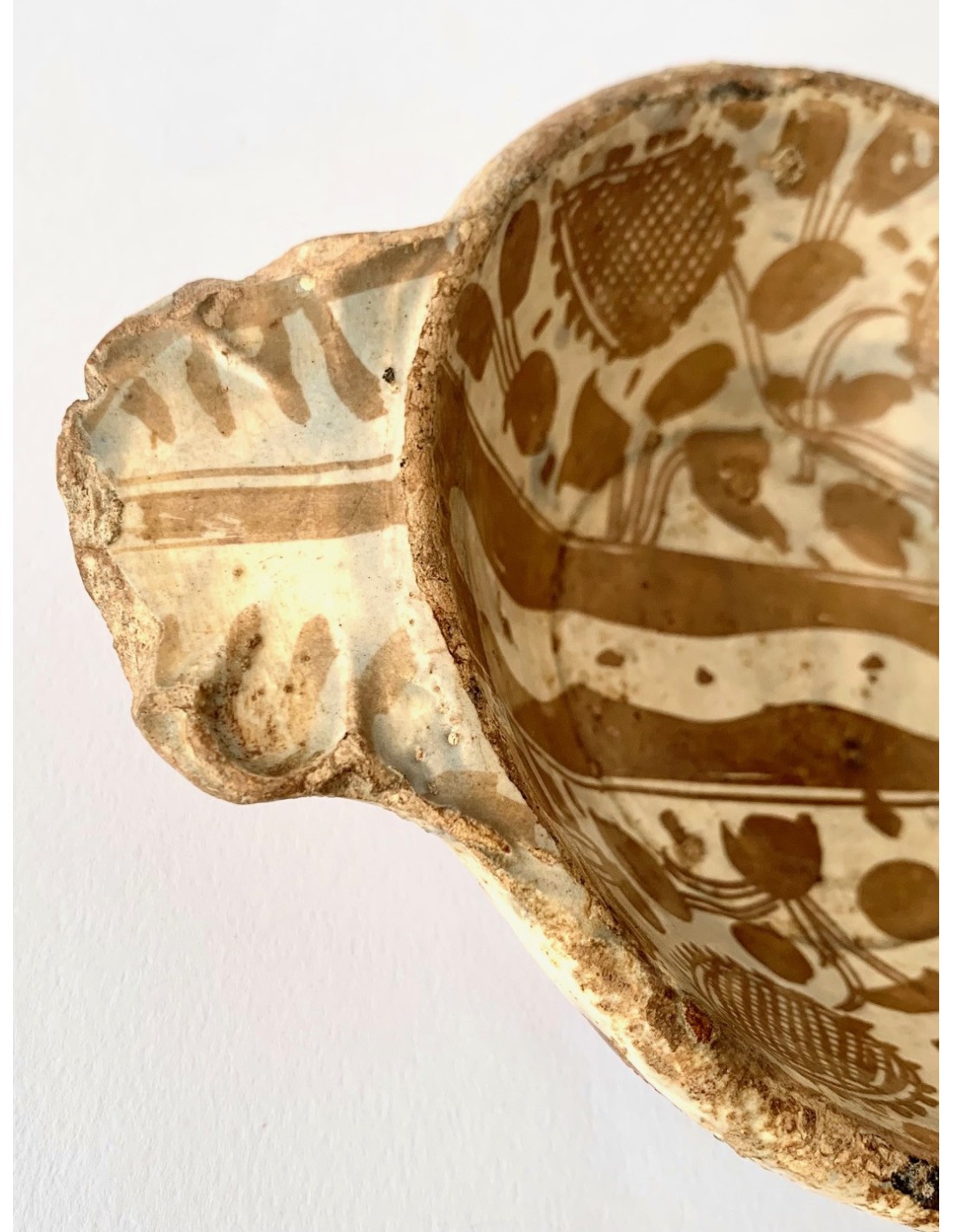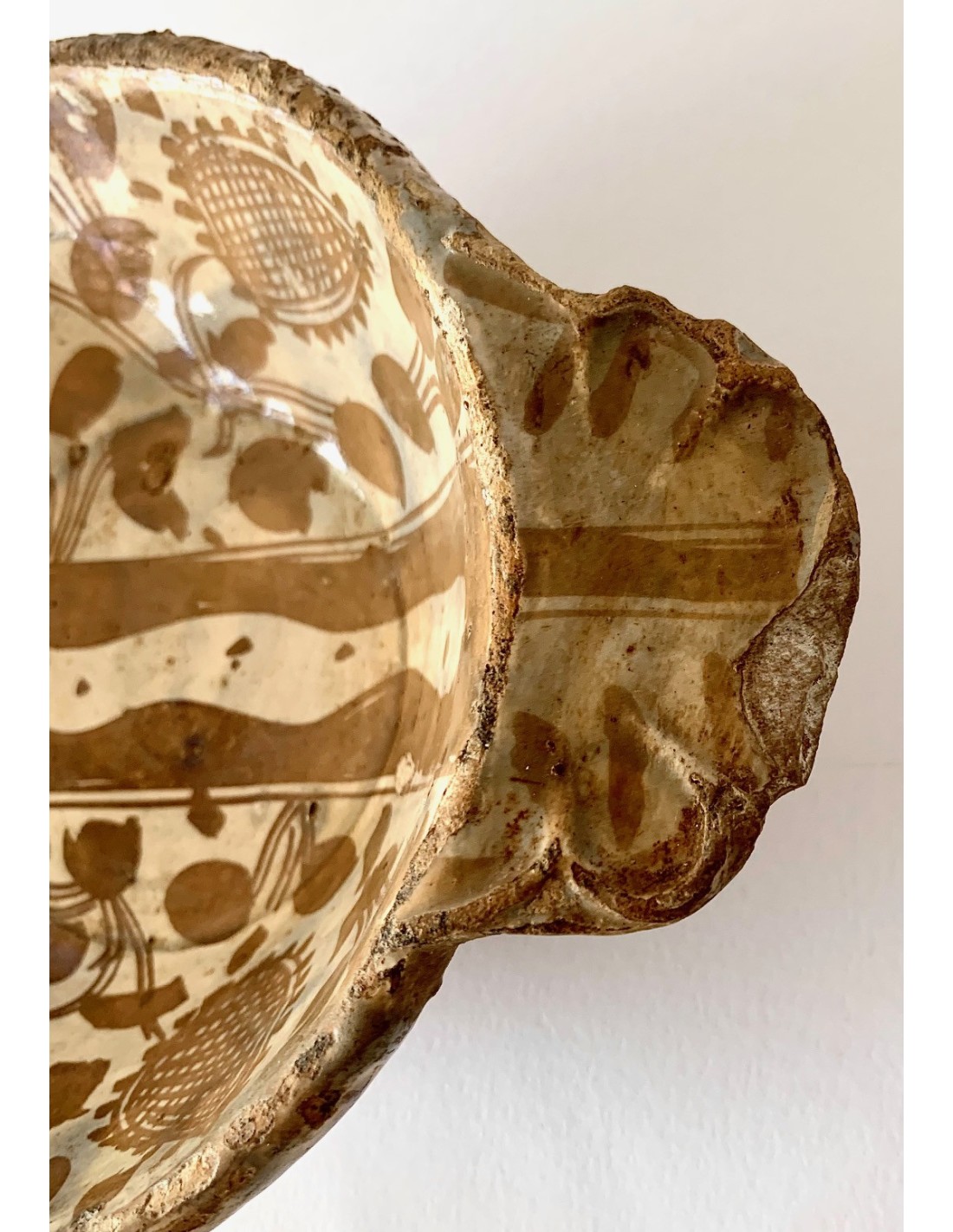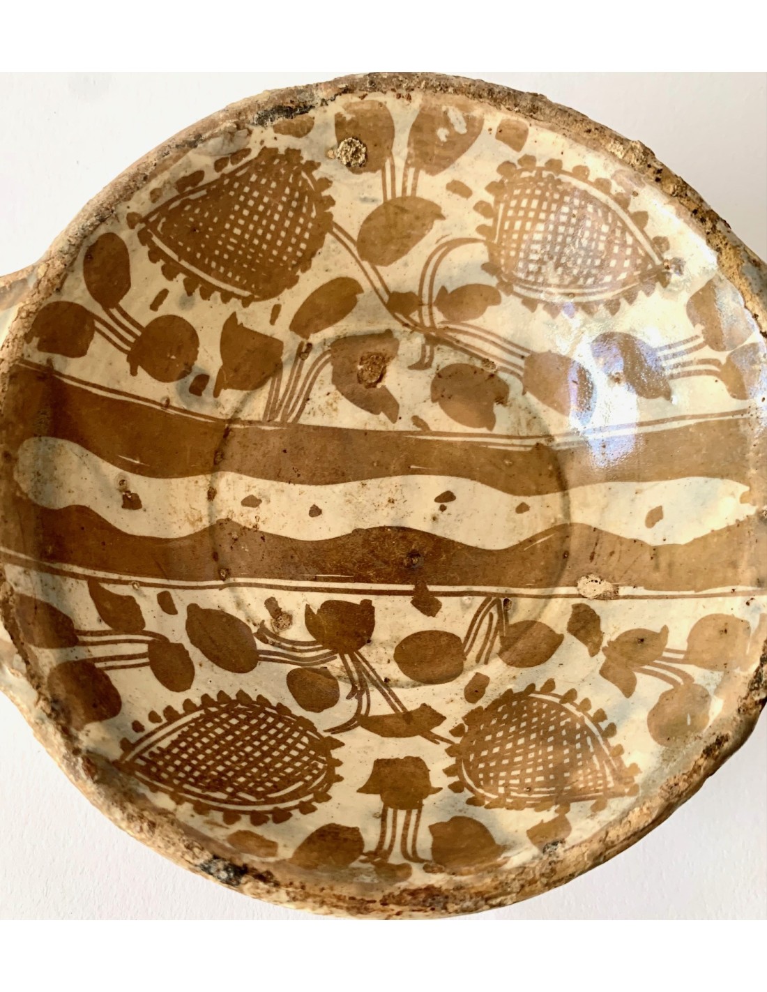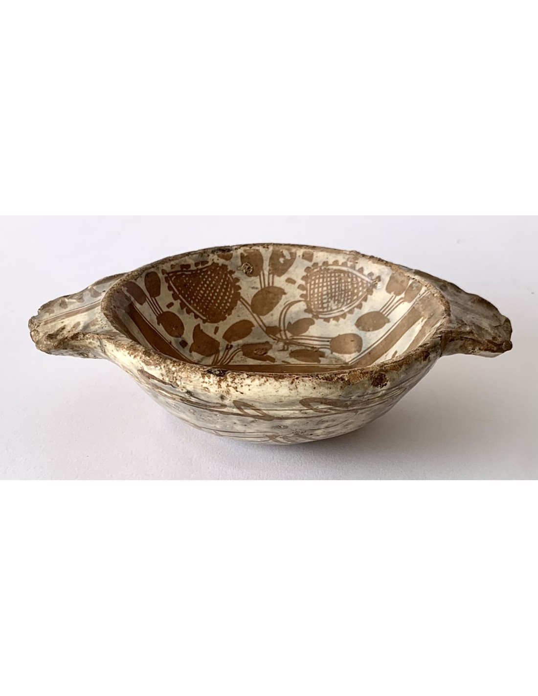 Escudella valenciana Manises, cerámica de reflejo metálico, entre finales del siglo XV principios del siglo XVI, decoraciones con motivos florales dividida por el medio por dos lineas paralelas, parte inferior también decorada. Muy buen estado de conservación sin rupturas, algún pequeño toque al esmalte normal por la época.