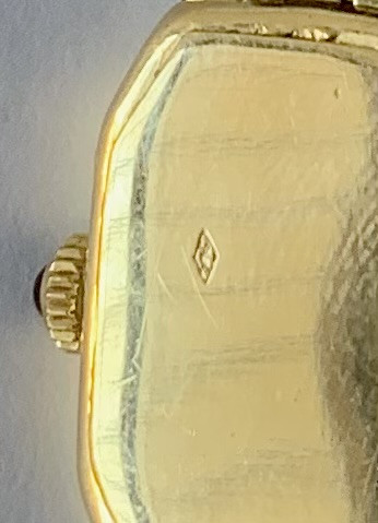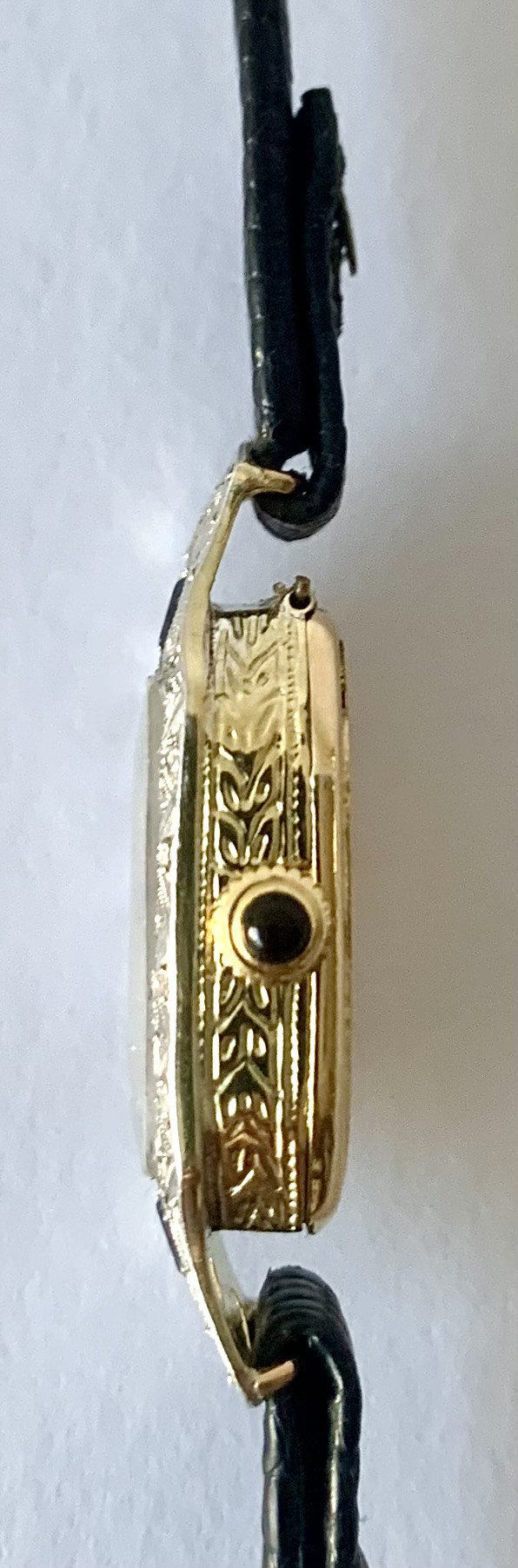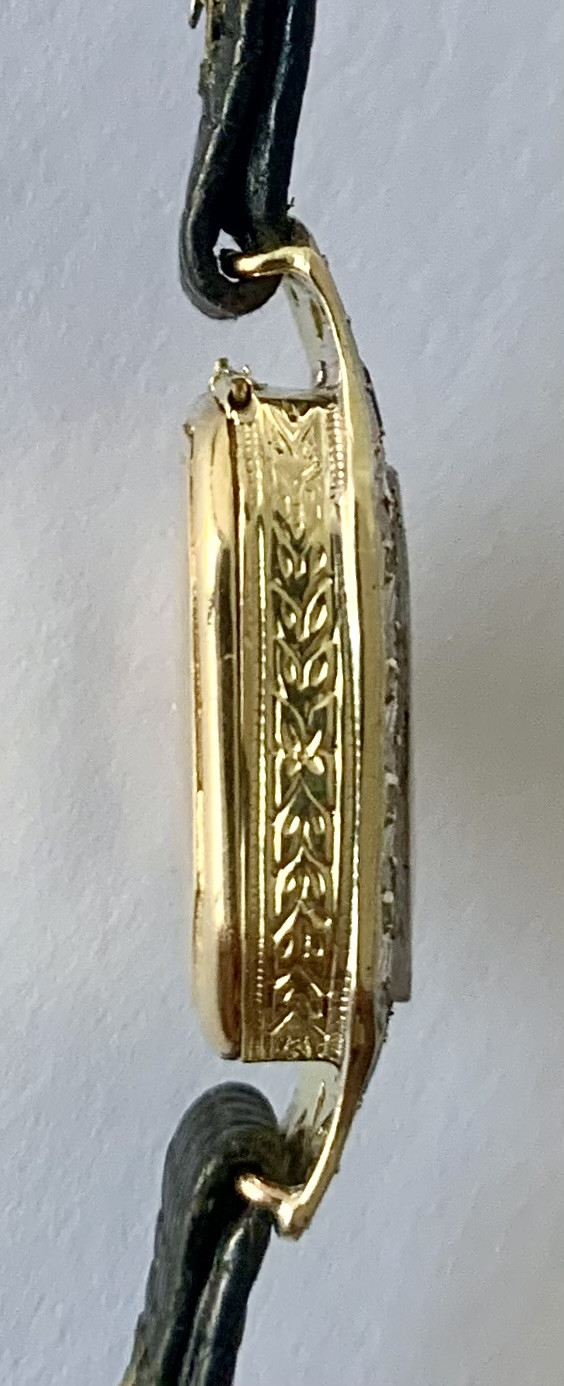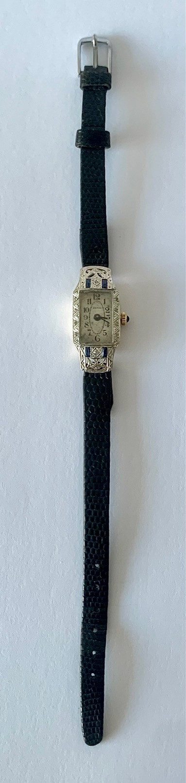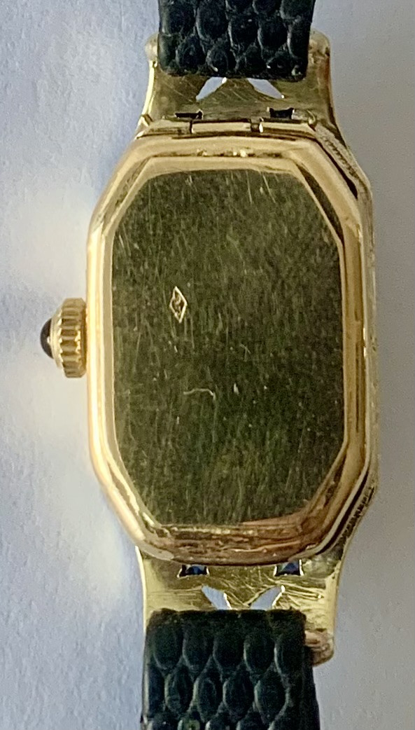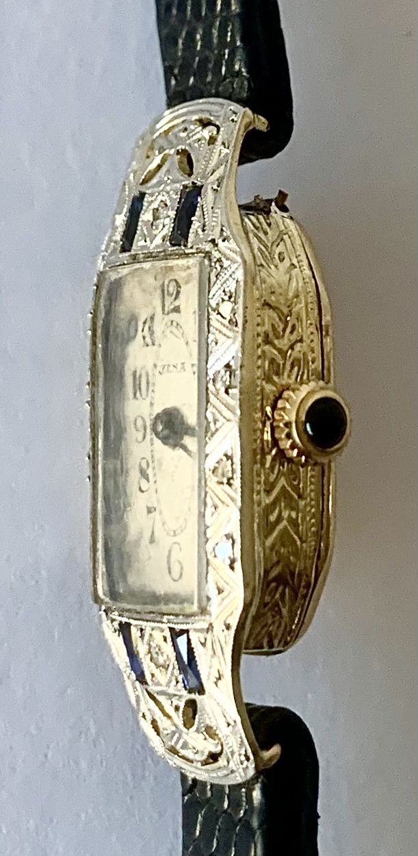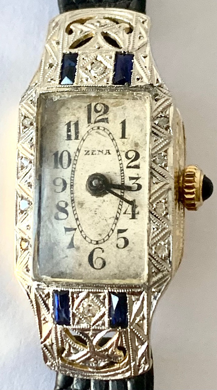 Reloj de mujer Titus, Geneve Suiza, caja de oro 18K con brillantes y zafiros, periodo decó 1920-30, esfera marcada Zena, maquinaria en buen estado y funcionando, 15 rubís, correa original de piel, buen estado de conservación general.