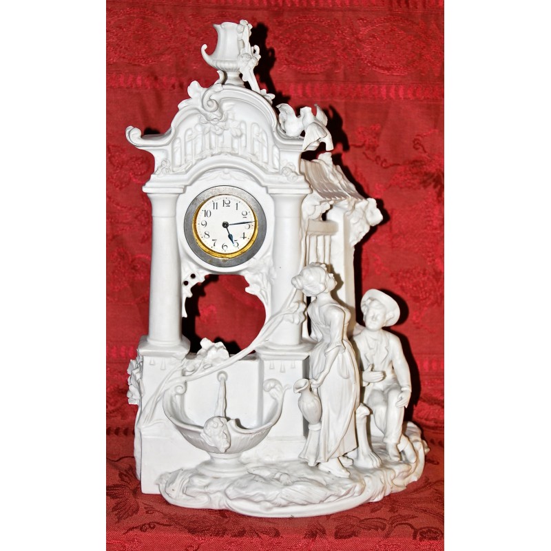 Reloj de mesa francés de principio del siglo XX (1900-1920), realizado en biscuit, bonita escena romántica con pareja de jóvenes delante de una fuente, muy trabajada en sus detalles decorativos. Dos llaves, una para su carga y la otra para ajustar las horas. Excelente conservación.
