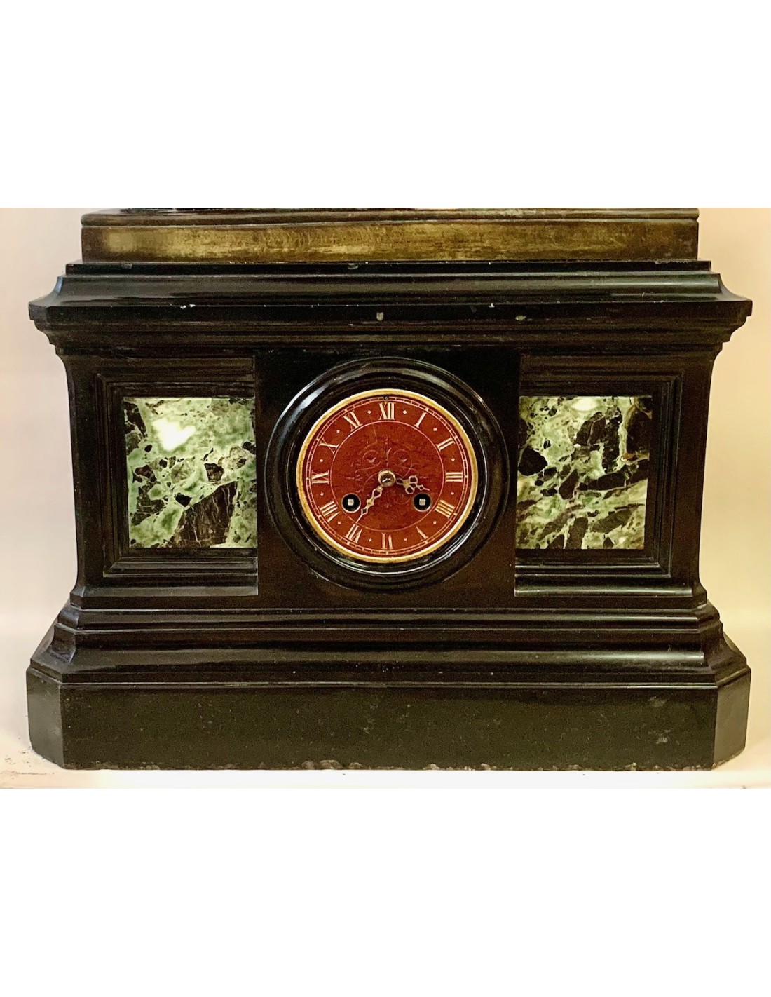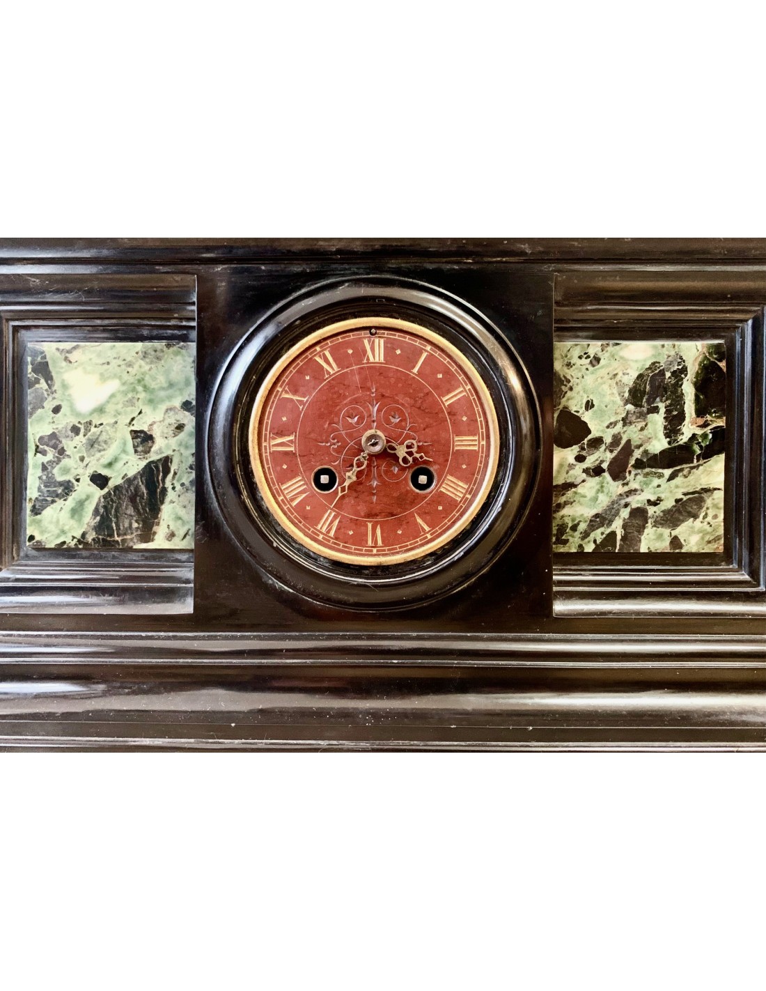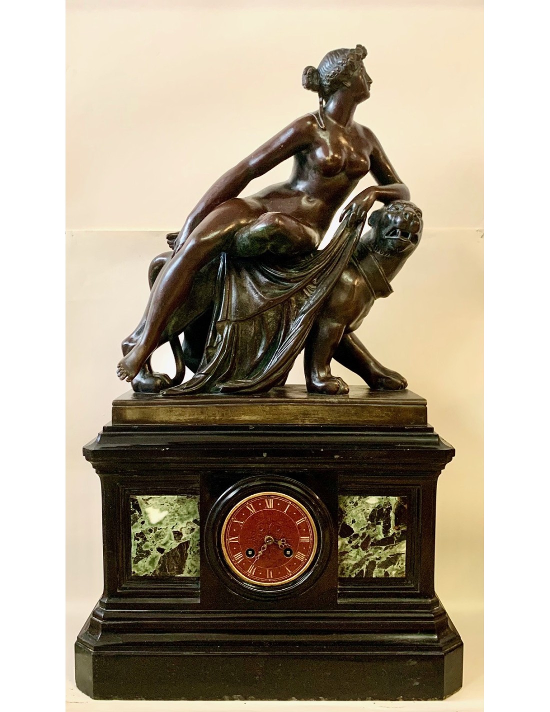 Reloj de sobremesa francés de la segunda mitad del Siglo XIX. Escutura de bronce patinado marrón que representa Ariadna sobre la pantera. Base de mármol negra, verde y la esfera del reloj de mármol roja. Funciona perfectamente. Buen estado de conservación.