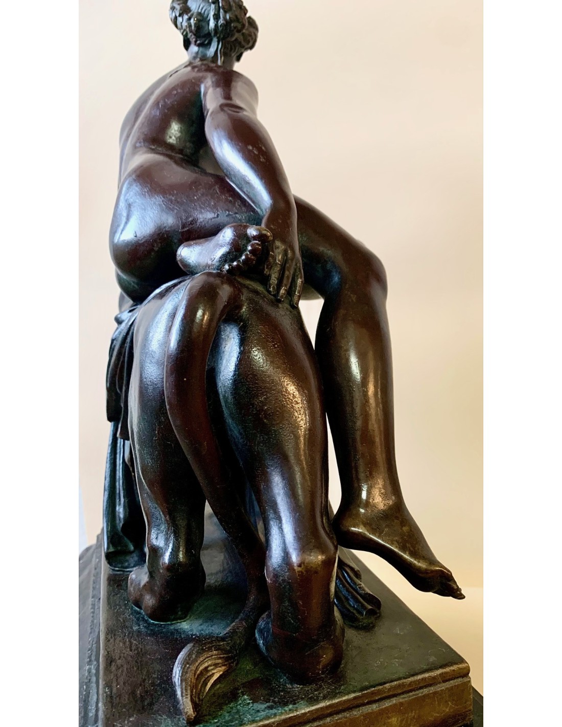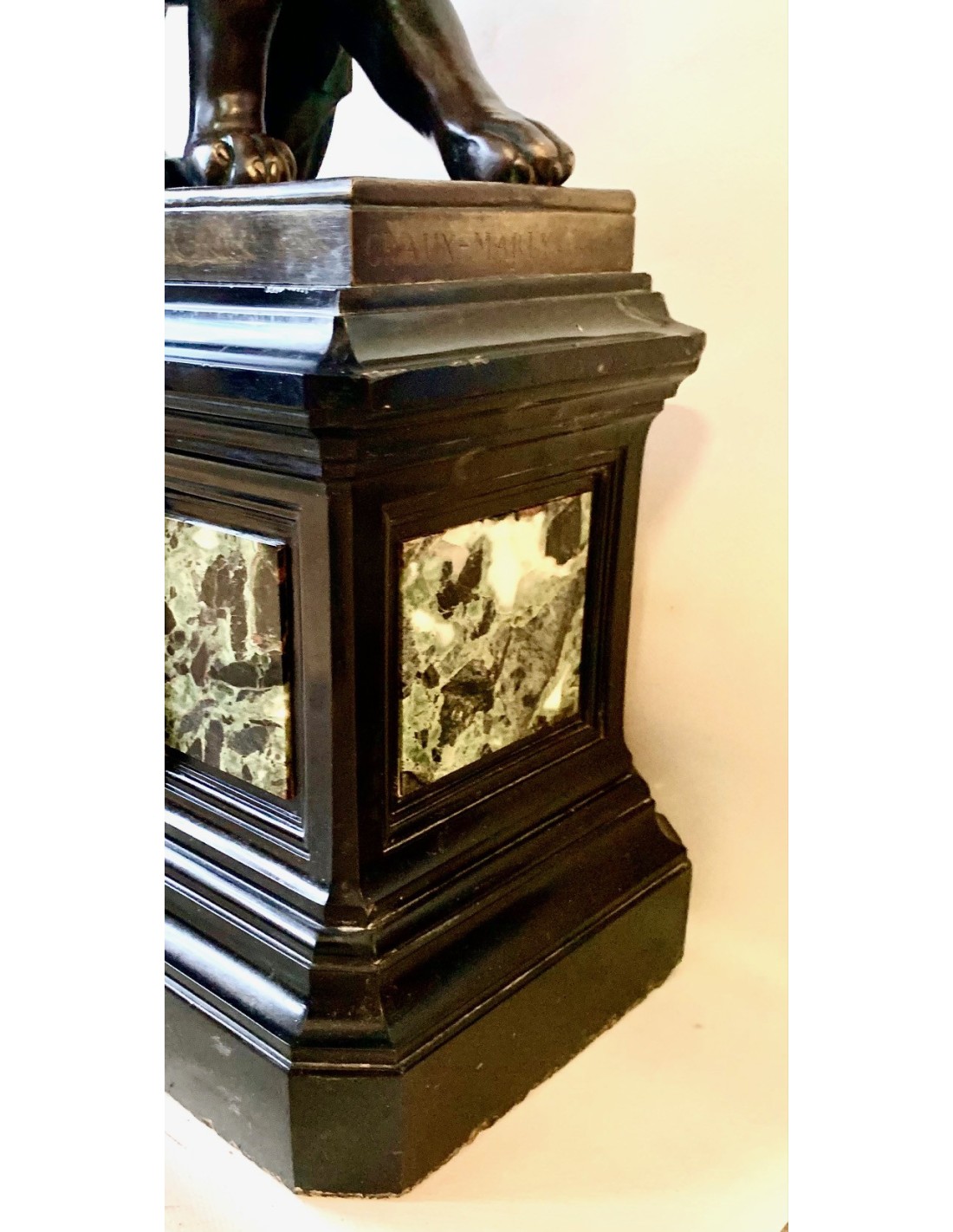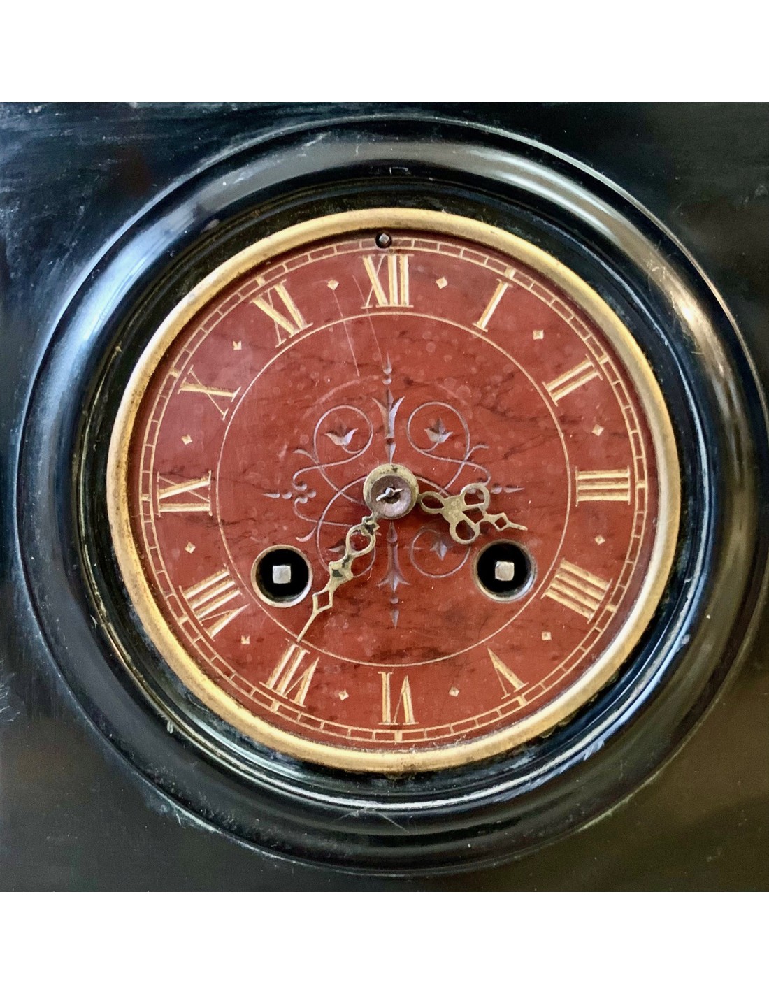 Reloj de sobremesa francés de la segunda mitad del Siglo XIX. Escutura de bronce patinado marrón que representa Ariadna sobre la pantera. Base de mármol negra, verde y la esfera del reloj de mármol roja. Funciona perfectamente. Buen estado de conservación.