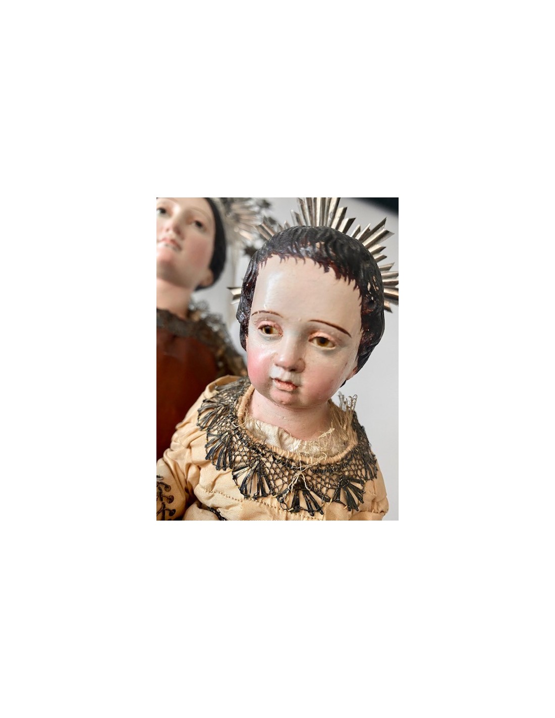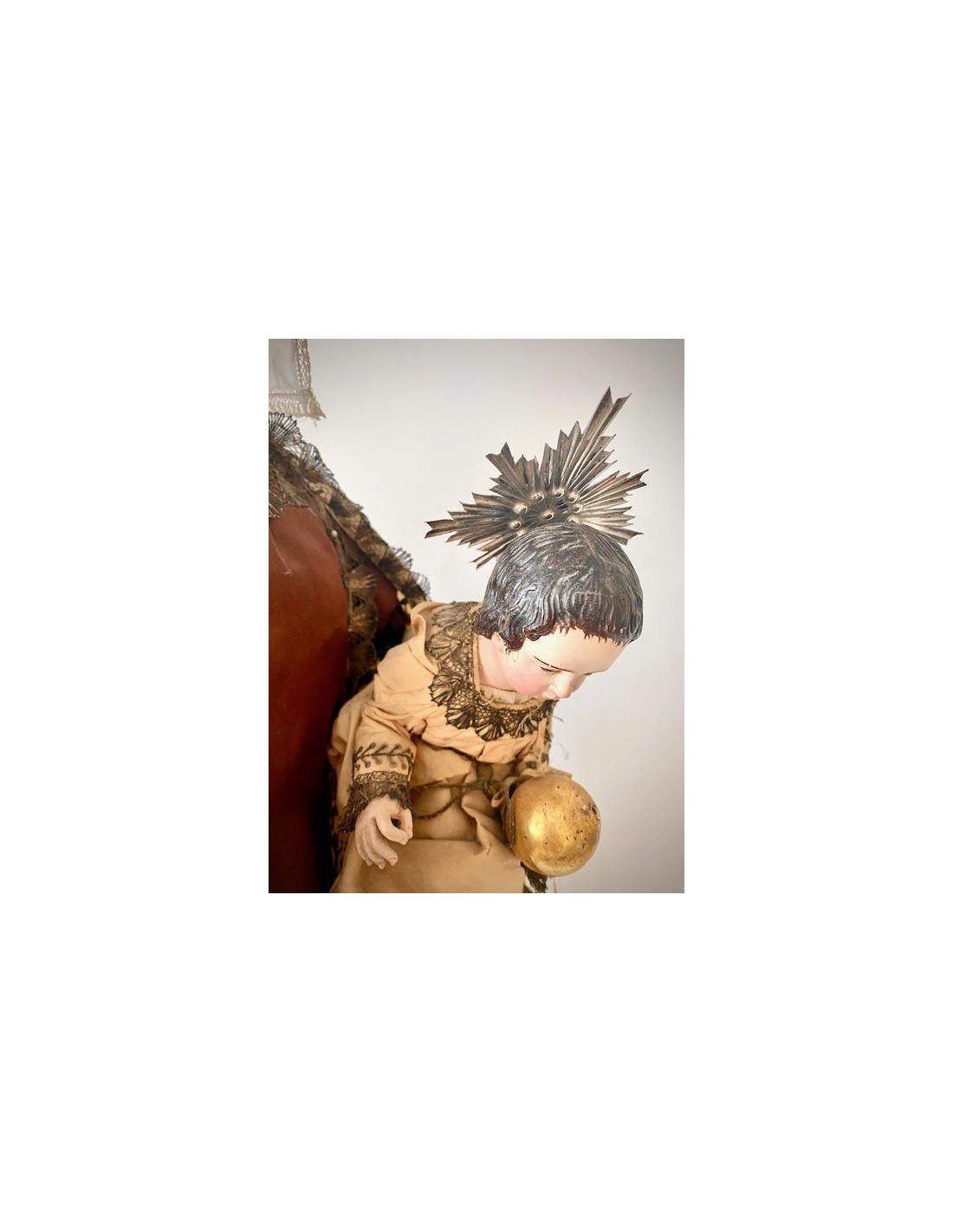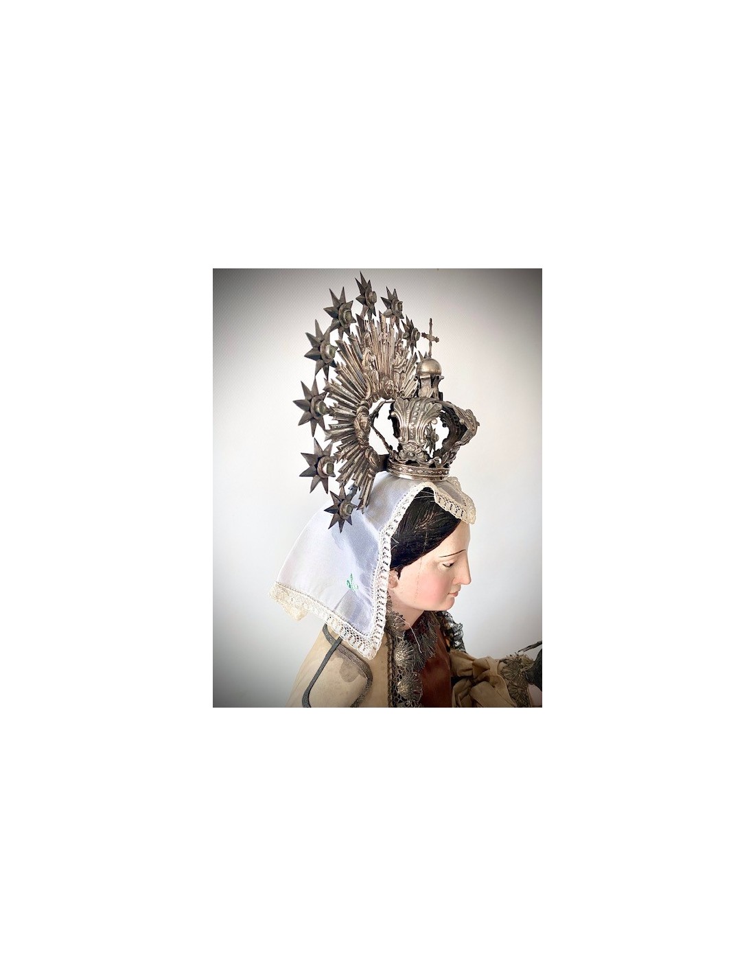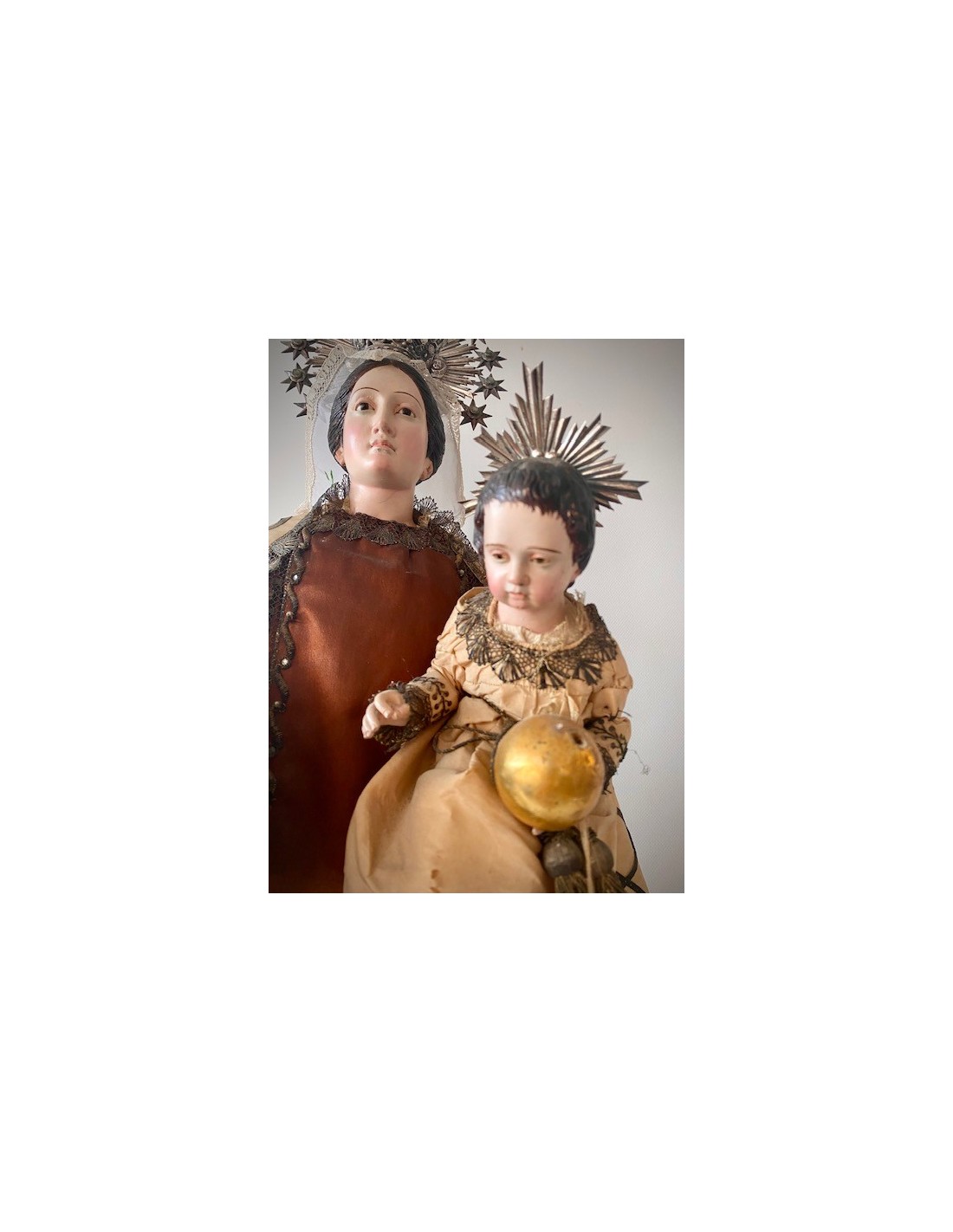 Virgen del Carmen con el Niño. Virgen del Carmen con ramo de flores en la mano y el Niño con la bola del mundo. Corona de plata y vestimenta de seda bordada con hilo de plata.