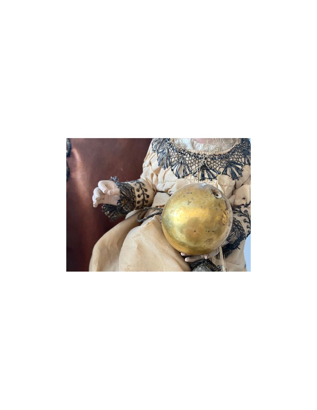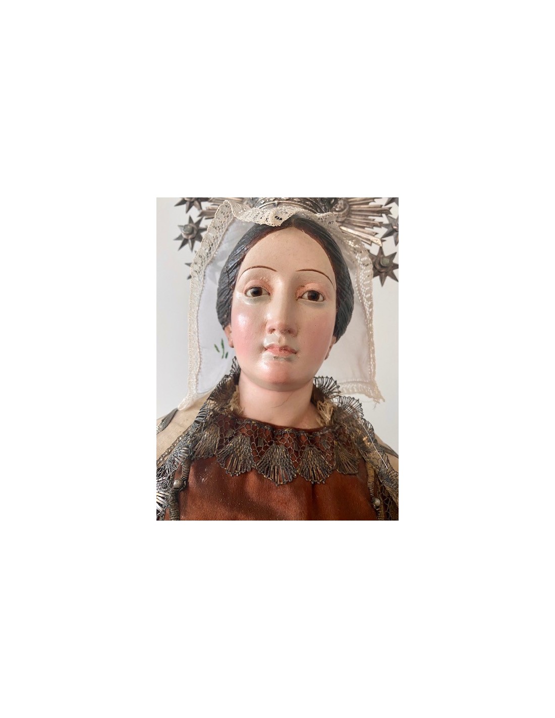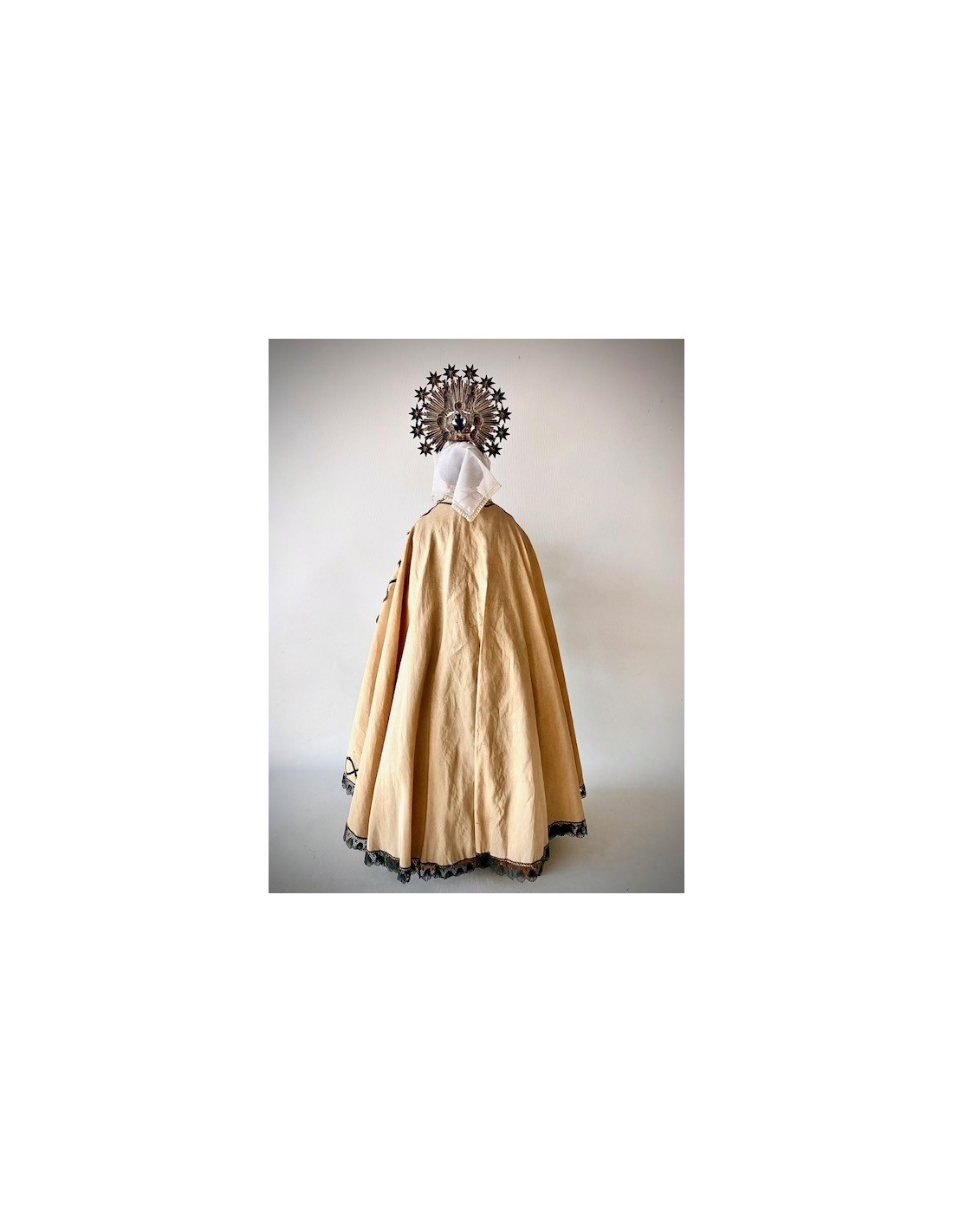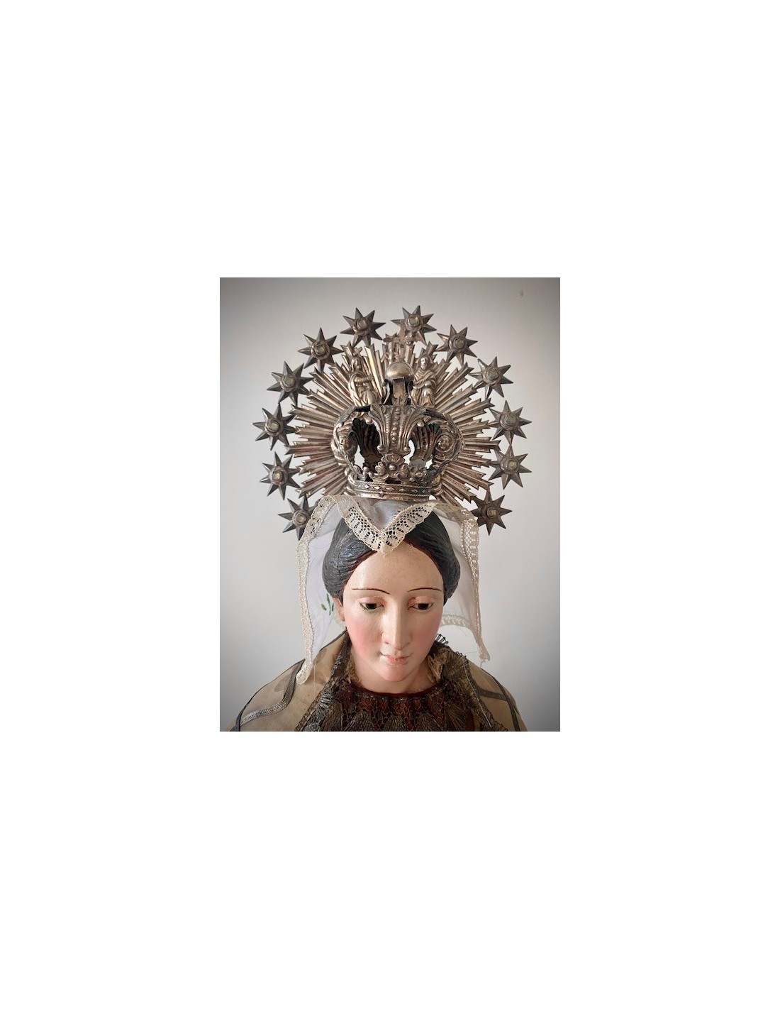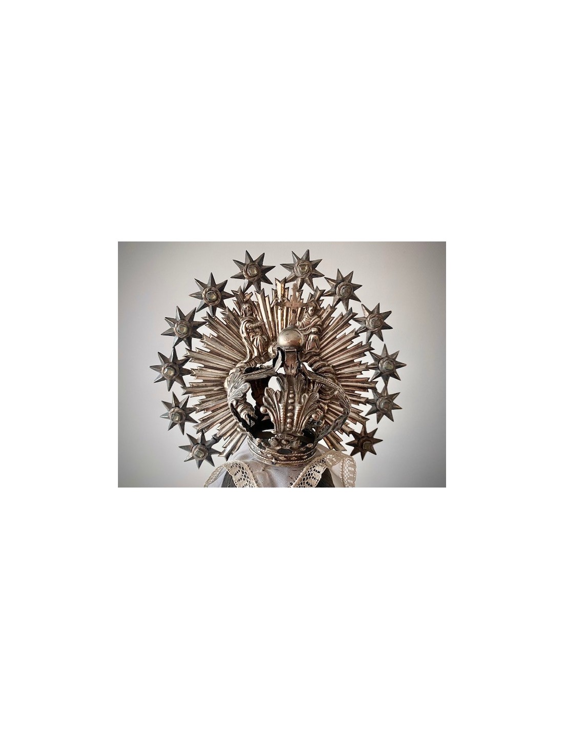 Virgen del Carmen con el Niño. Virgen del Carmen con ramo de flores en la mano y el Niño con la bola del mundo. Corona de plata y vestimenta de seda bordada con hilo de plata.
