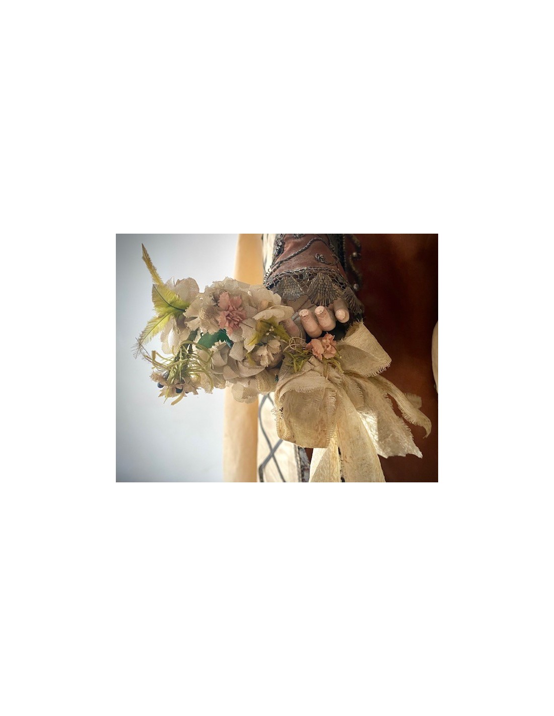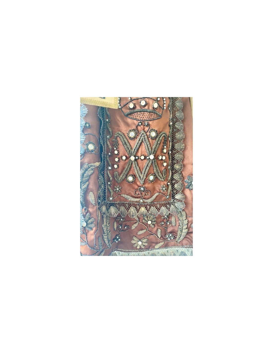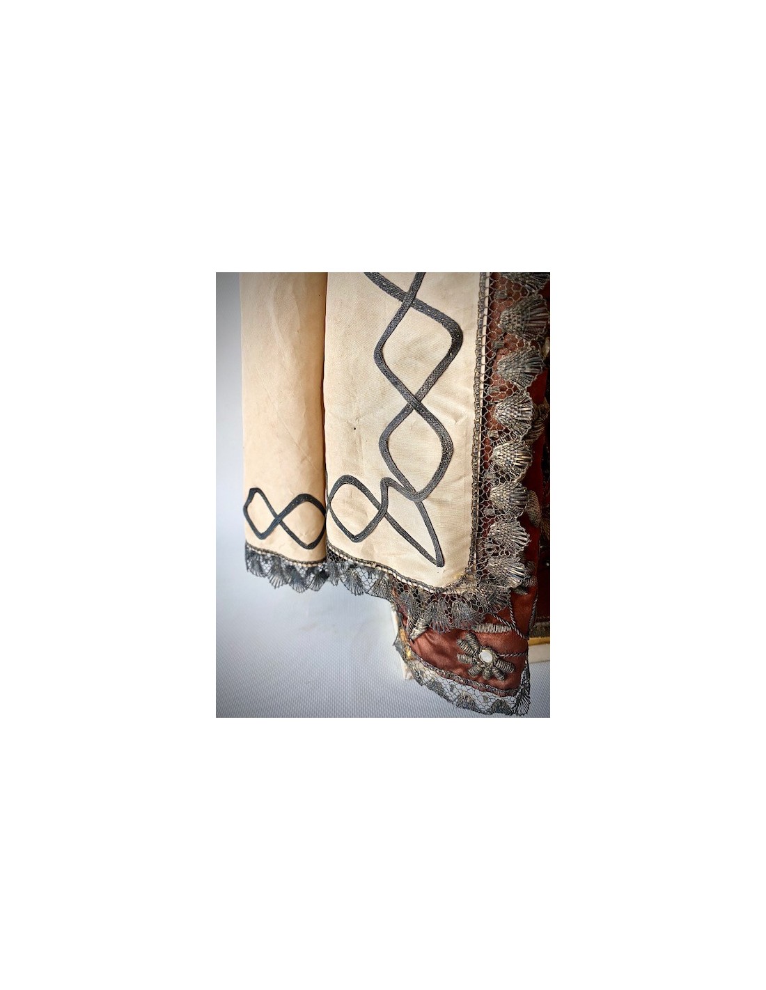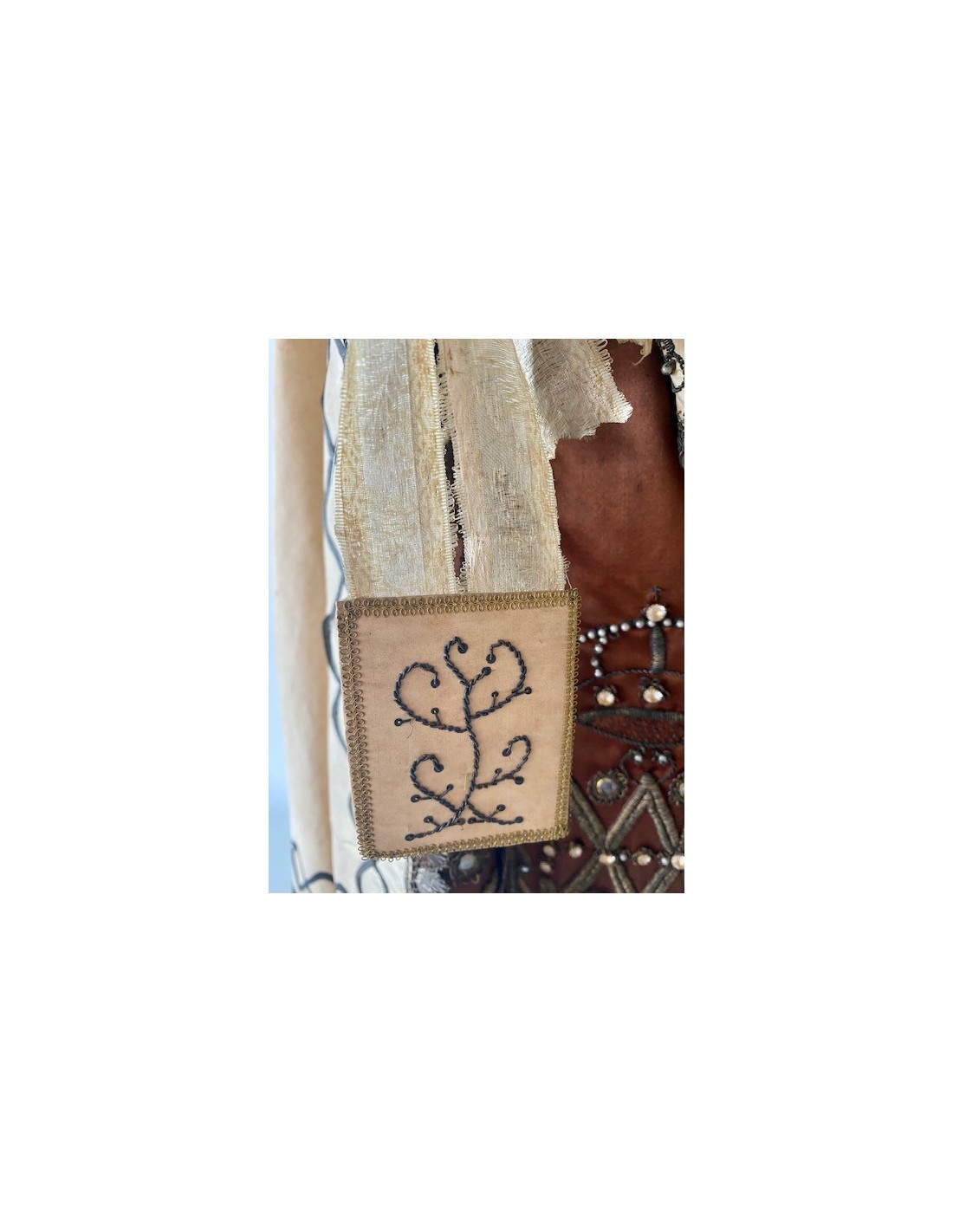 Virgen del Carmen con el Niño. Virgen del Carmen con ramo de flores en la mano y el Niño con la bola del mundo. Corona de plata y vestimenta de seda bordada con hilo de plata.