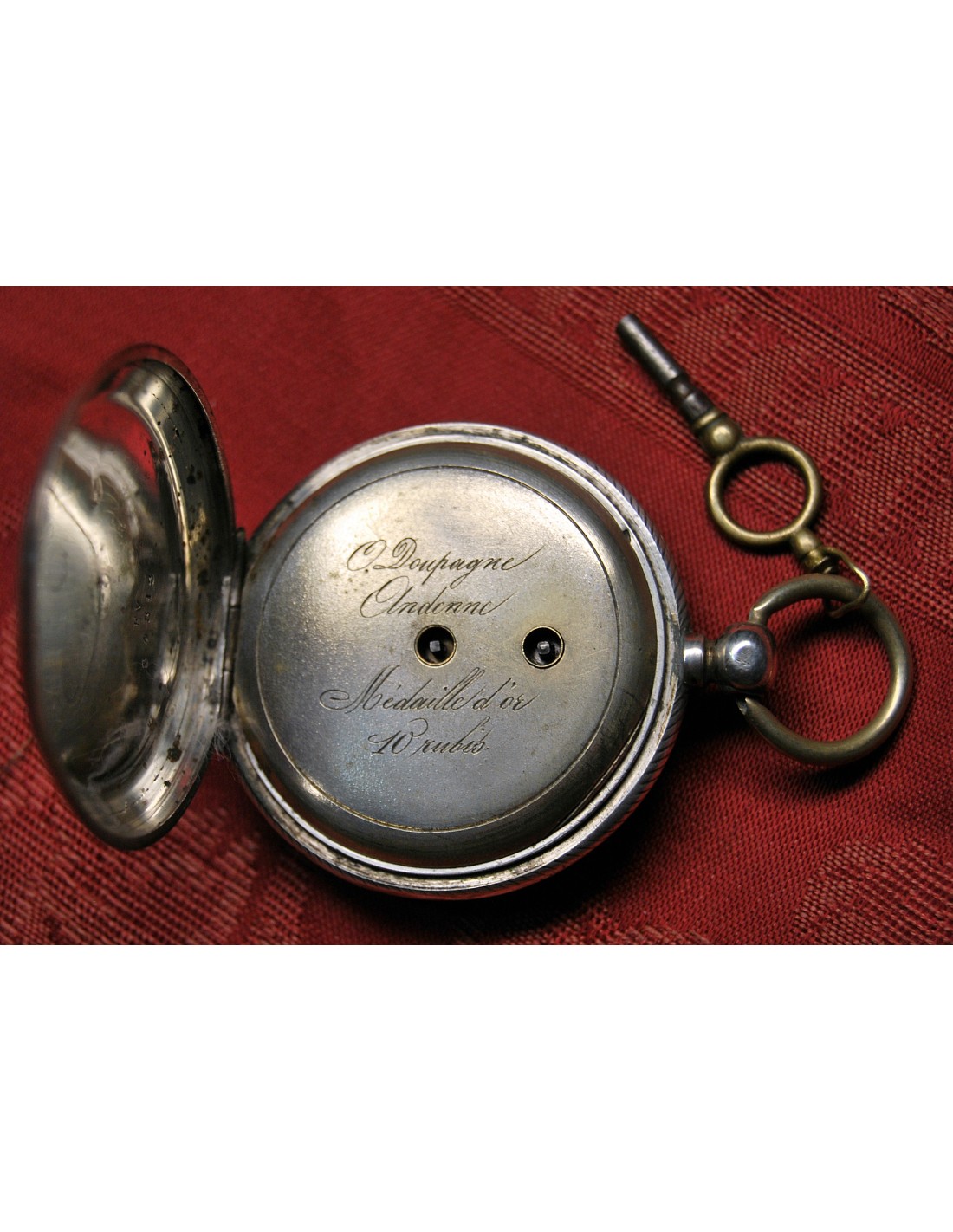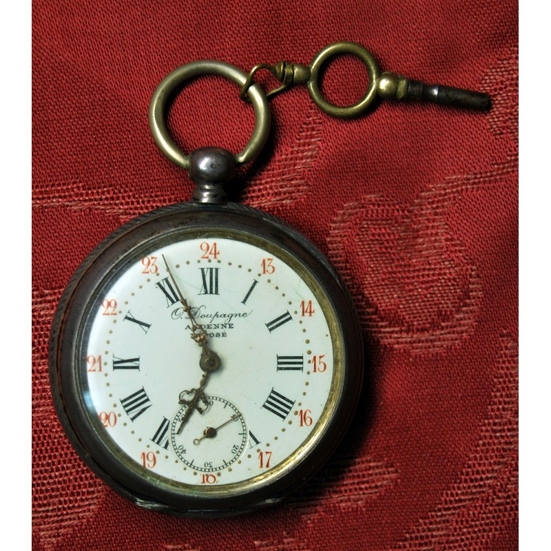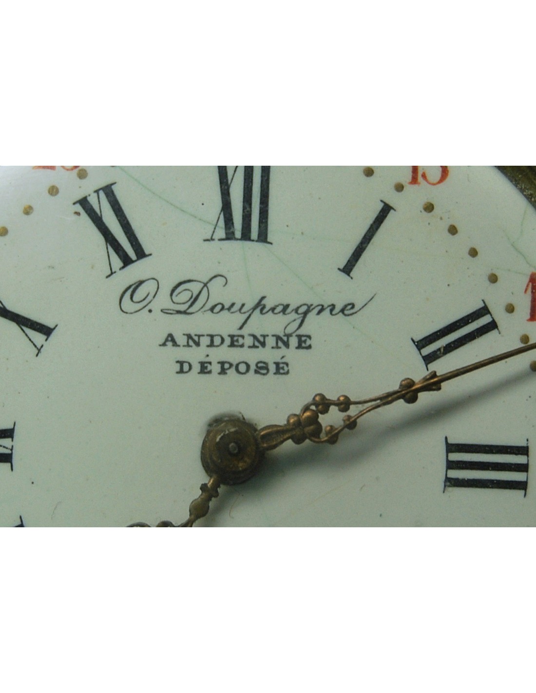 Orologio da tasca d’argento 800, della fine del XIX secolo, firmato nel quadrante per l’orologiaio O.Doupagne - Andenne (Belgio). numerazione esterna delle ore in rosso, numerazione romana interna in nero, sfera dei secondi alle ore sei, carica con la chiave, perfetto stato di conservazione, funziona correttamente.