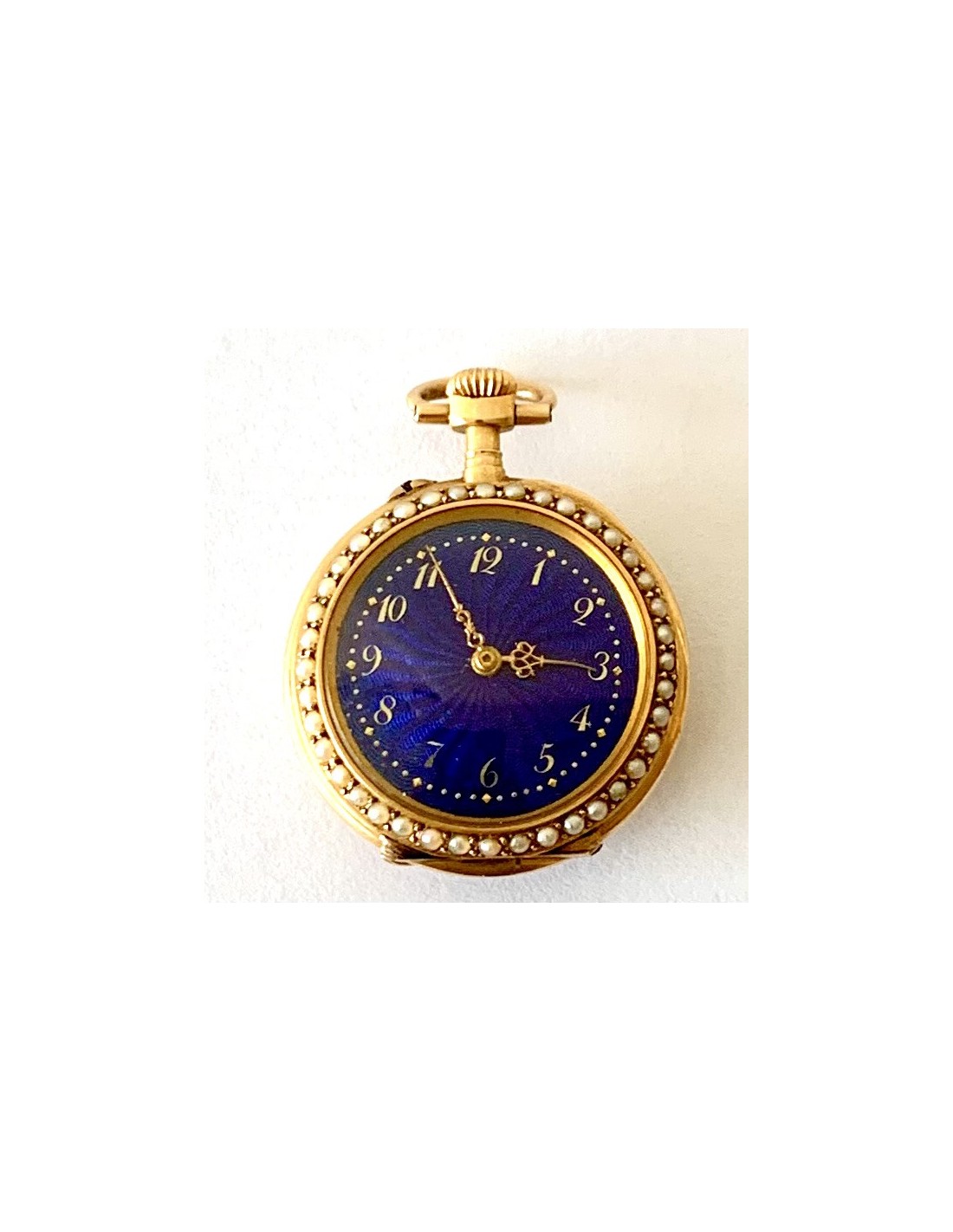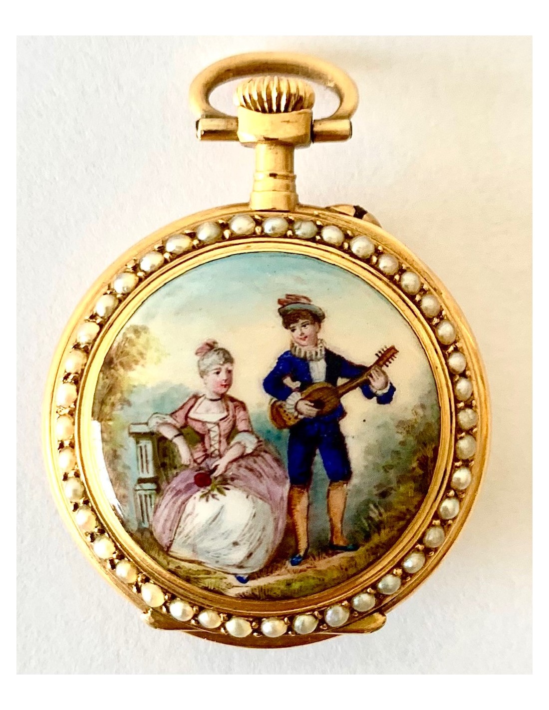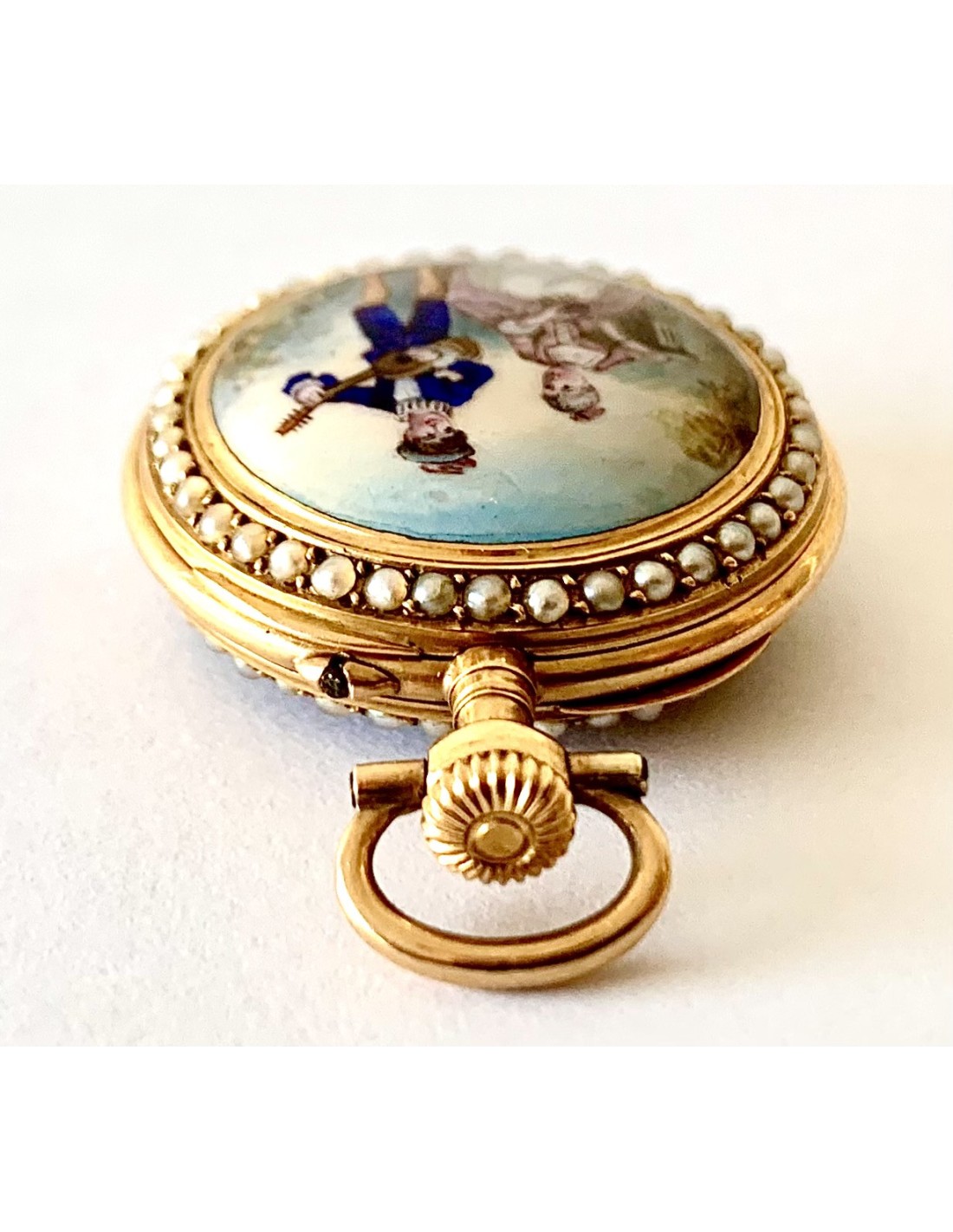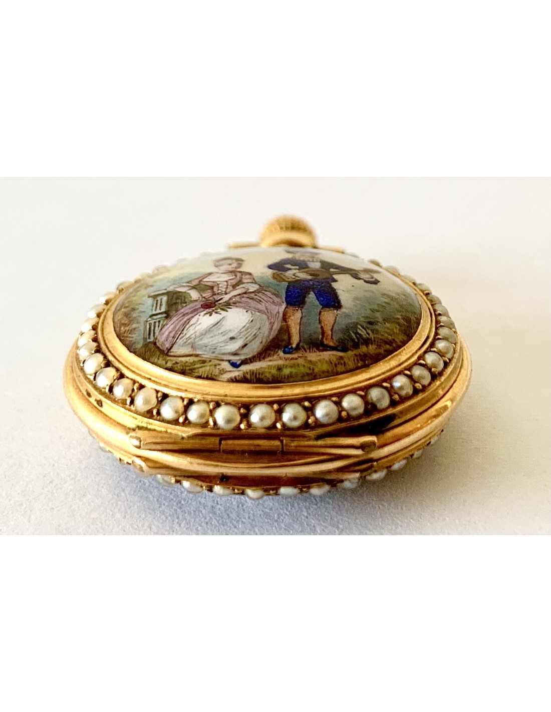 Orologio da tasca d’oro di 18 carati (punzoni Helvetia), Svizzera, metà del XIX secolo, in un lato smaltato con scena romantica contornata da piccole perle, l’altro lato cuadrante smaltato in blu contornato di perle, buono stato di conservazione, funziona perfettamente.