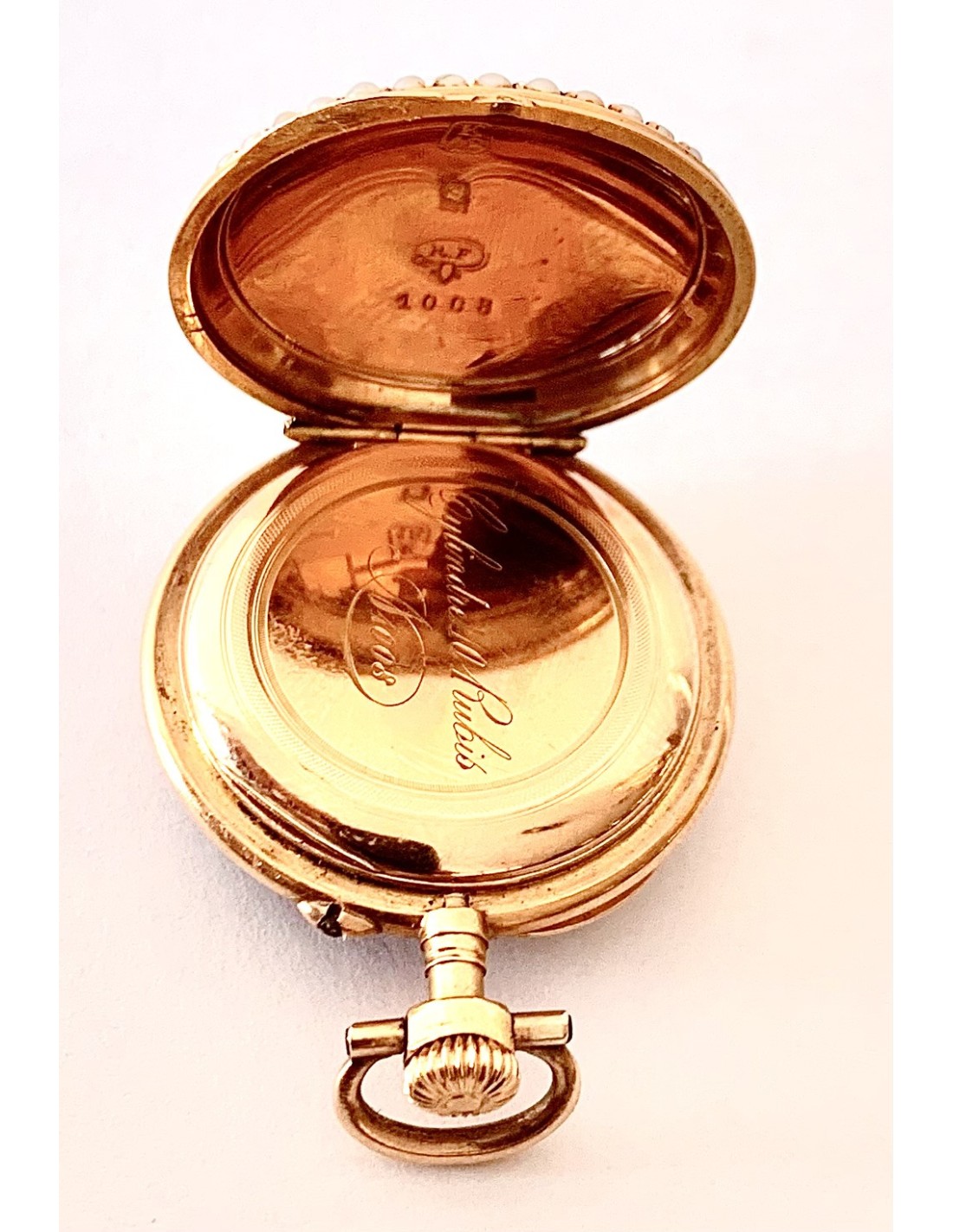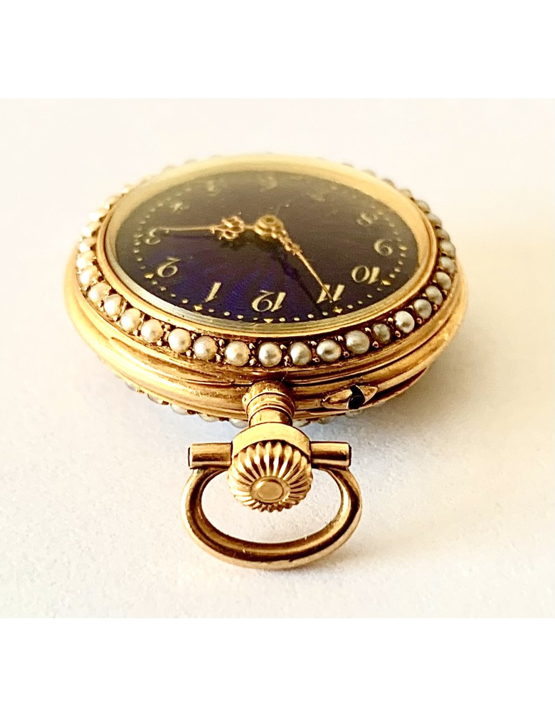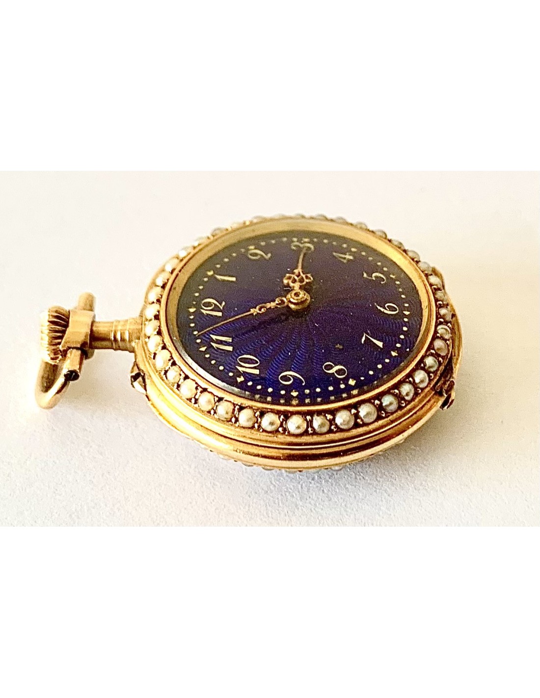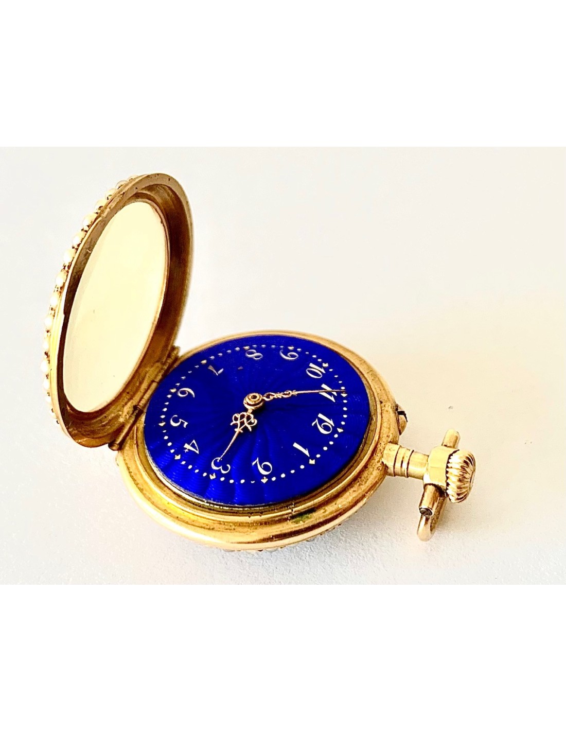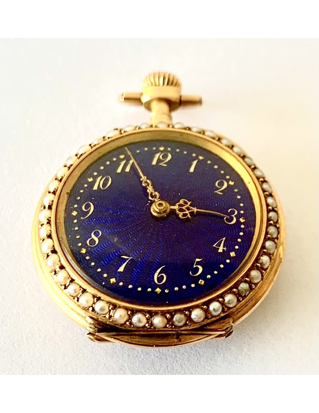 Orologio da tasca d’oro di 18 carati (punzoni Helvetia), Svizzera, metà del XIX secolo, in un lato smaltato con scena romantica contornata da piccole perle, l’altro lato cuadrante smaltato in blu contornato di perle, buono stato di conservazione, funziona perfettamente.