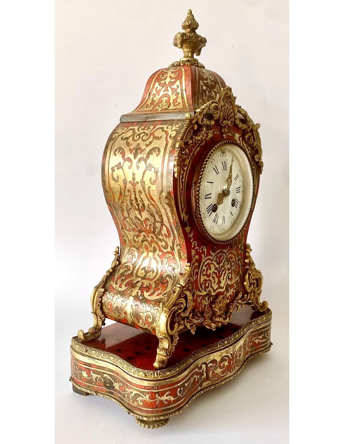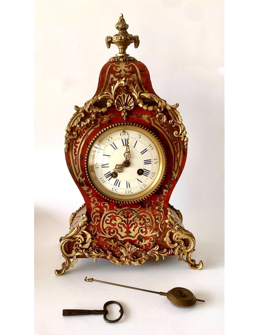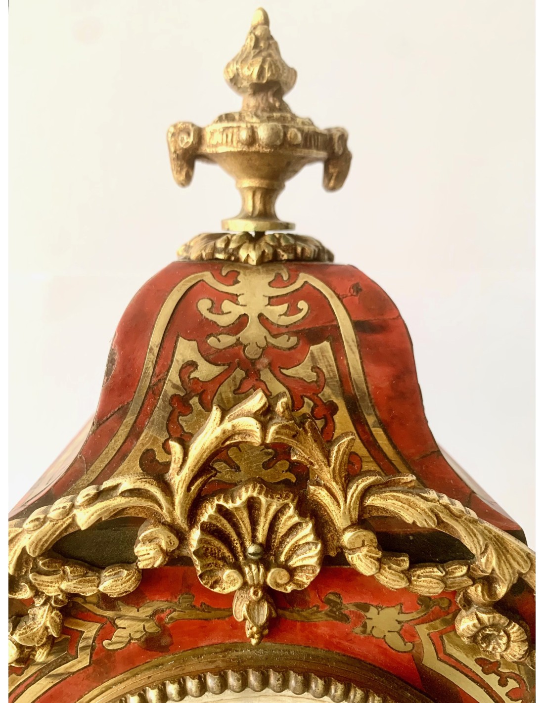 L’orologio appoggia su quattro piedi di bronzo e termina nella parte superiore con una coppa anch’essa di bronzo. L’orologio appoggia su una base realizzata con la stessa tecnica boulle di intarsi con ottone filettato. La meccanica Paris é in perfetto stato e funzionante. Tutto l’insieme é in ottimo stato di conservazione.