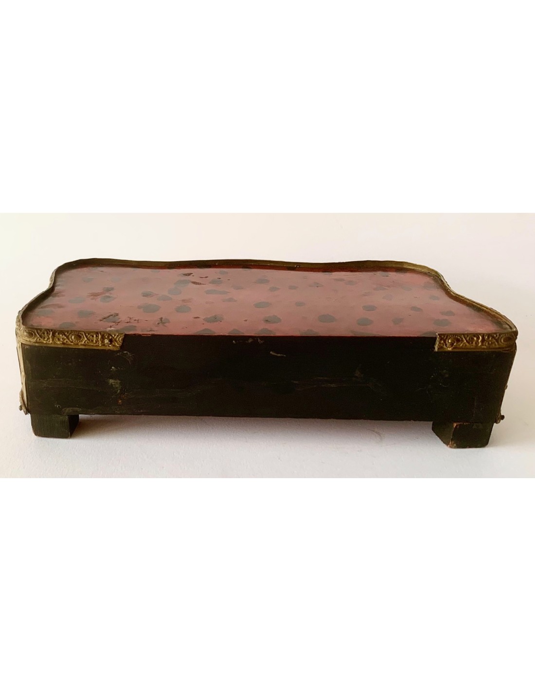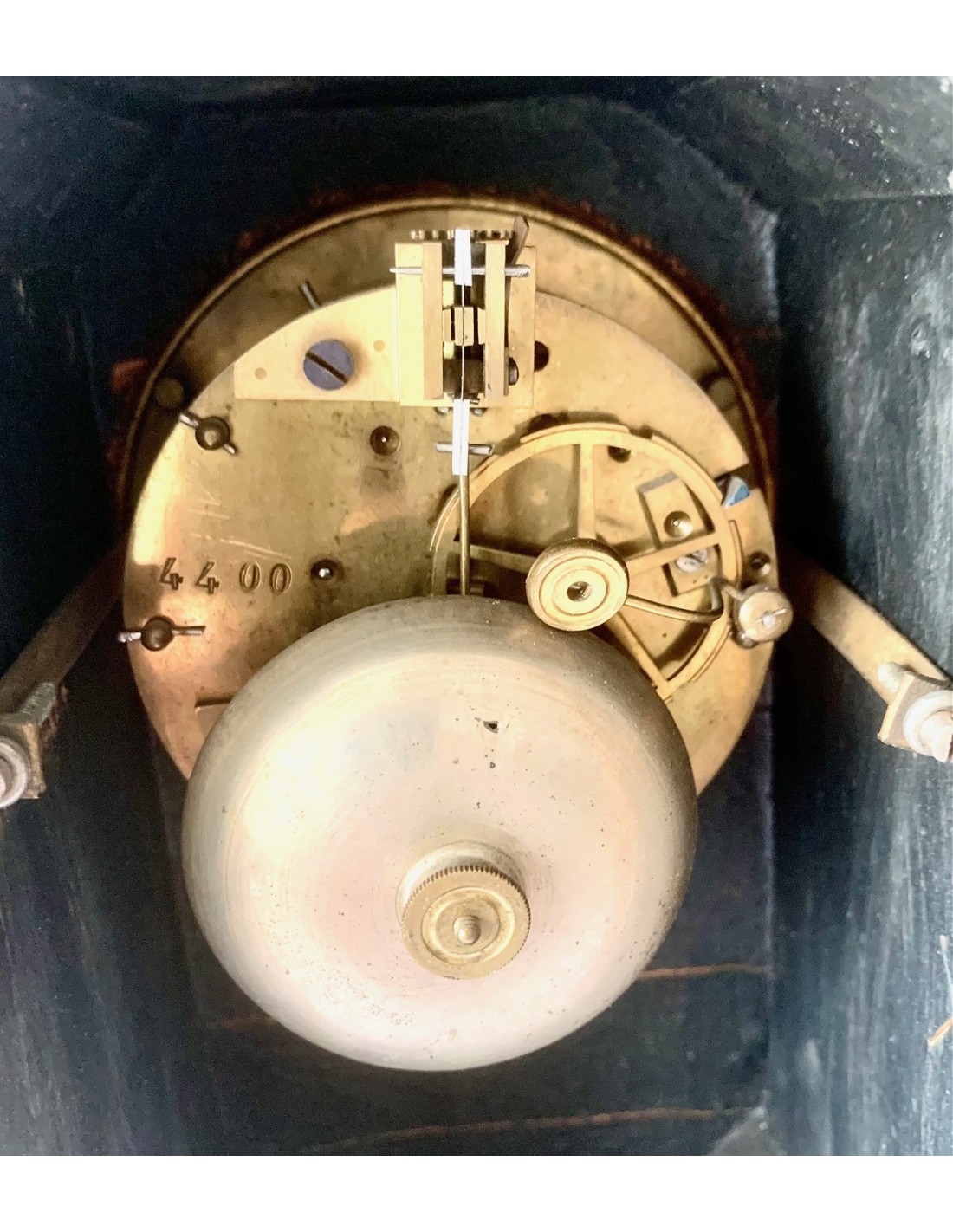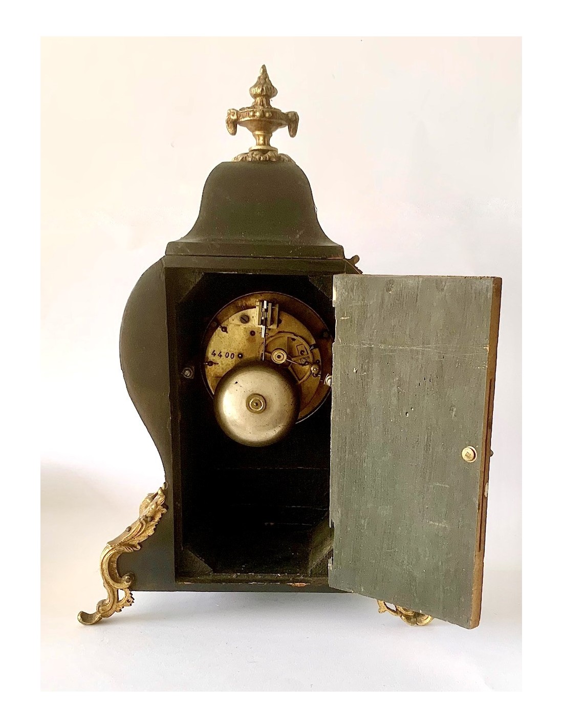 L’orologio appoggia su quattro piedi di bronzo e termina nella parte superiore con una coppa anch’essa di bronzo. L’orologio appoggia su una base realizzata con la stessa tecnica boulle di intarsi con ottone filettato. La meccanica Paris é in perfetto stato e funzionante. Tutto l’insieme é in ottimo stato di conservazione.