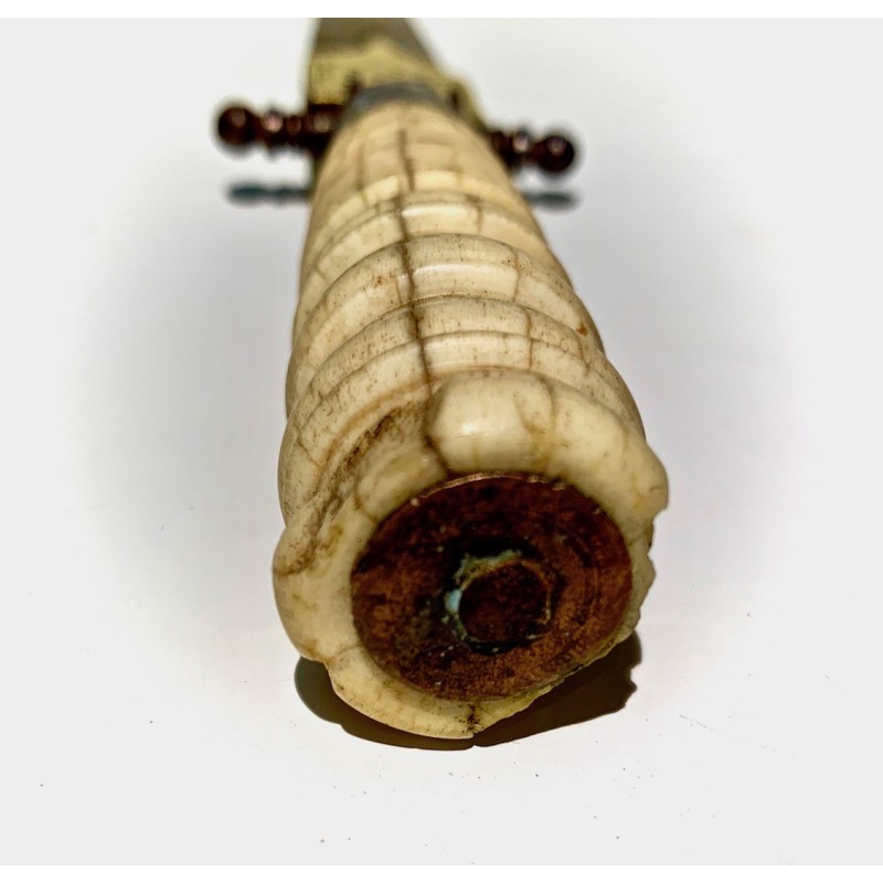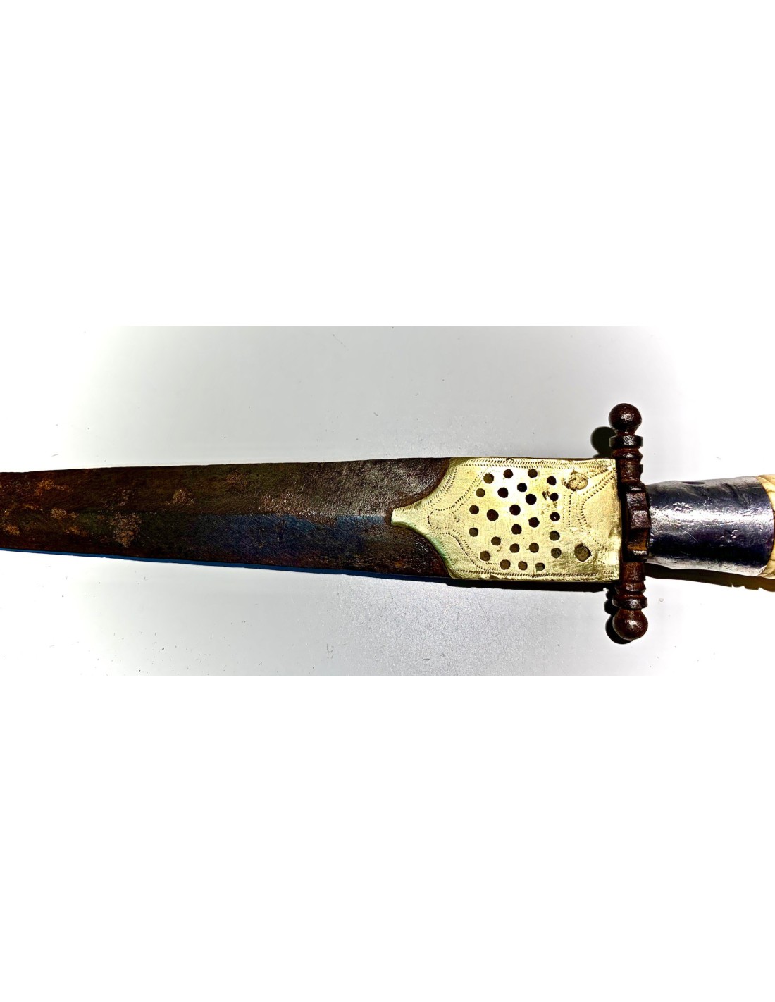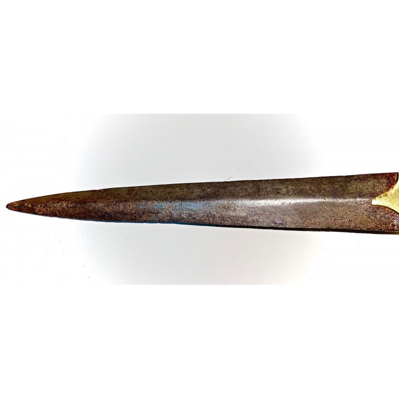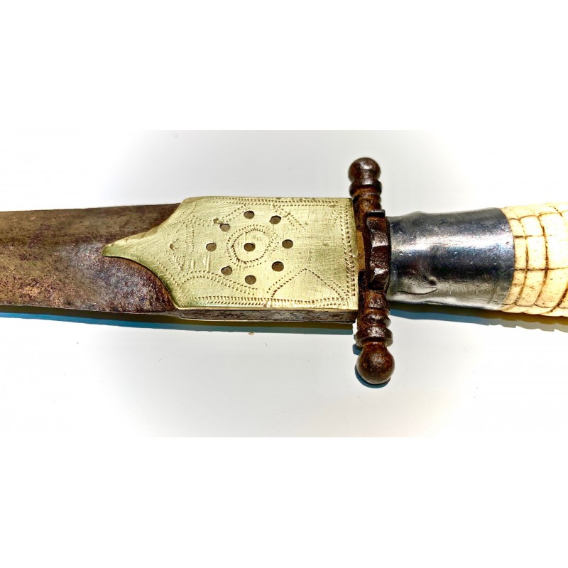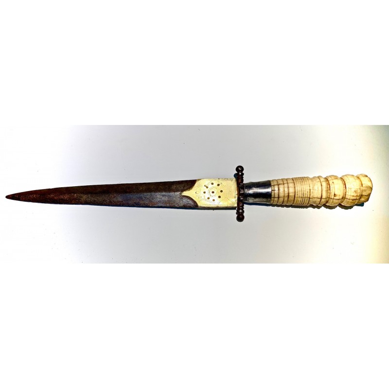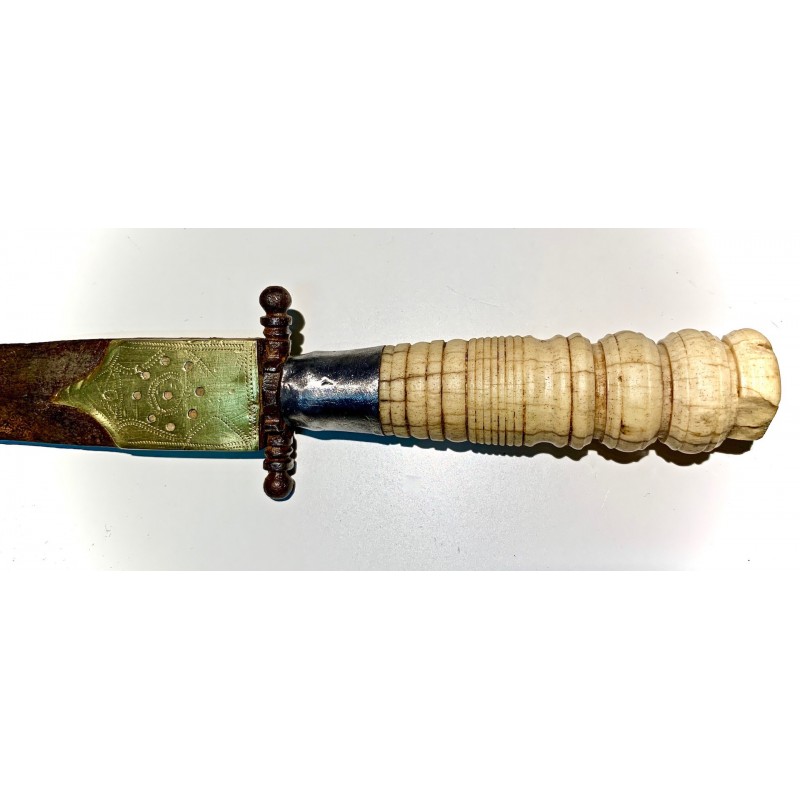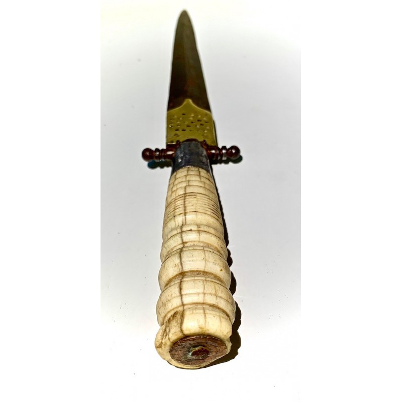 Antico pugnale della metà del XIX secolo, Spagna, lama di acciaio (bella patina), decorazioni di ottone cesellato e traforato nella prima parte della lama, manico di osso tornito molto lavorato, piccola rottura nell’estremitá ma in generale buono stato di conservazione.
