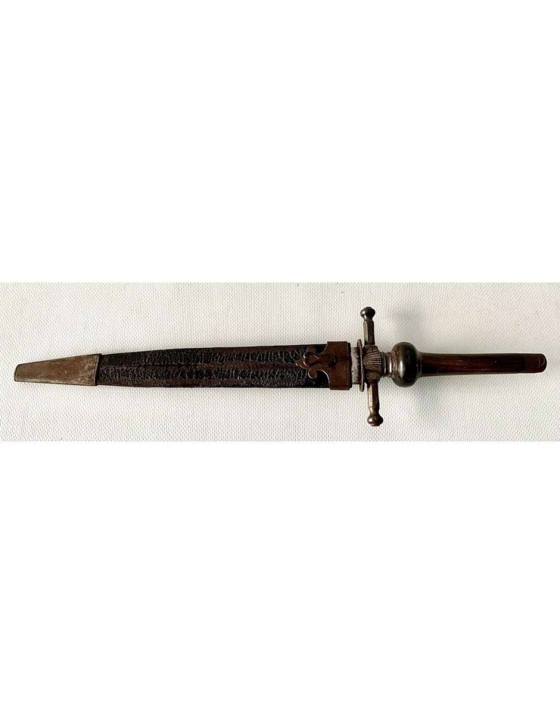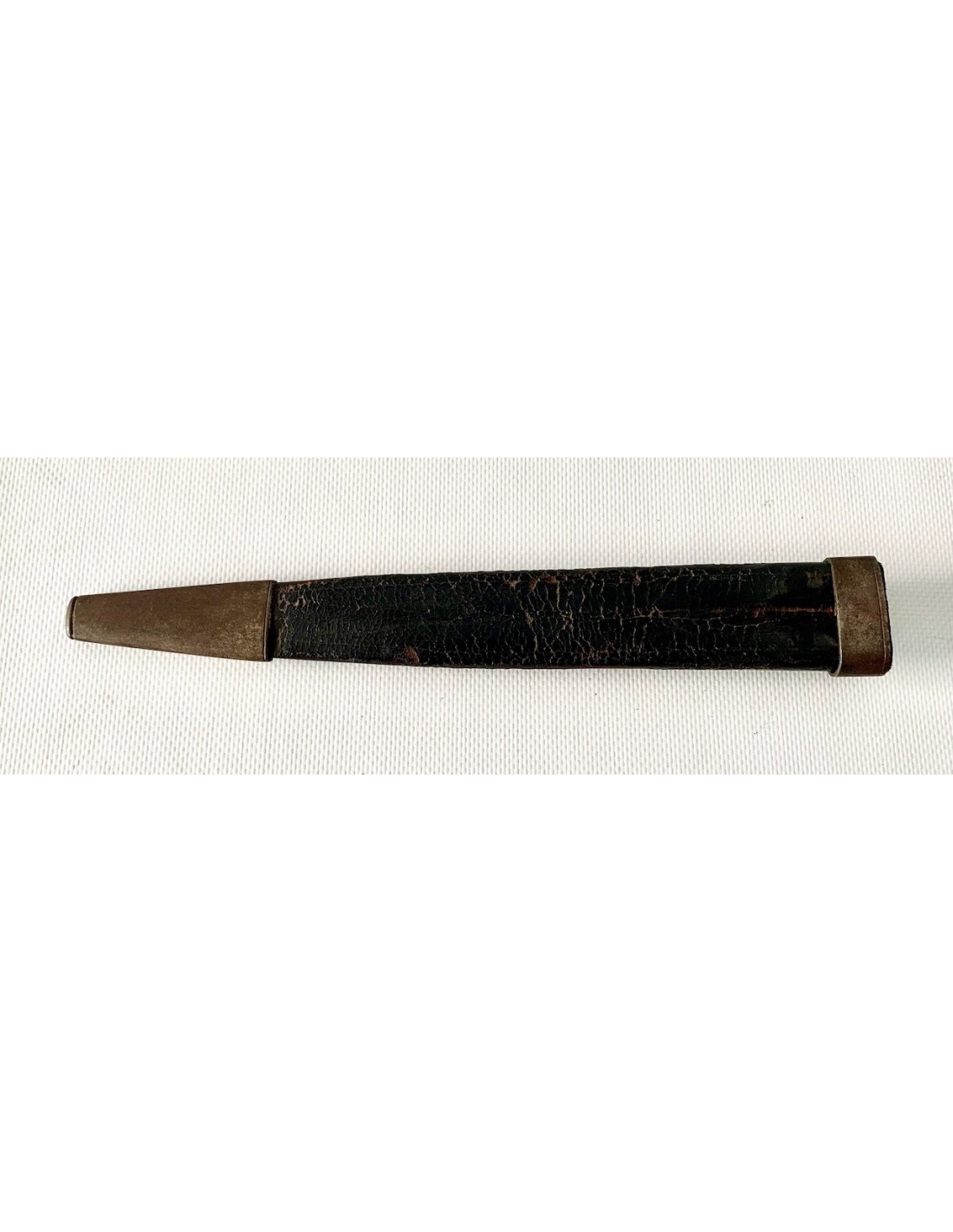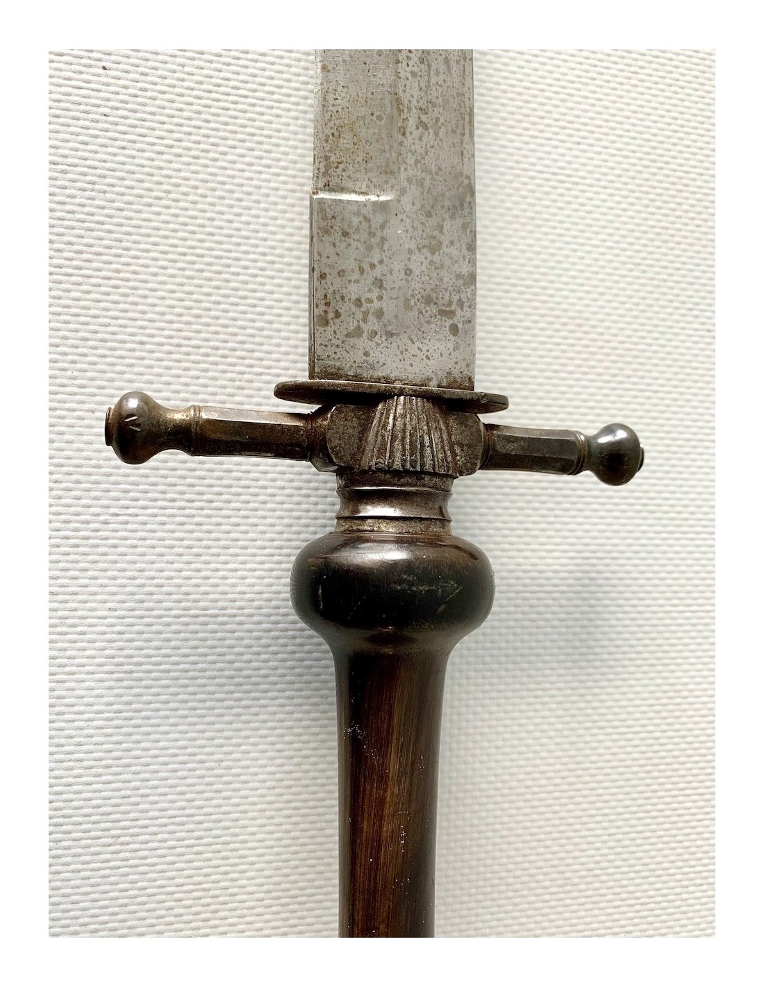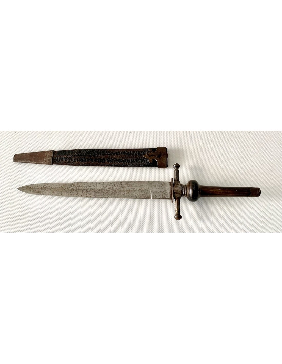 Baionetta a tappo della prima metà del XIX secolo, lama di acciaio e impugnatura in corno di bue, fodero di cuoio con estremità di rinforzo in ferro, qualche punto di ossidazione e patina normale d’ época, buono stato di conservazione generale.