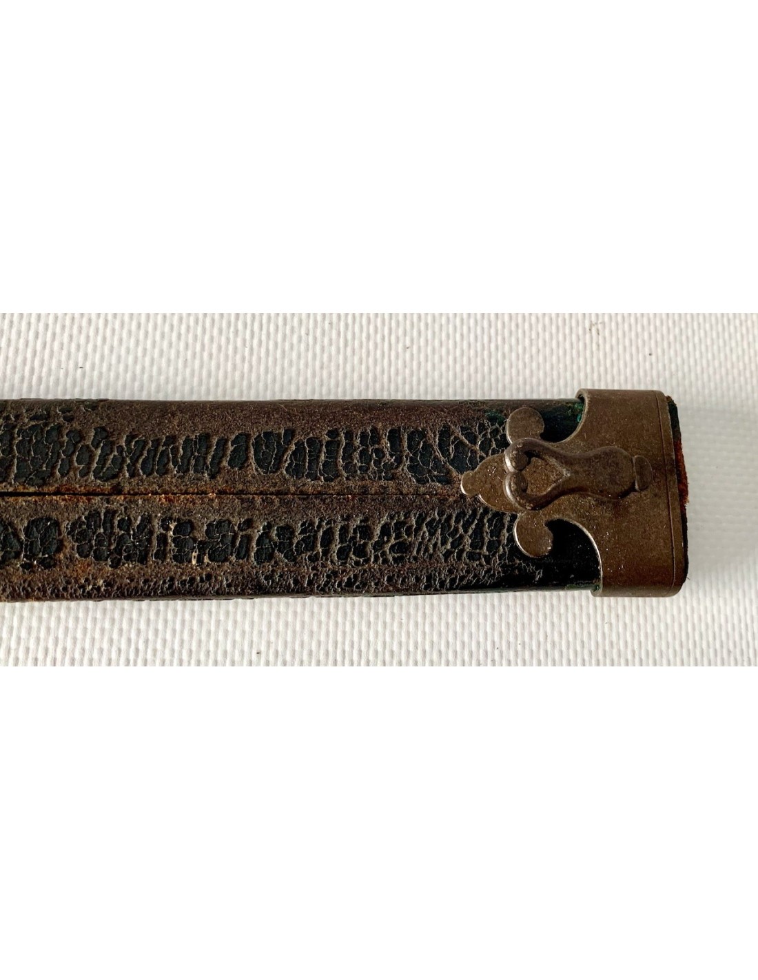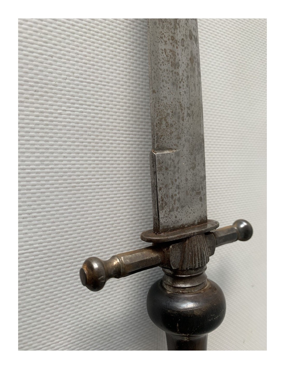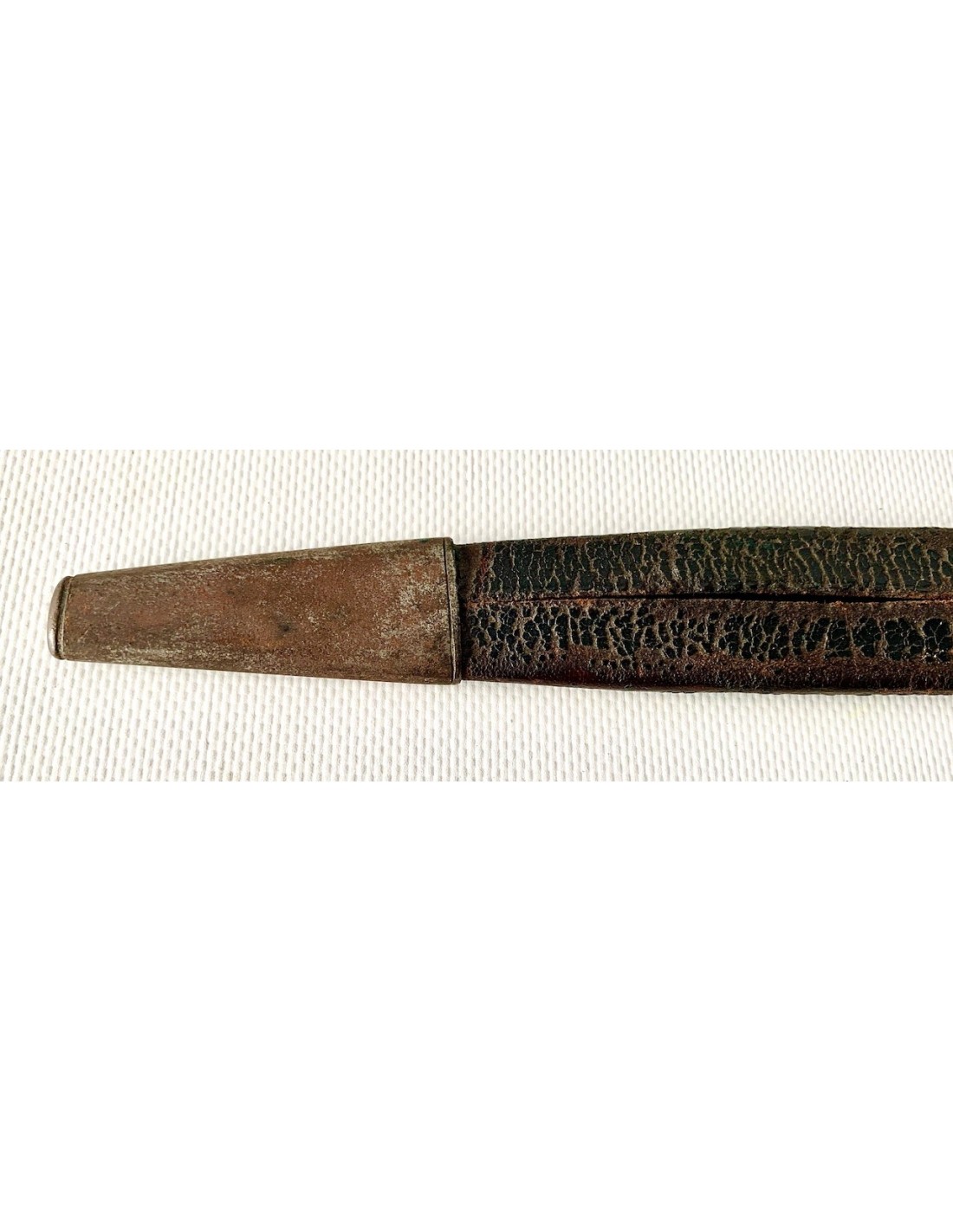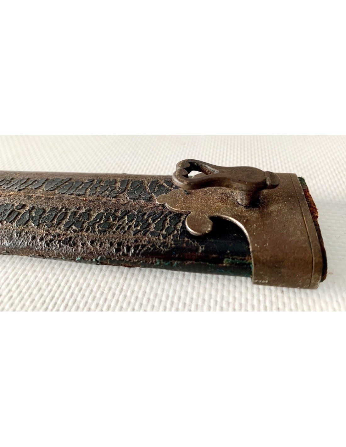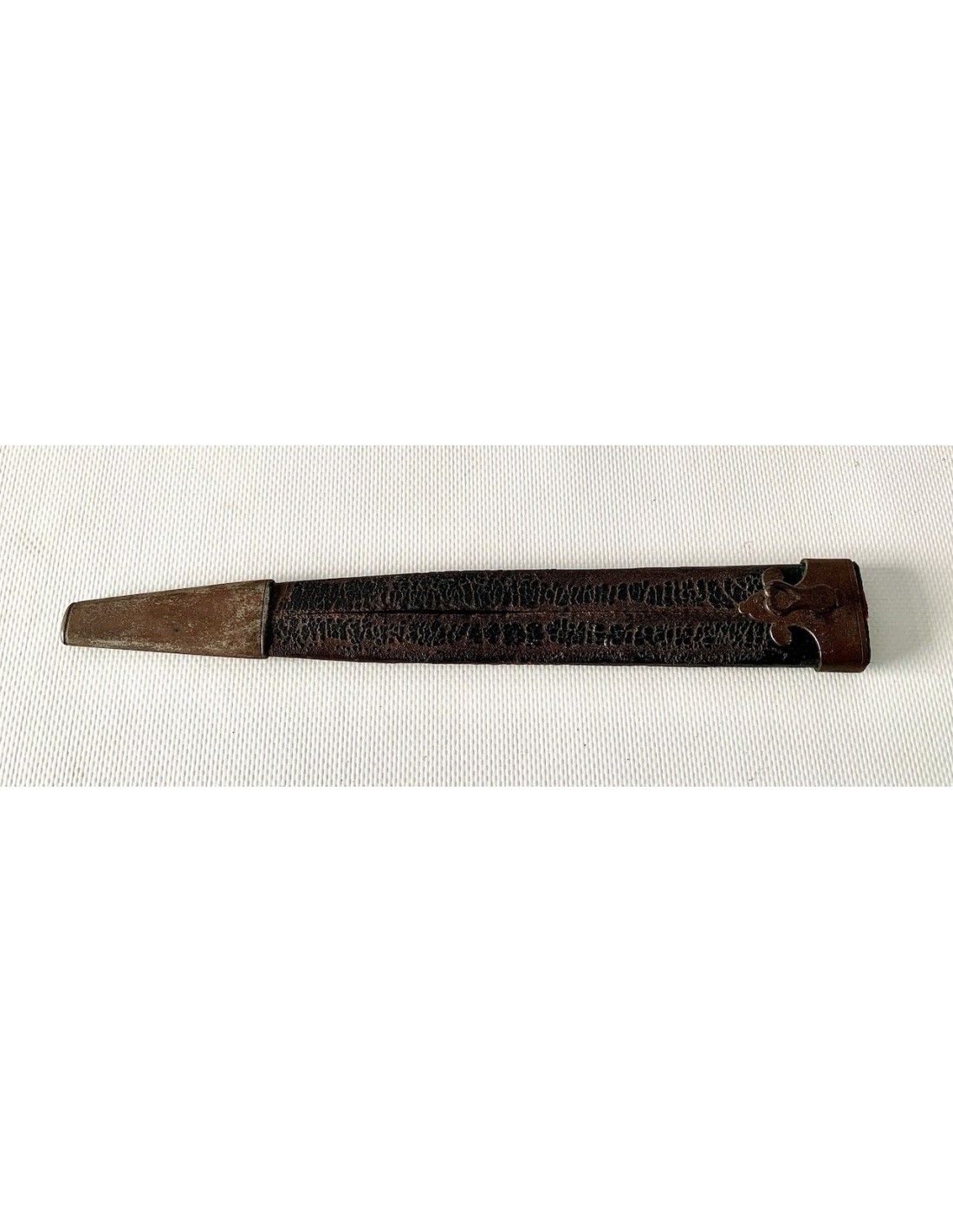 Baionetta a tappo della prima metà del XIX secolo, lama di acciaio e impugnatura in corno di bue, fodero di cuoio con estremità di rinforzo in ferro, qualche punto di ossidazione e patina normale d’ época, buono stato di conservazione generale.