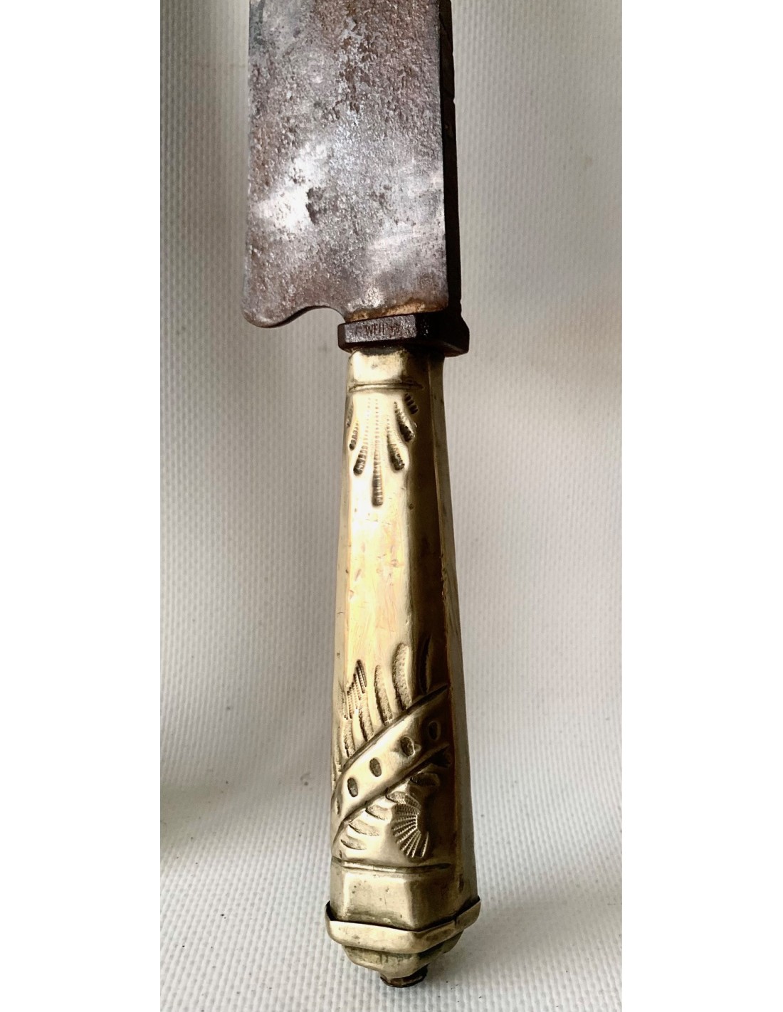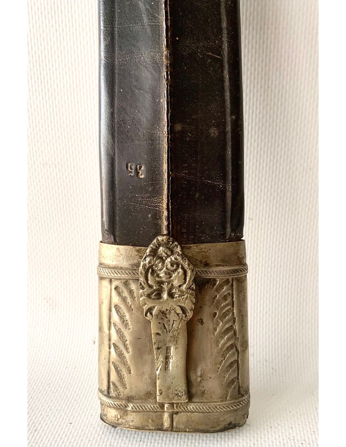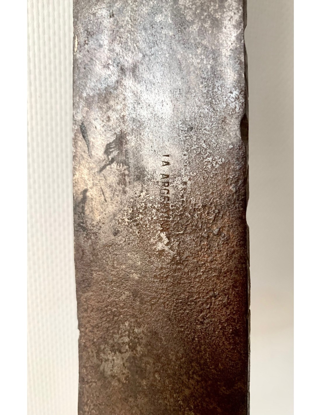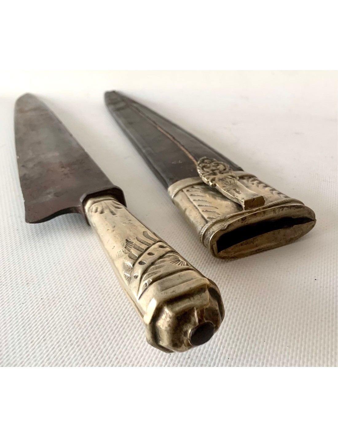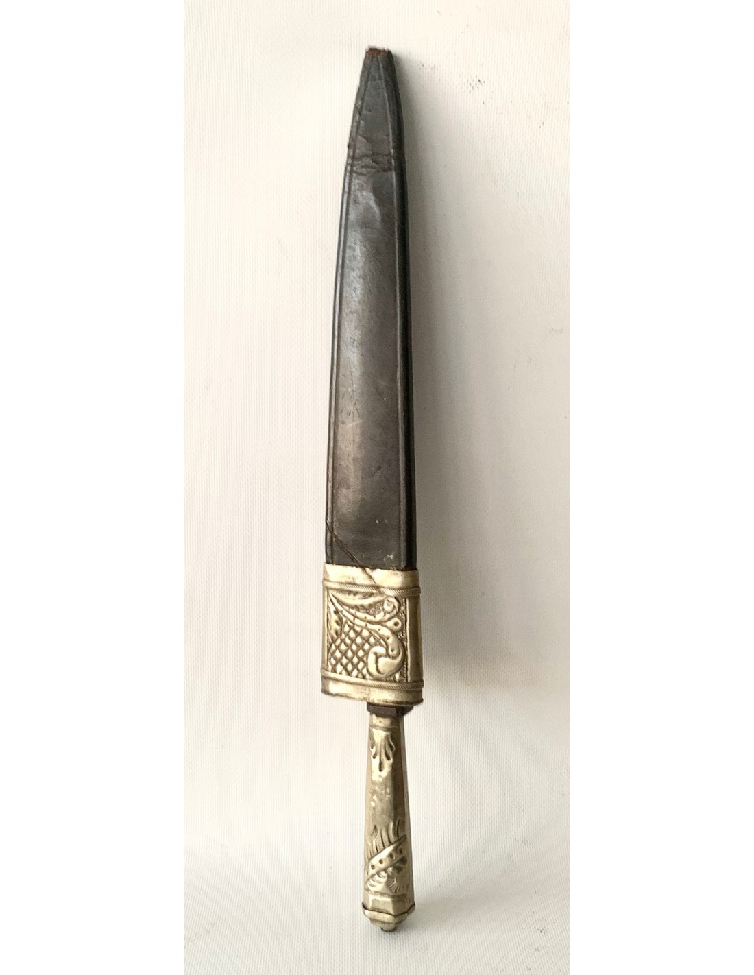 Coltello pugnale facon argentino, principio del XX secolo (1900-1920 circa), impugnatura di alpaca cesellata, fodero in cuoio con imboccatura in alpaca cesellata, bella lama con patina originale e incisioni marcate, buono stato di conservazione generale.
