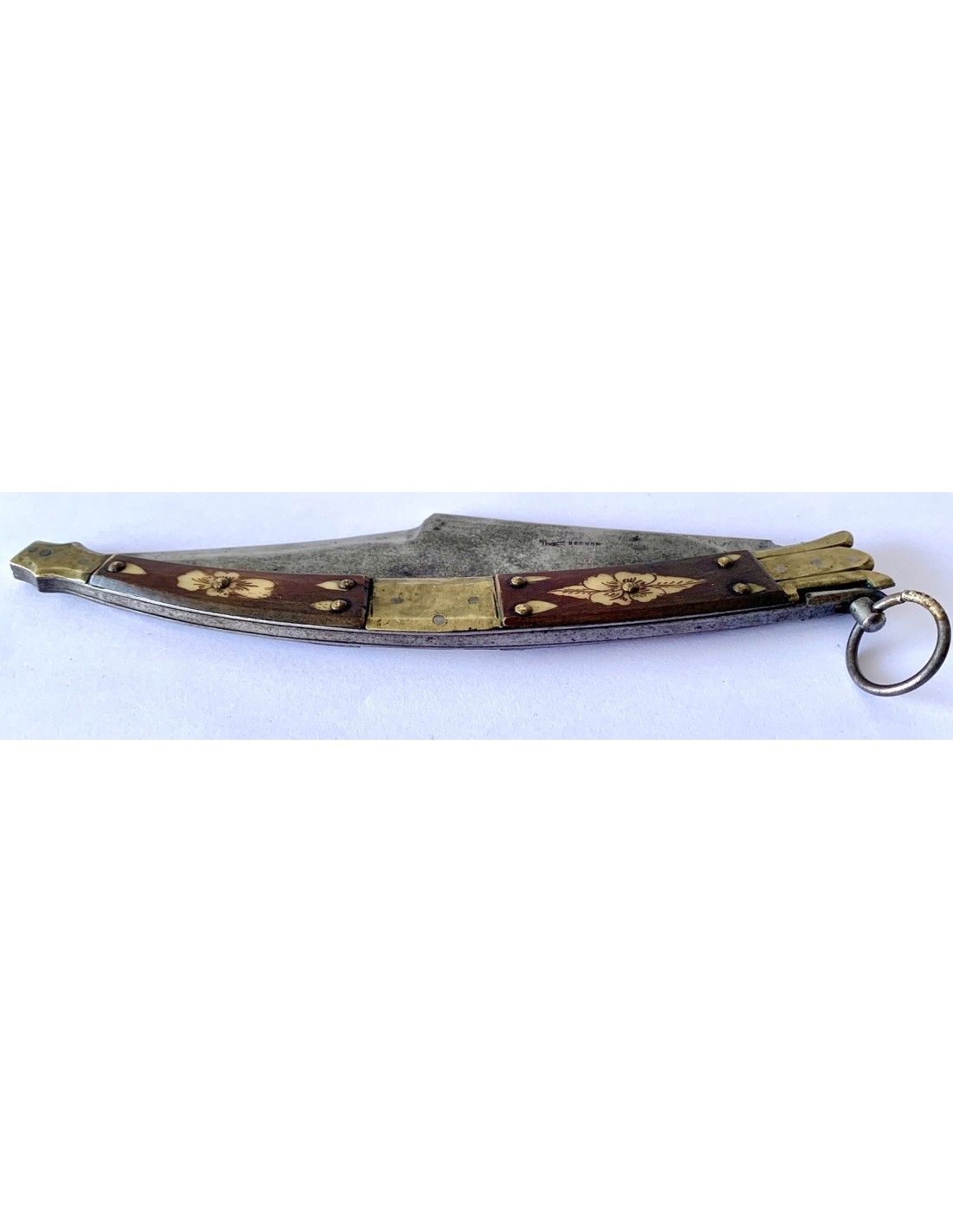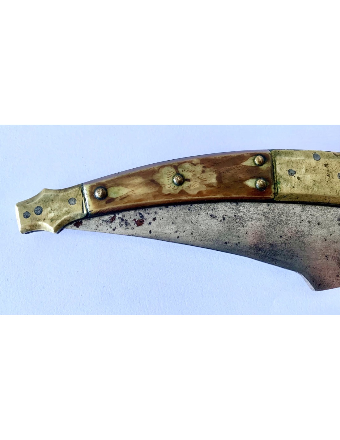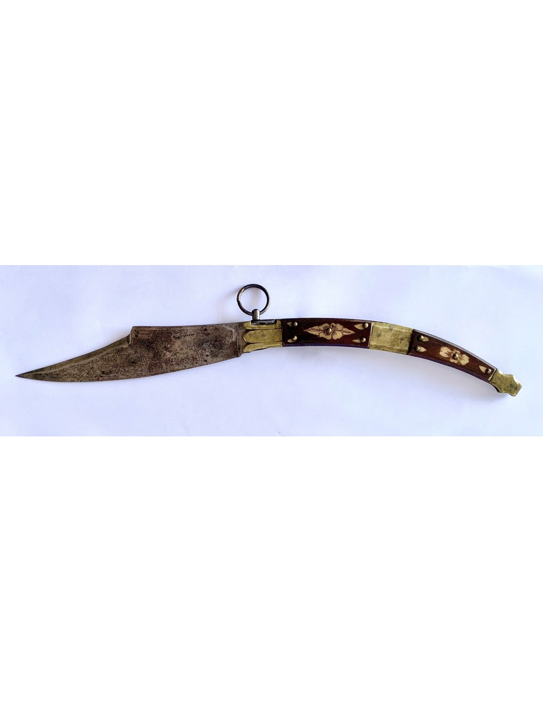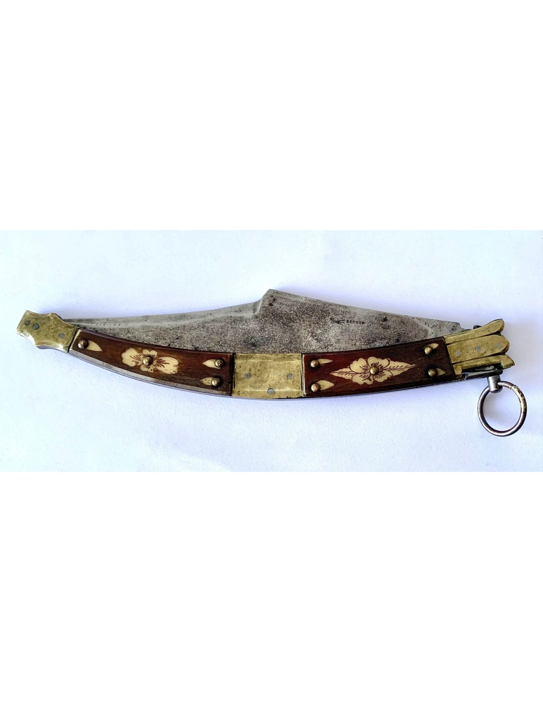 Coltello a serramanico francese del XIX secolo, con manico in osso e ottone, con due sezioni di osso dipinto con decorazioni floreali intercalate da tre parti di ottone, due nelle estremità e uno centrale. Tutto consolidato e ancorato da rivetti in ottone. Lama di acciaio marcata “Bechon Gorce”. Buono stato di conservazione.