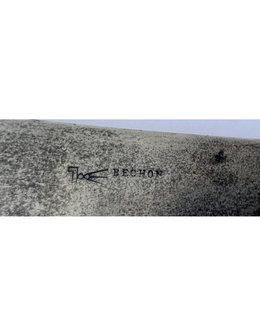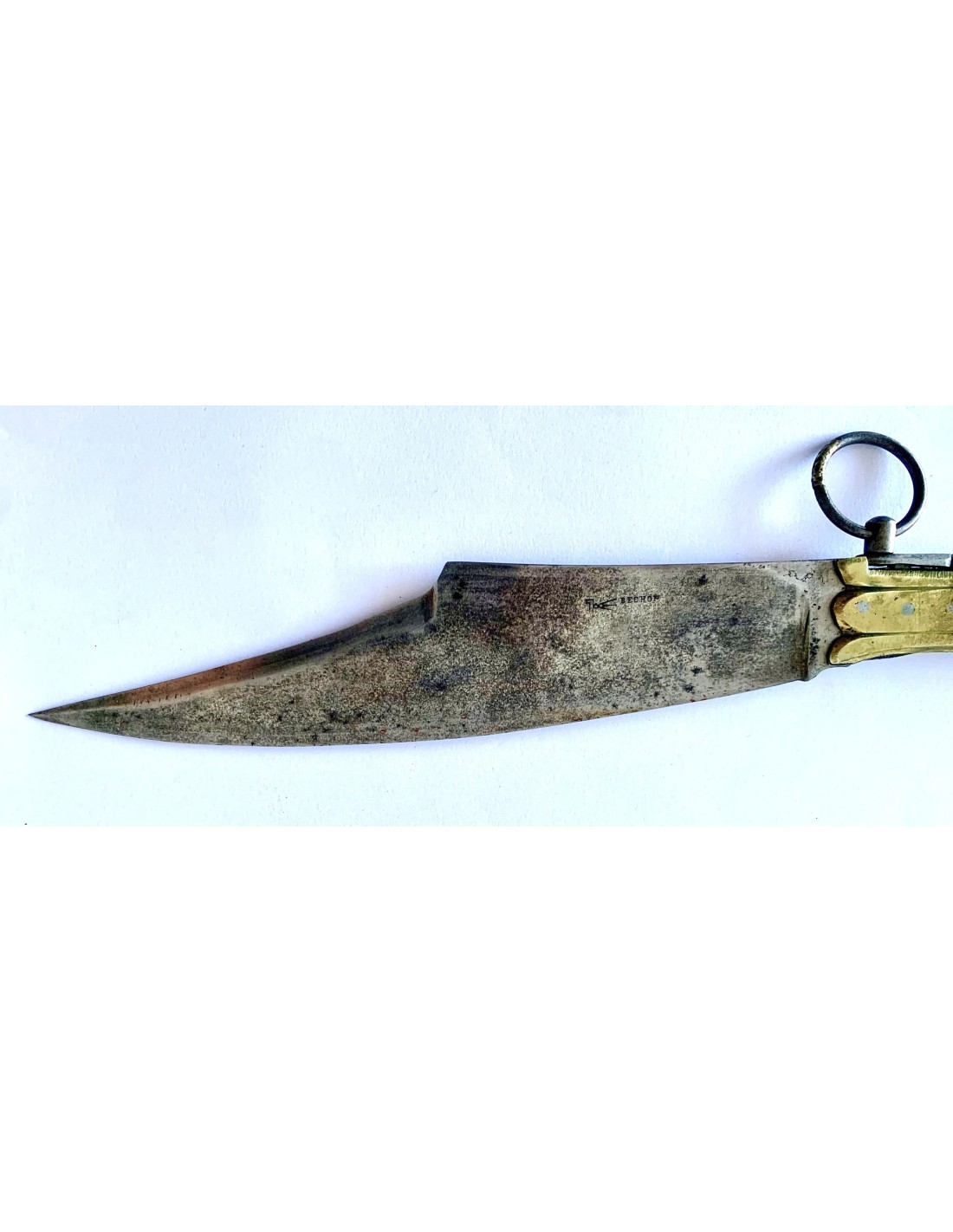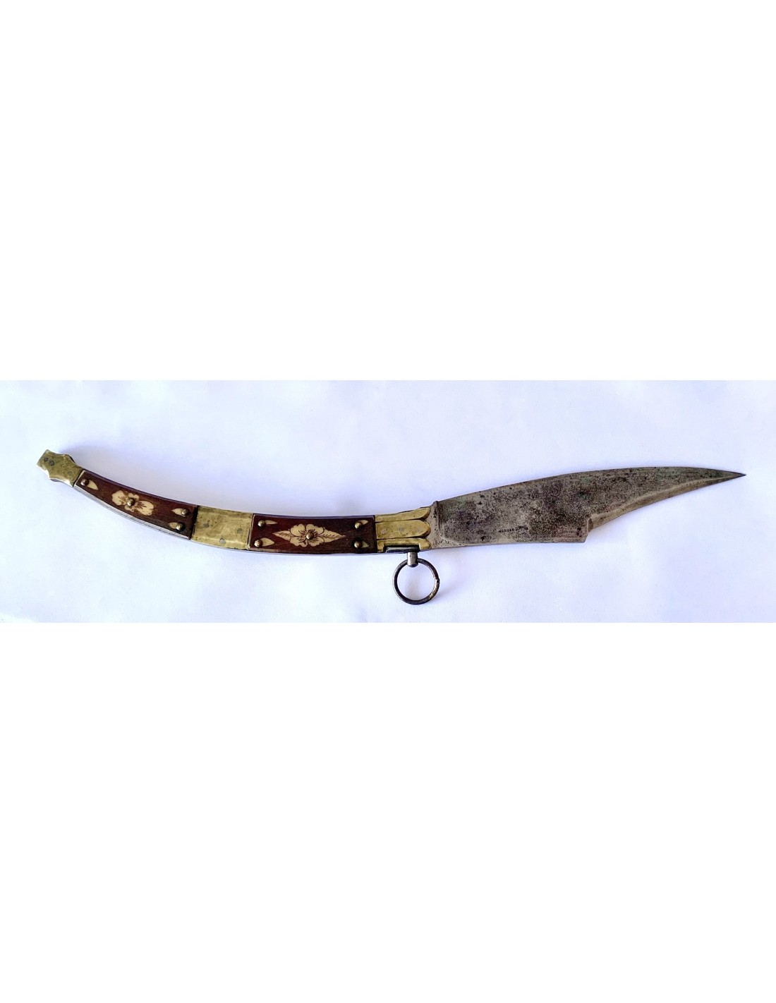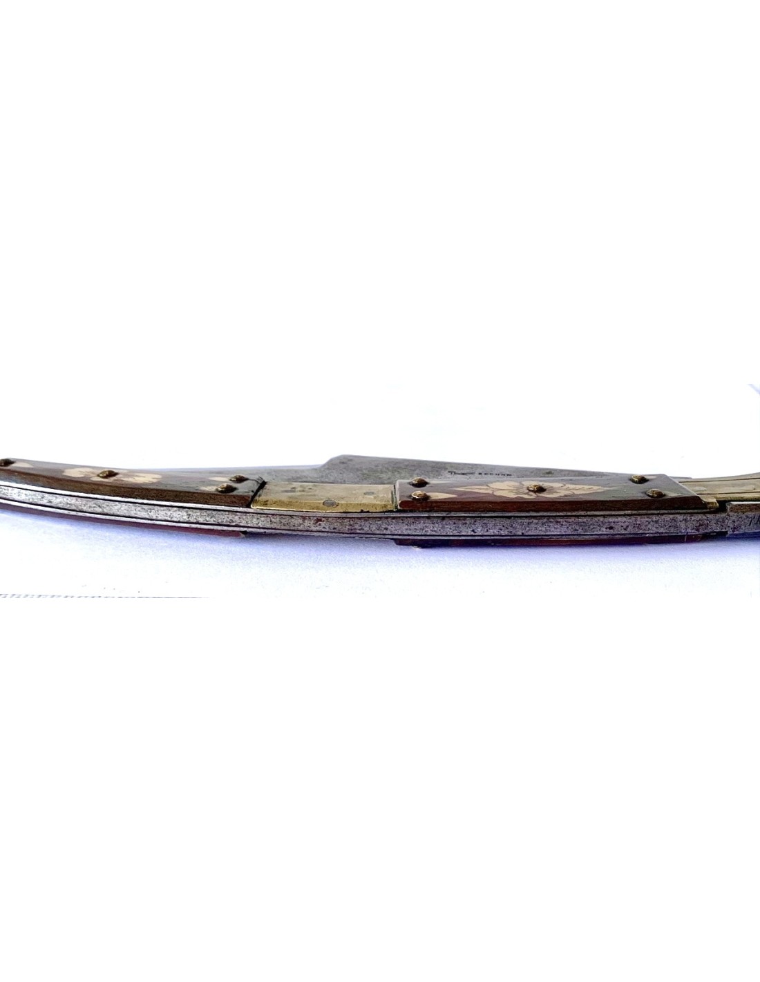 Coltello a serramanico francese del XIX secolo, con manico in osso e ottone, con due sezioni di osso dipinto con decorazioni floreali intercalate da tre parti di ottone, due nelle estremità e uno centrale. Tutto consolidato e ancorato da rivetti in ottone. Lama di acciaio marcata “Bechon Gorce”. Buono stato di conservazione.