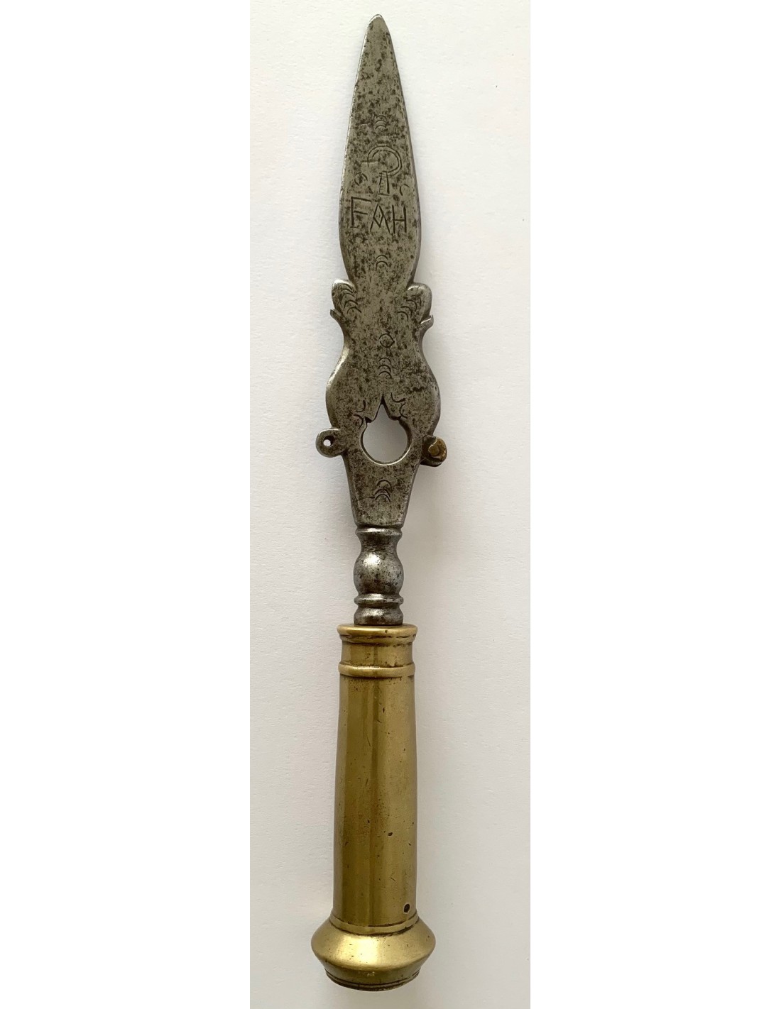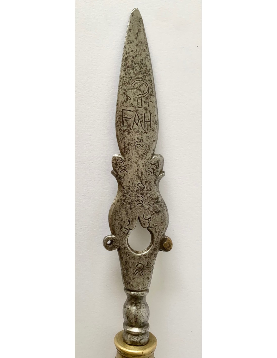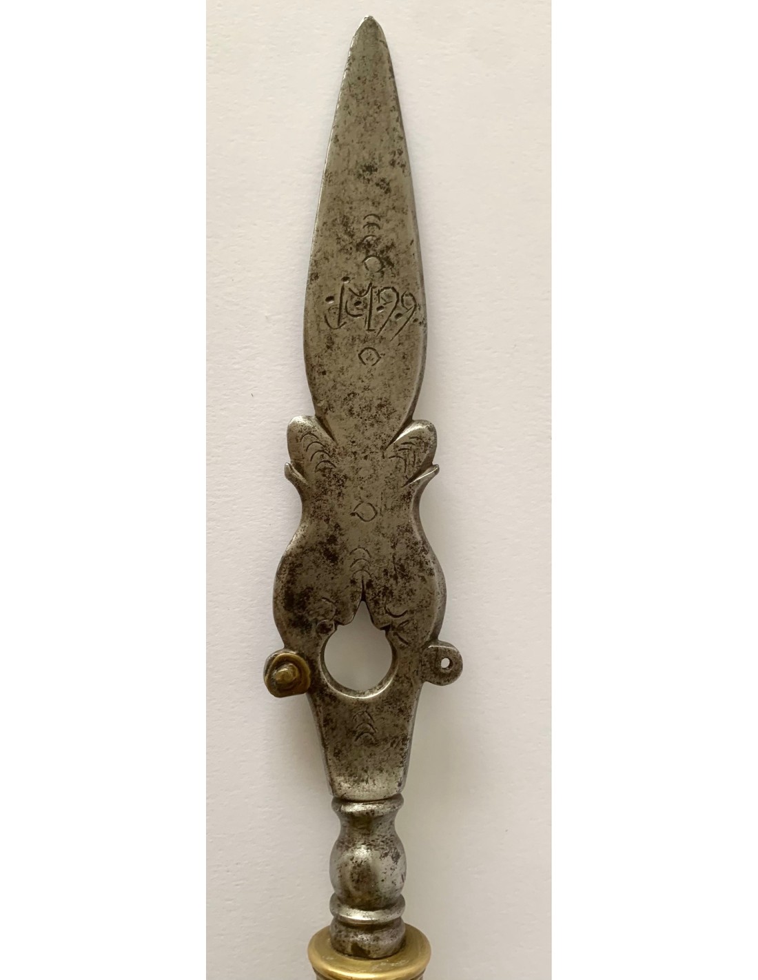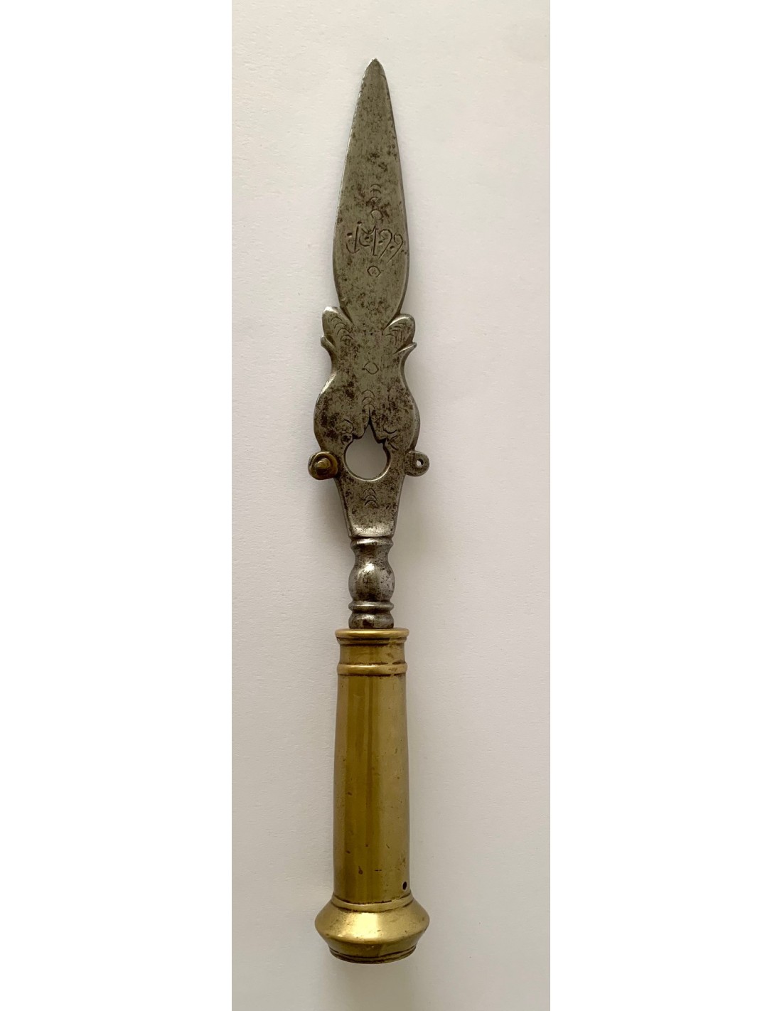 Antica punta di lancia (sponton), di acciaio e bronzo, della fine del XVIII secolo, Francia, incisa nei due lati e datata 1799. Utilizzata dalle guardie di mansioni di campagna di aristocratici francesi per sorvegliare i loro vigneti e le loro proprietà nella zona della valle della Loira.