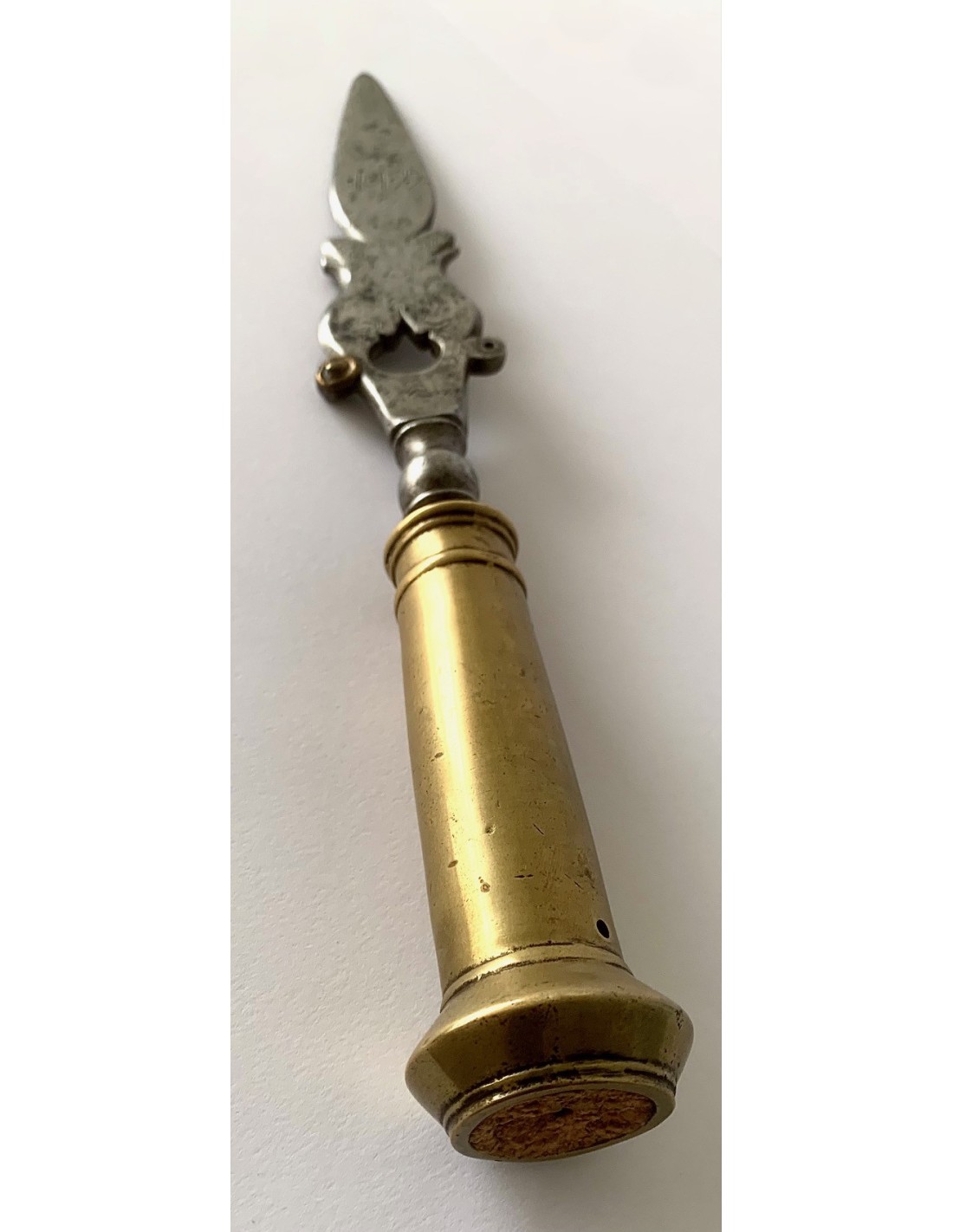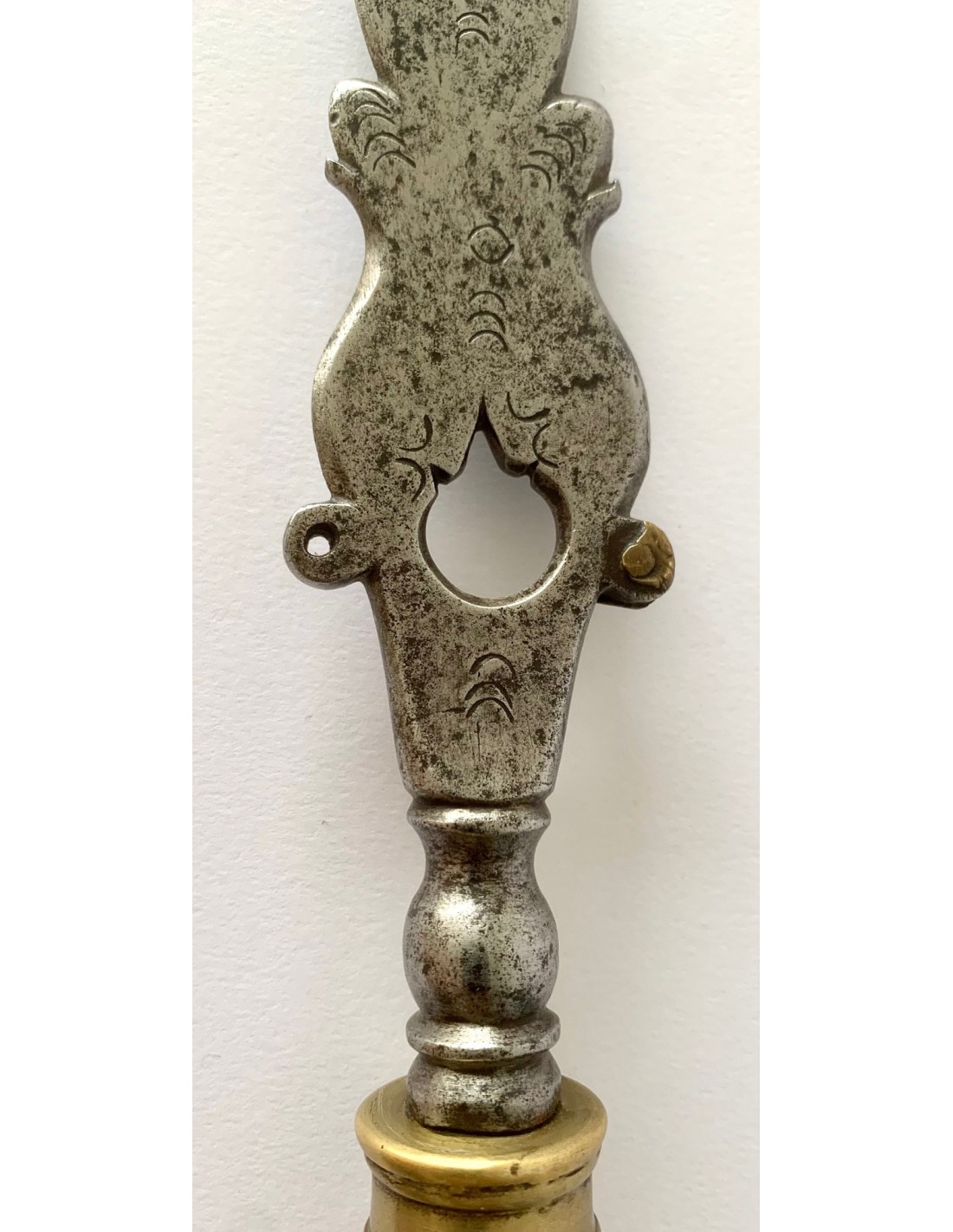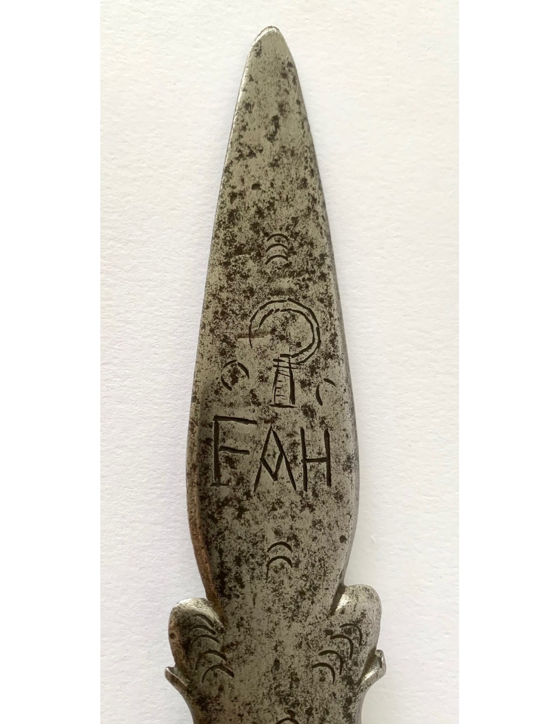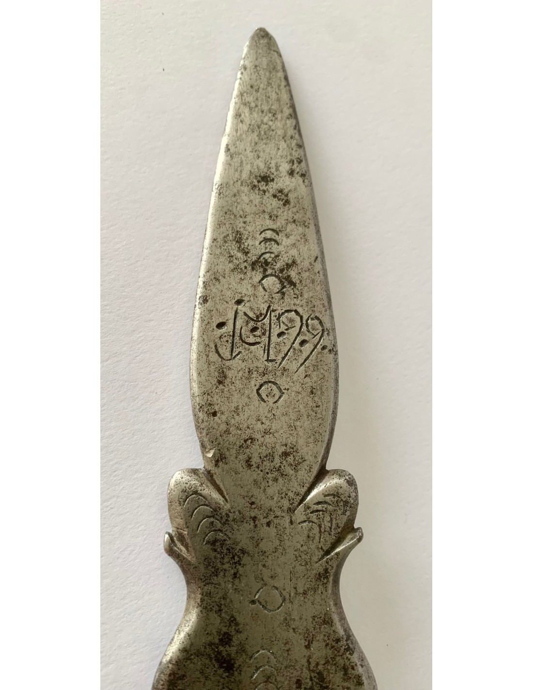 Antica punta di lancia (sponton), di acciaio e bronzo, della fine del XVIII secolo, Francia, incisa nei due lati e datata 1799. Utilizzata dalle guardie di mansioni di campagna di aristocratici francesi per sorvegliare i loro vigneti e le loro proprietà nella zona della valle della Loira.
