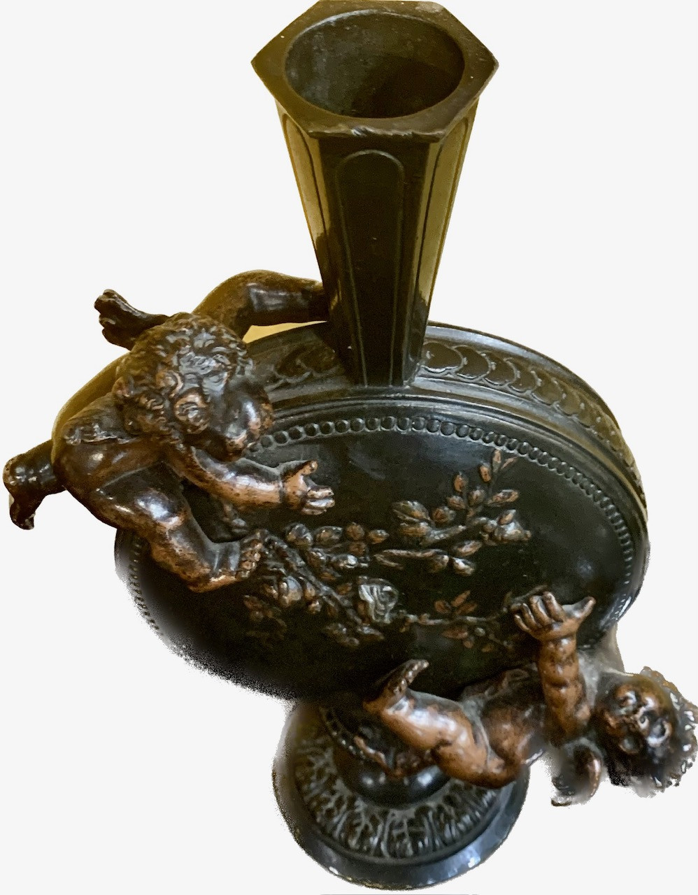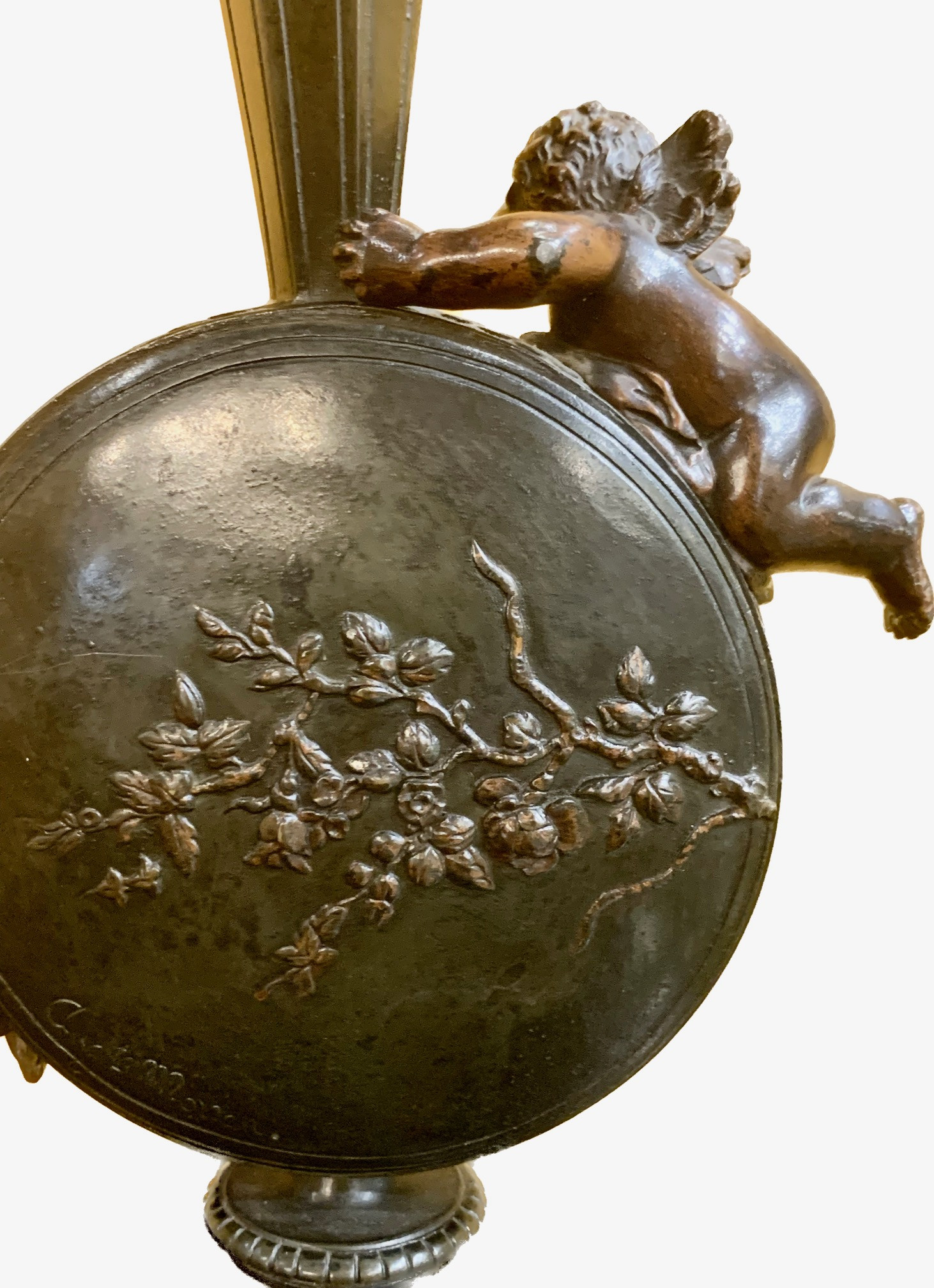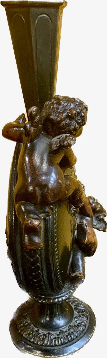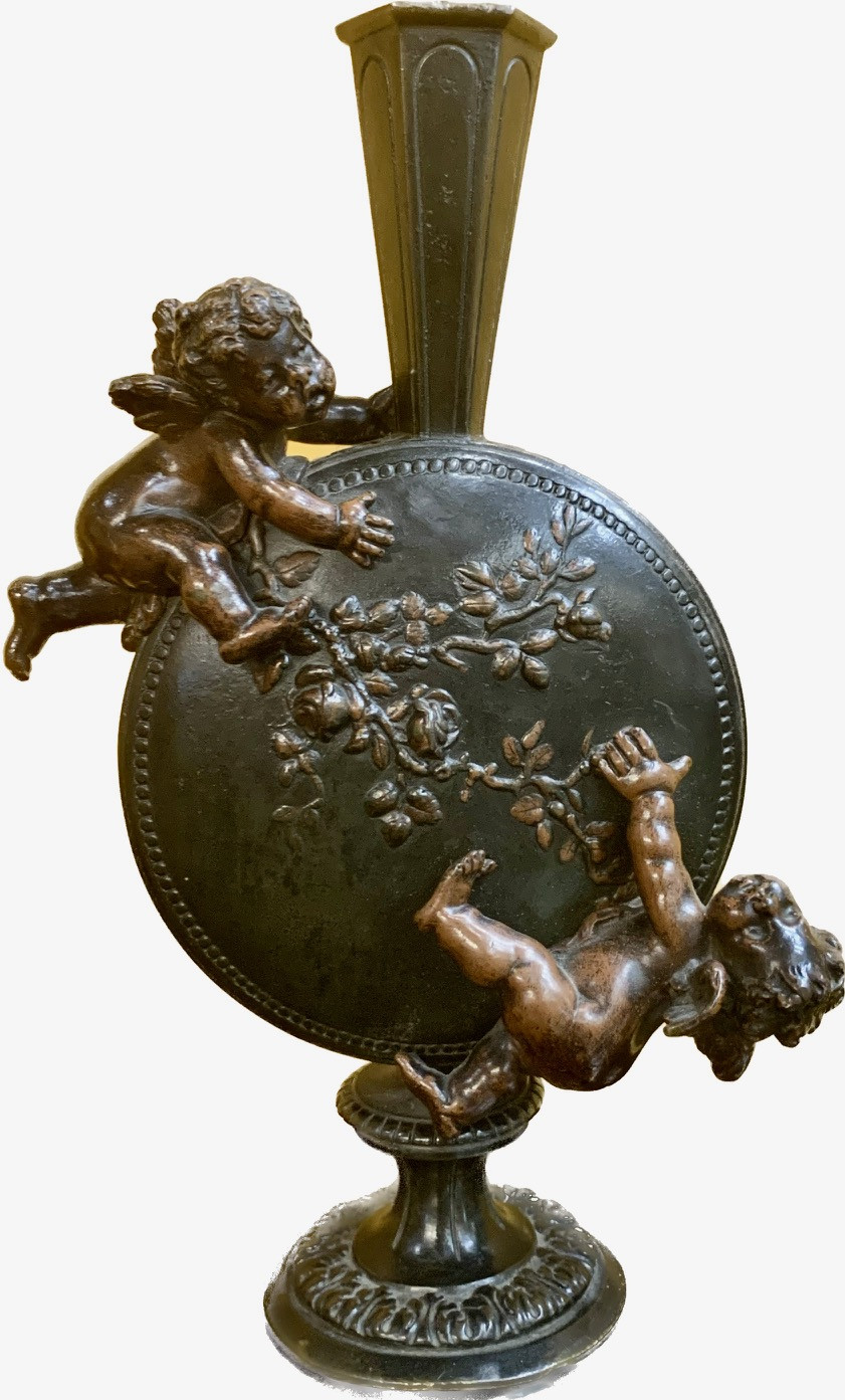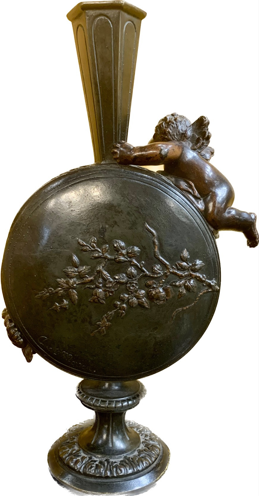 Vaso/ candeliere di bronzo della fine del XIX secolo (1890 circa) dello scultore francese Auguste Moreau (Dijón 1834 - 1917 Malesherbes). Candeliere/ vaso con base rotonda di forma classica con bassi rilievi di foglie, la parte centrale rotonda con due angeli sostenendosi uno nella parte superiore e l’latro nella parte inferiore del margine, centralmente in basso rilievo un ramo di rose in ambi i lati. Il collo superiore é di forma esagonale e ha una cavità di cinque centimetri, pertanto il suo interno é di bronzo massiccio.
