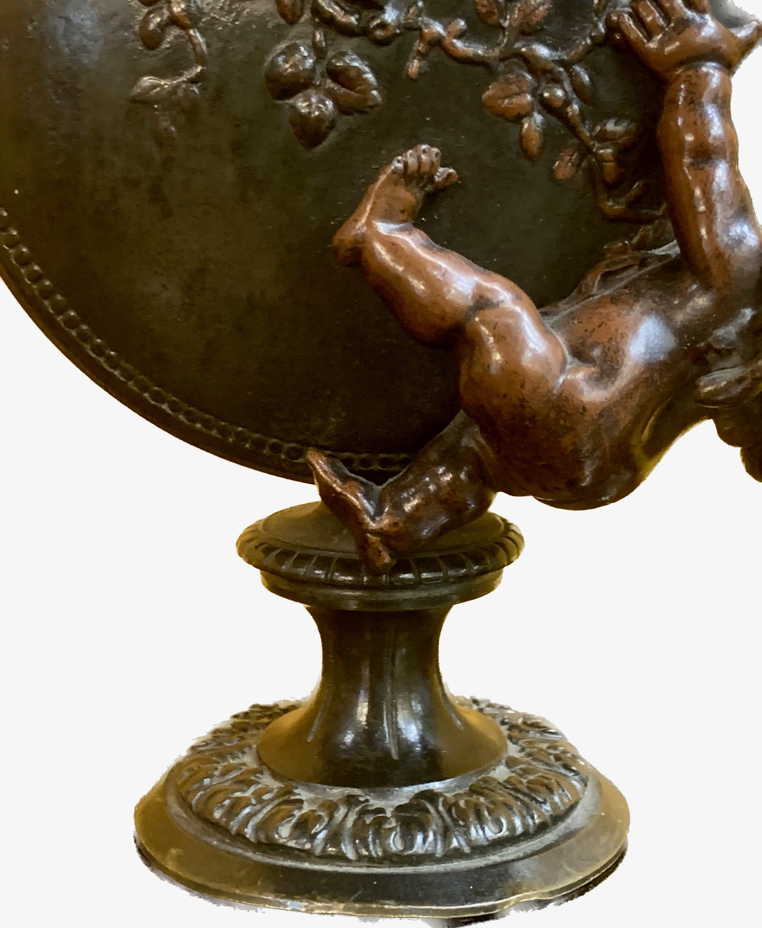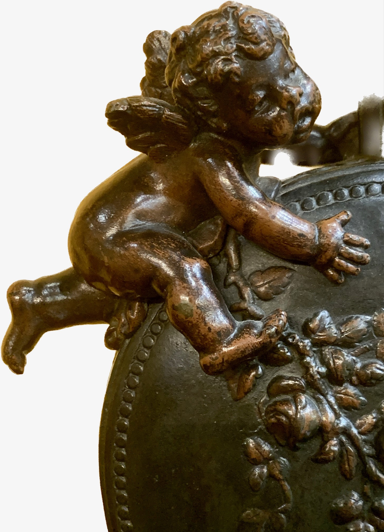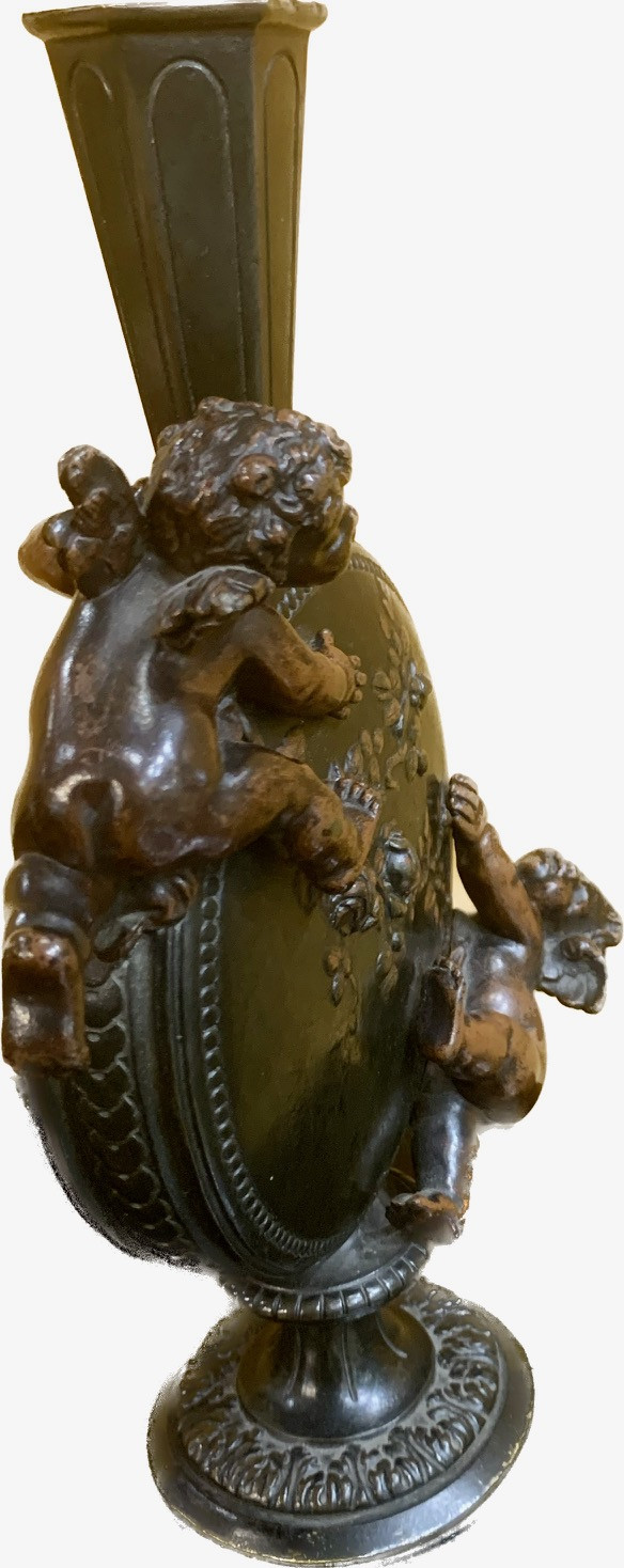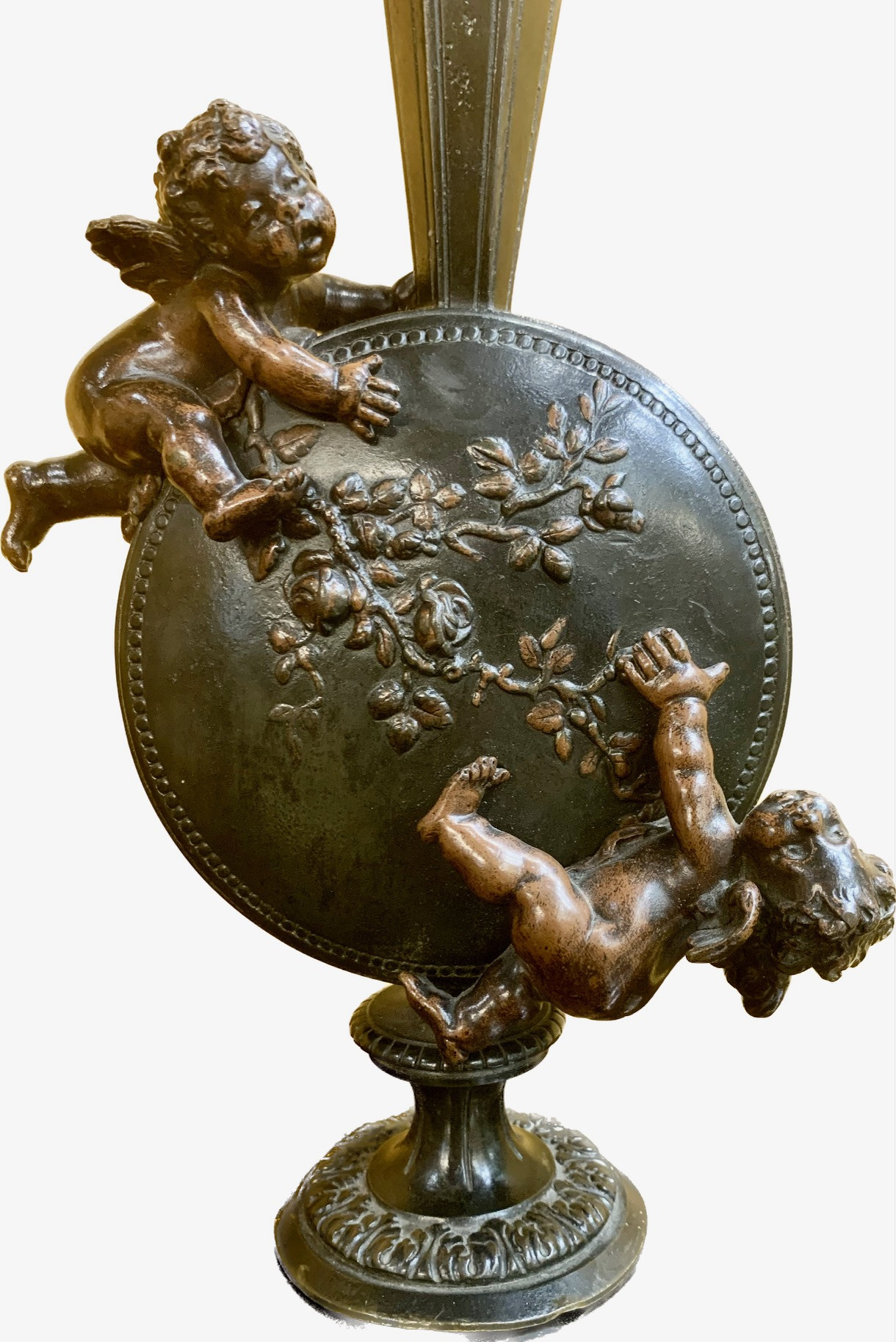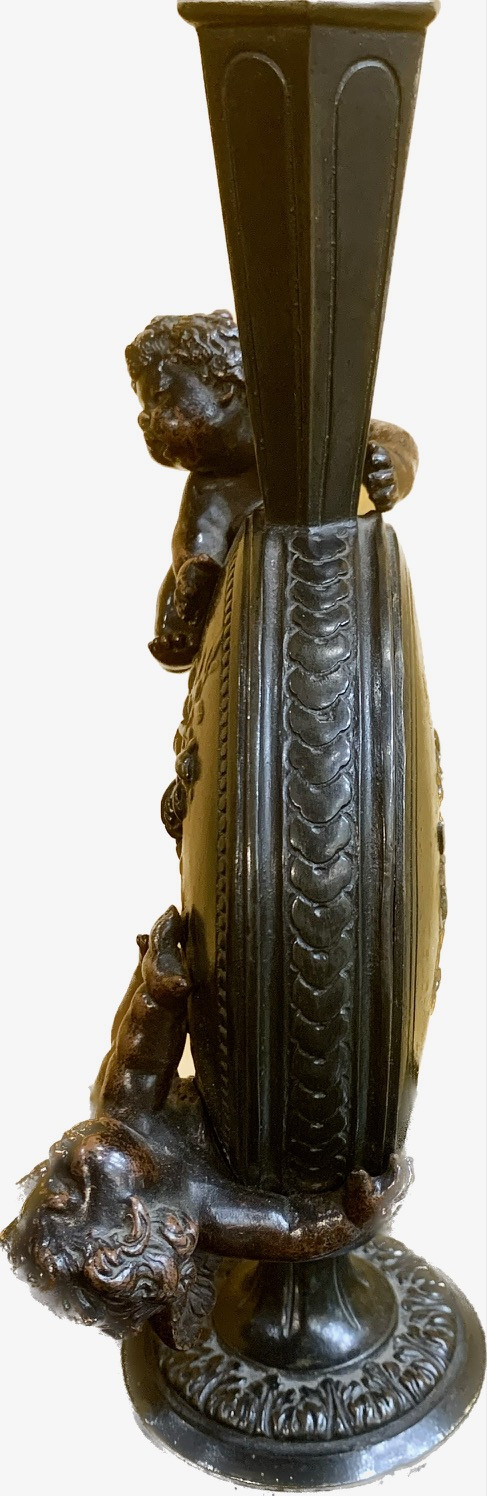 Vaso/ candeliere di bronzo della fine del XIX secolo (1890 circa) dello scultore francese Auguste Moreau (Dijón 1834 - 1917 Malesherbes). Candeliere/ vaso con base rotonda di forma classica con bassi rilievi di foglie, la parte centrale rotonda con due angeli sostenendosi uno nella parte superiore e l’latro nella parte inferiore del margine, centralmente in basso rilievo un ramo di rose in ambi i lati. Il collo superiore é di forma esagonale e ha una cavità di cinque centimetri, pertanto il suo interno é di bronzo massiccio.