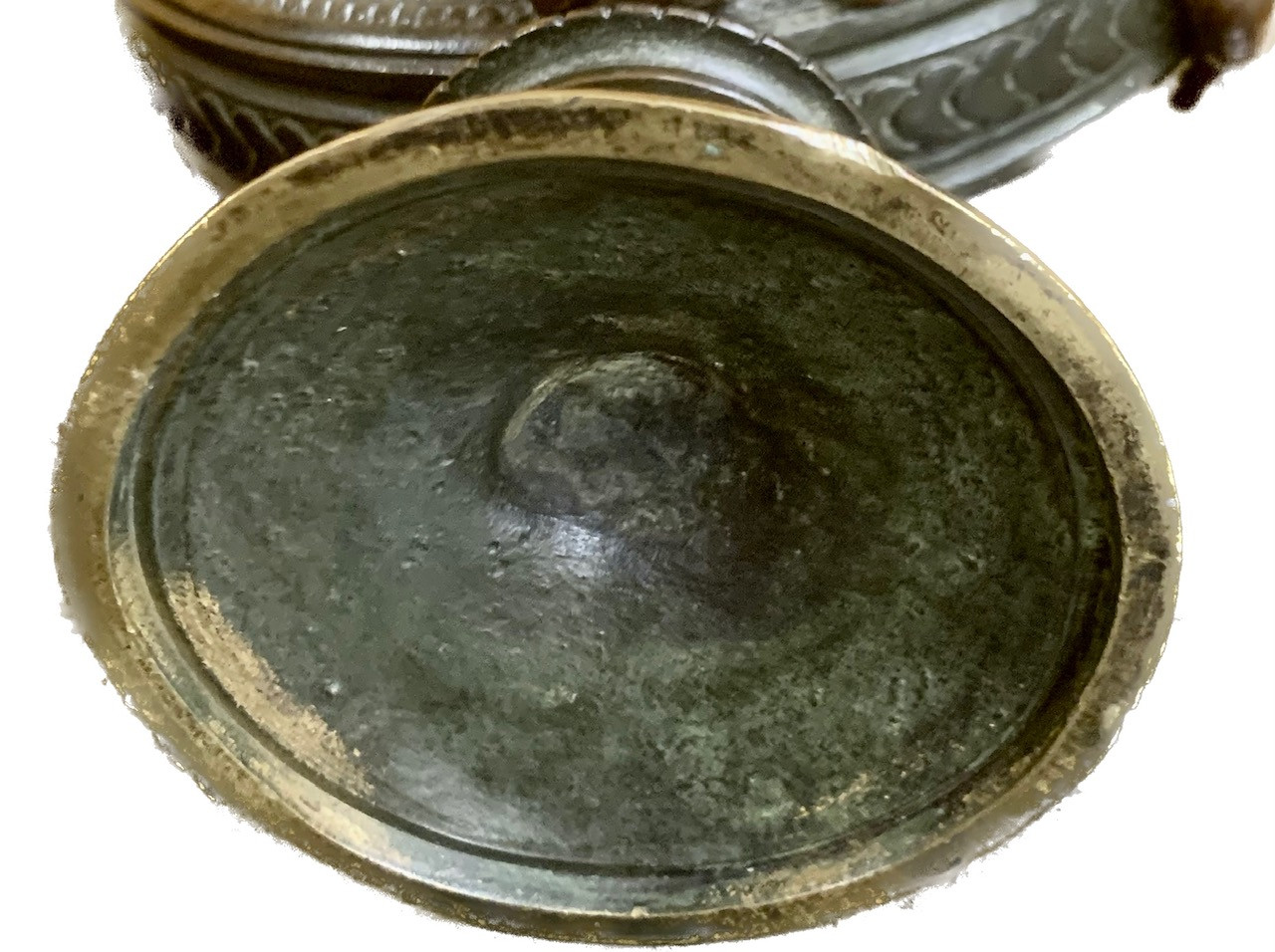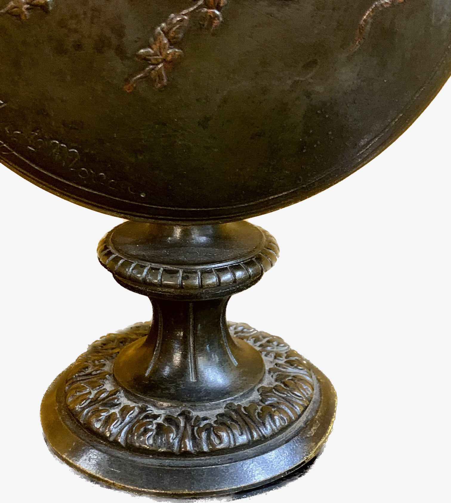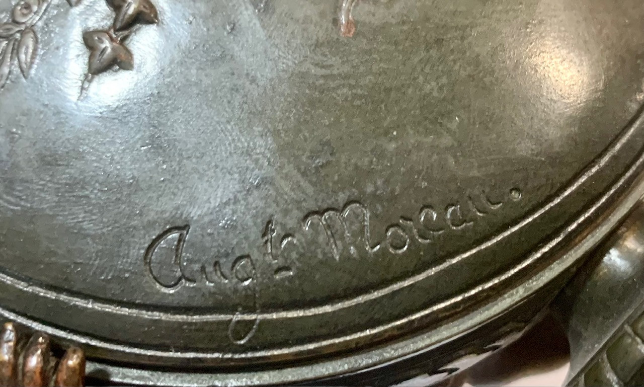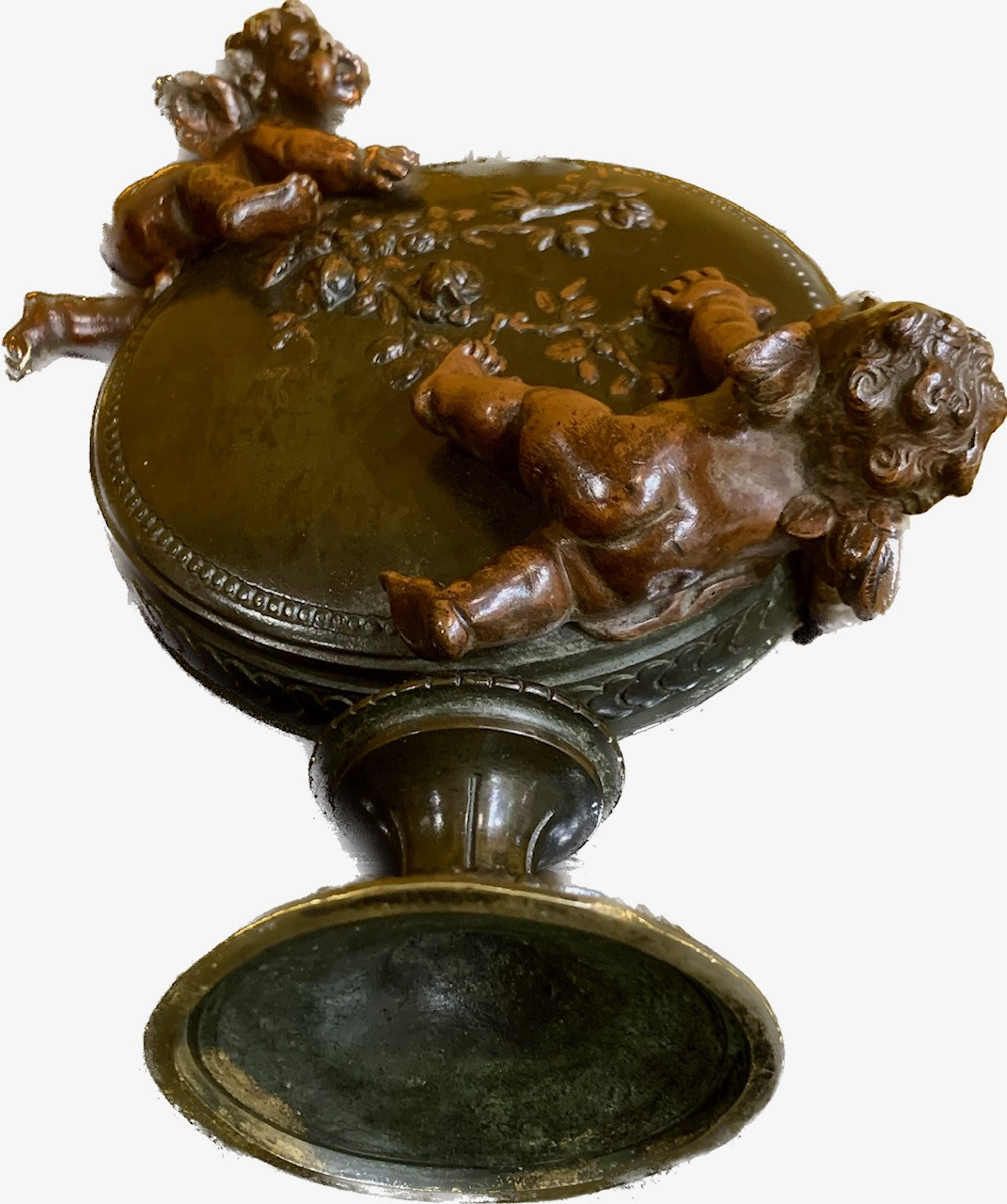 Vaso/ candeliere di bronzo della fine del XIX secolo (1890 circa) dello scultore francese Auguste Moreau (Dijón 1834 - 1917 Malesherbes). Candeliere/ vaso con base rotonda di forma classica con bassi rilievi di foglie, la parte centrale rotonda con due angeli sostenendosi uno nella parte superiore e l’latro nella parte inferiore del margine, centralmente in basso rilievo un ramo di rose in ambi i lati. Il collo superiore é di forma esagonale e ha una cavità di cinque centimetri, pertanto il suo interno é di bronzo massiccio.