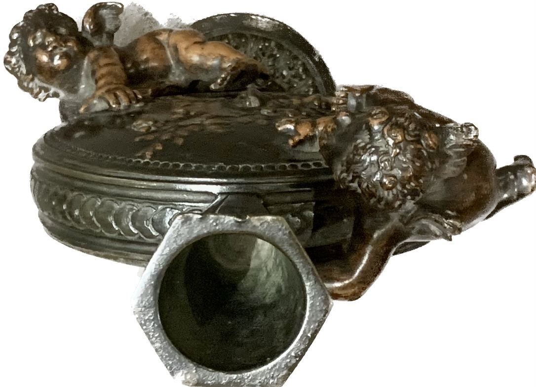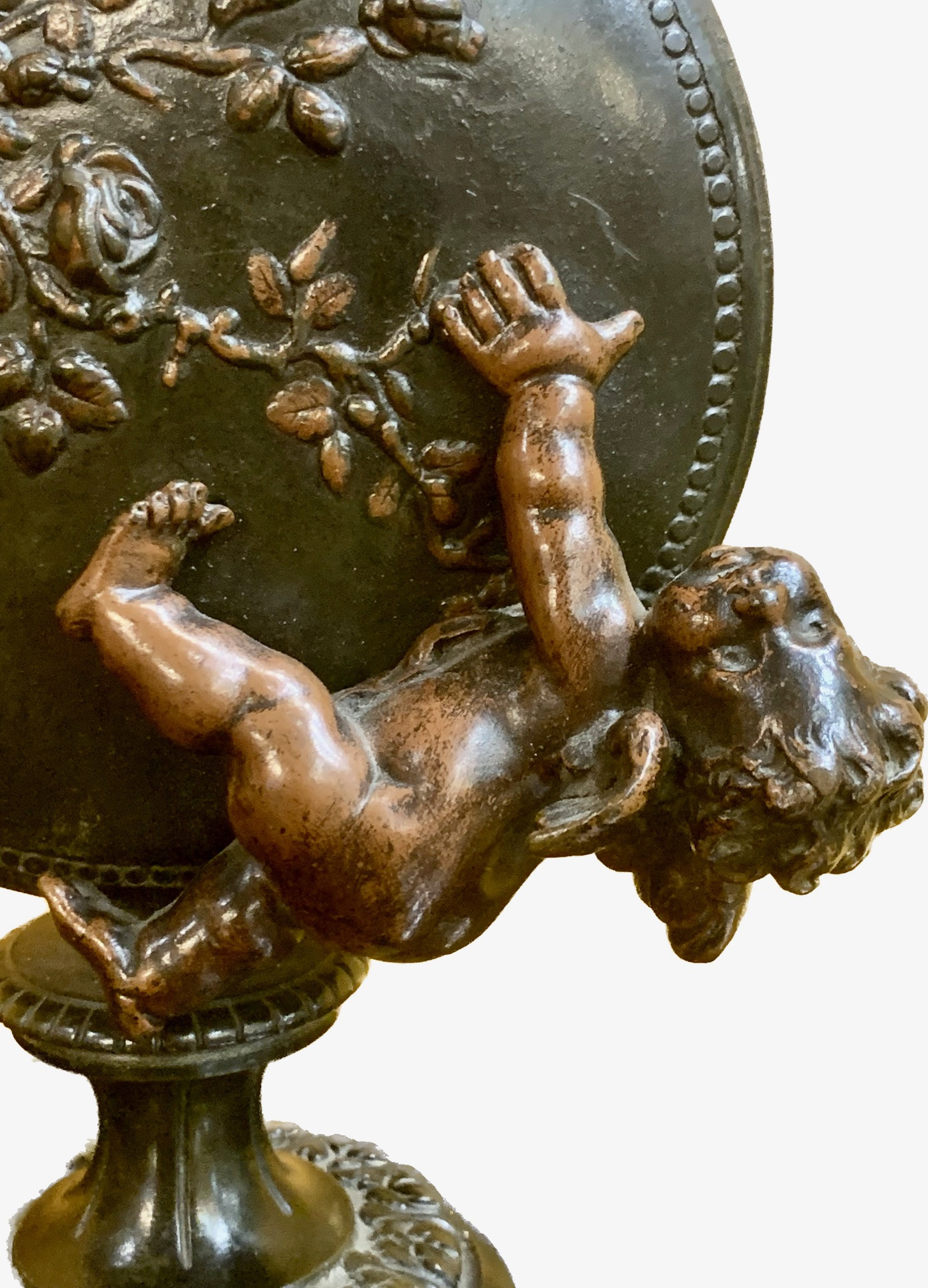 Curioso l’utilizzo di due patine differenti, la base di fondo é realizzata in marrone verde, mentre gli angeli e i rami di rose sono di marrone arancione.