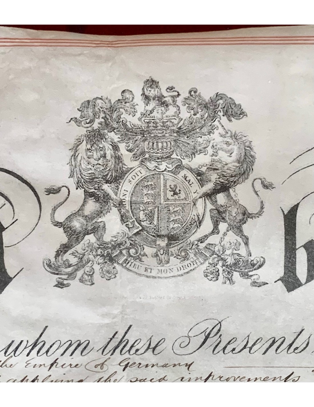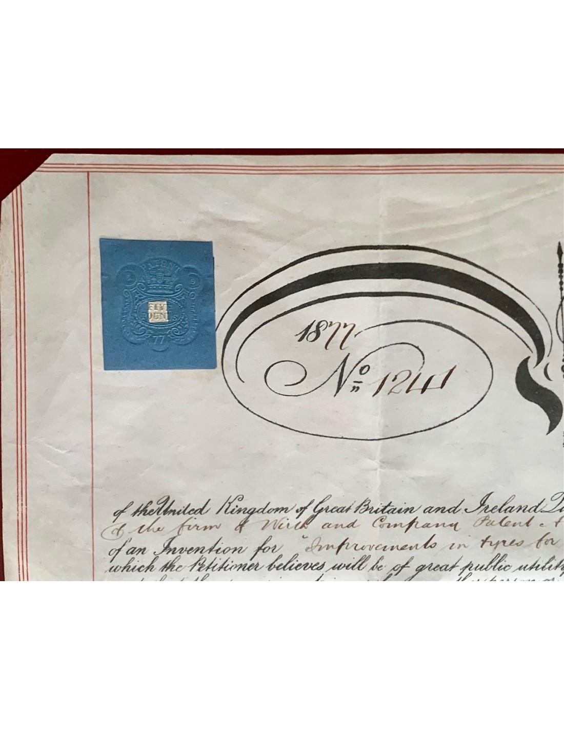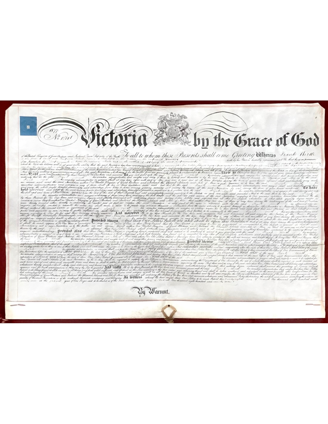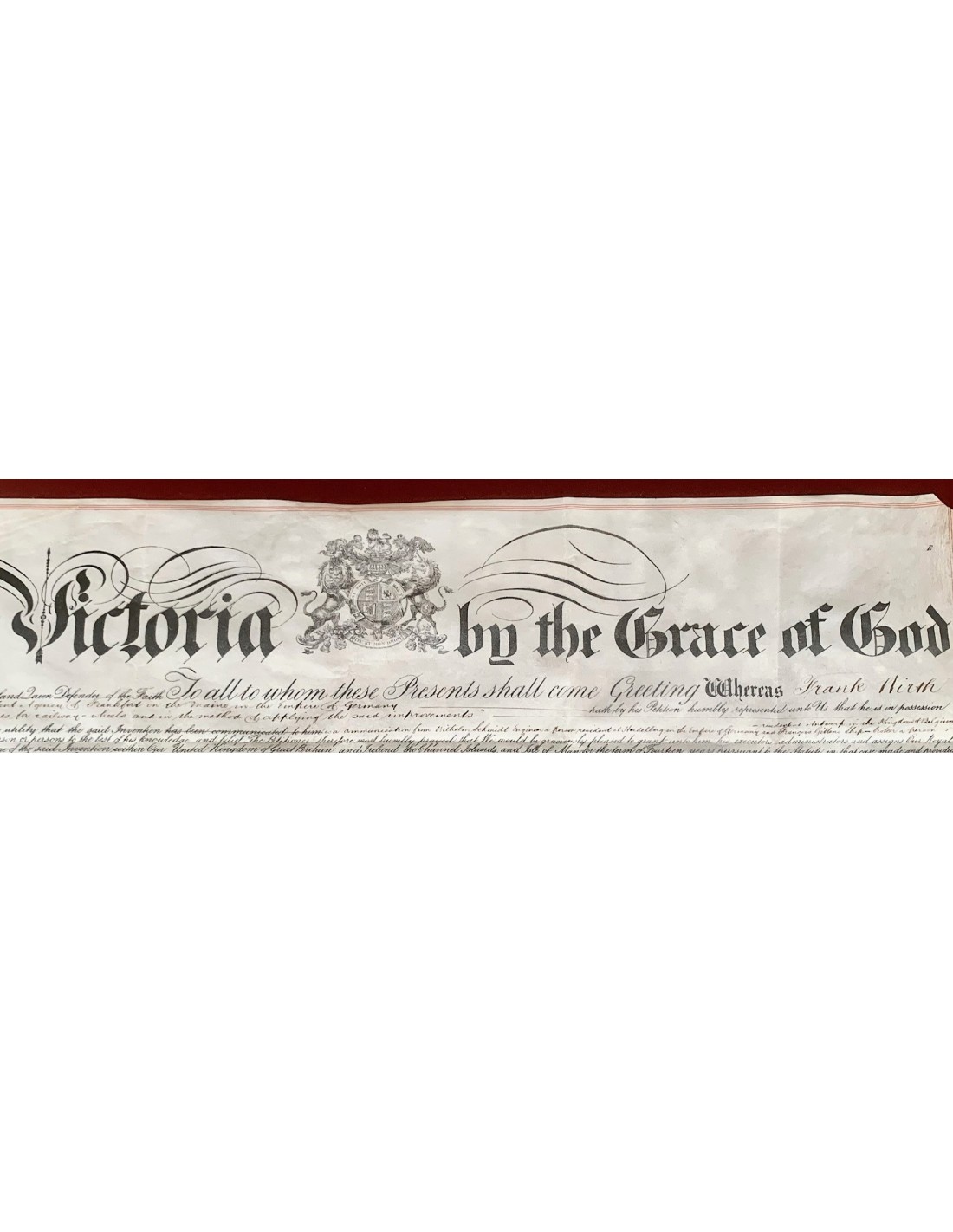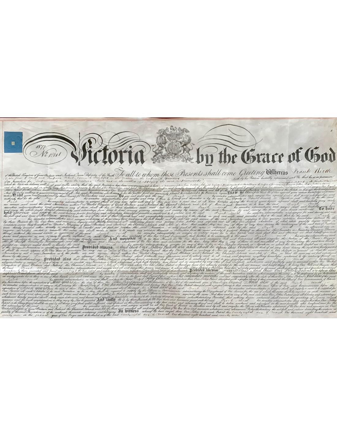 Documento stampato e manoscritto su pergamena, con grande sigillo di color ocra a cera lacca dove é rappresentata la Regina Vittoria nel trono. Documento di brevetto Nº 1.241. Brevetto concesso al signor Frank Wirth, dell’impresa tedesca di Francoforte. La patente é stata concessa per progetti di miglioramento e perfezionamento nel settore ferroviario britannico.