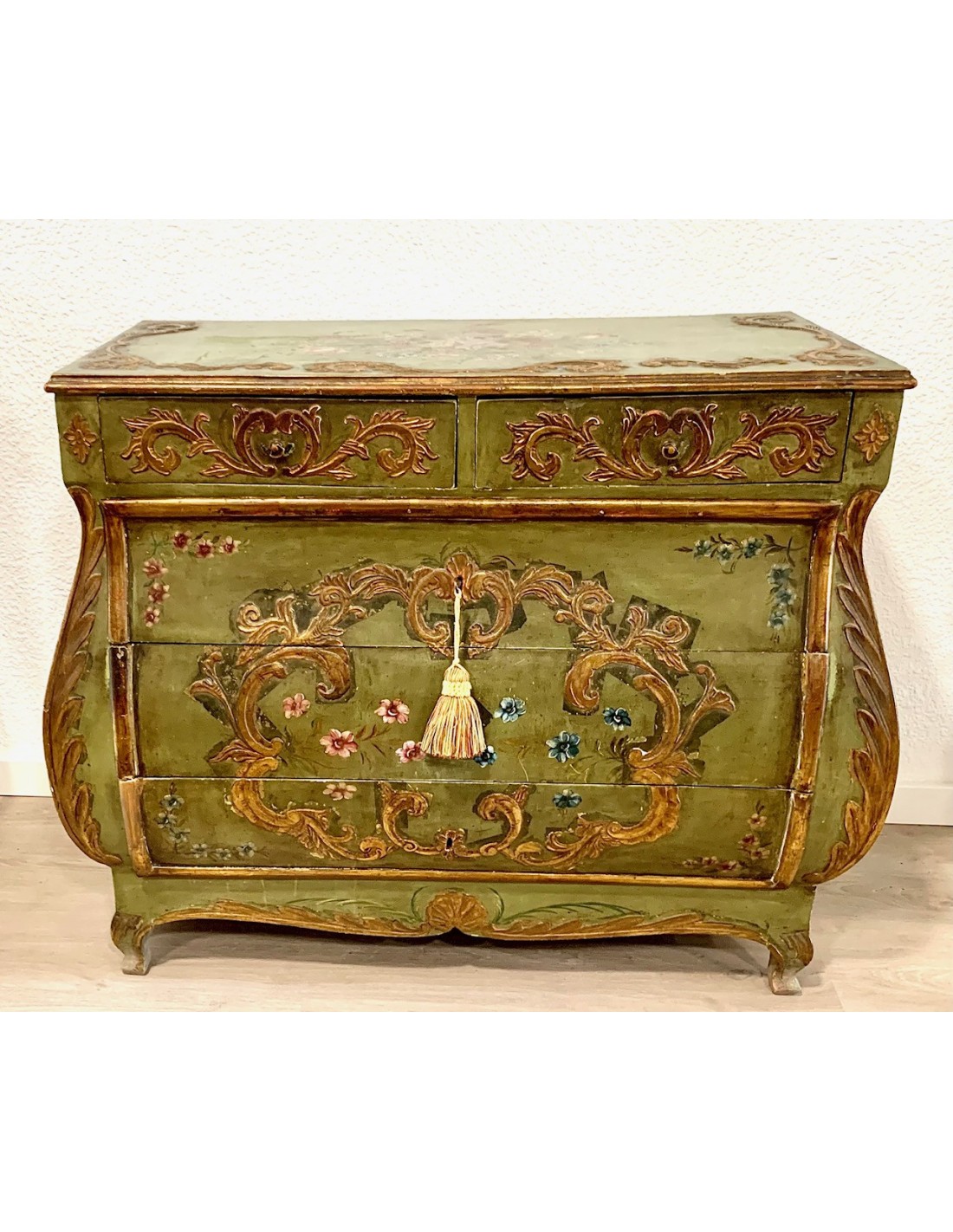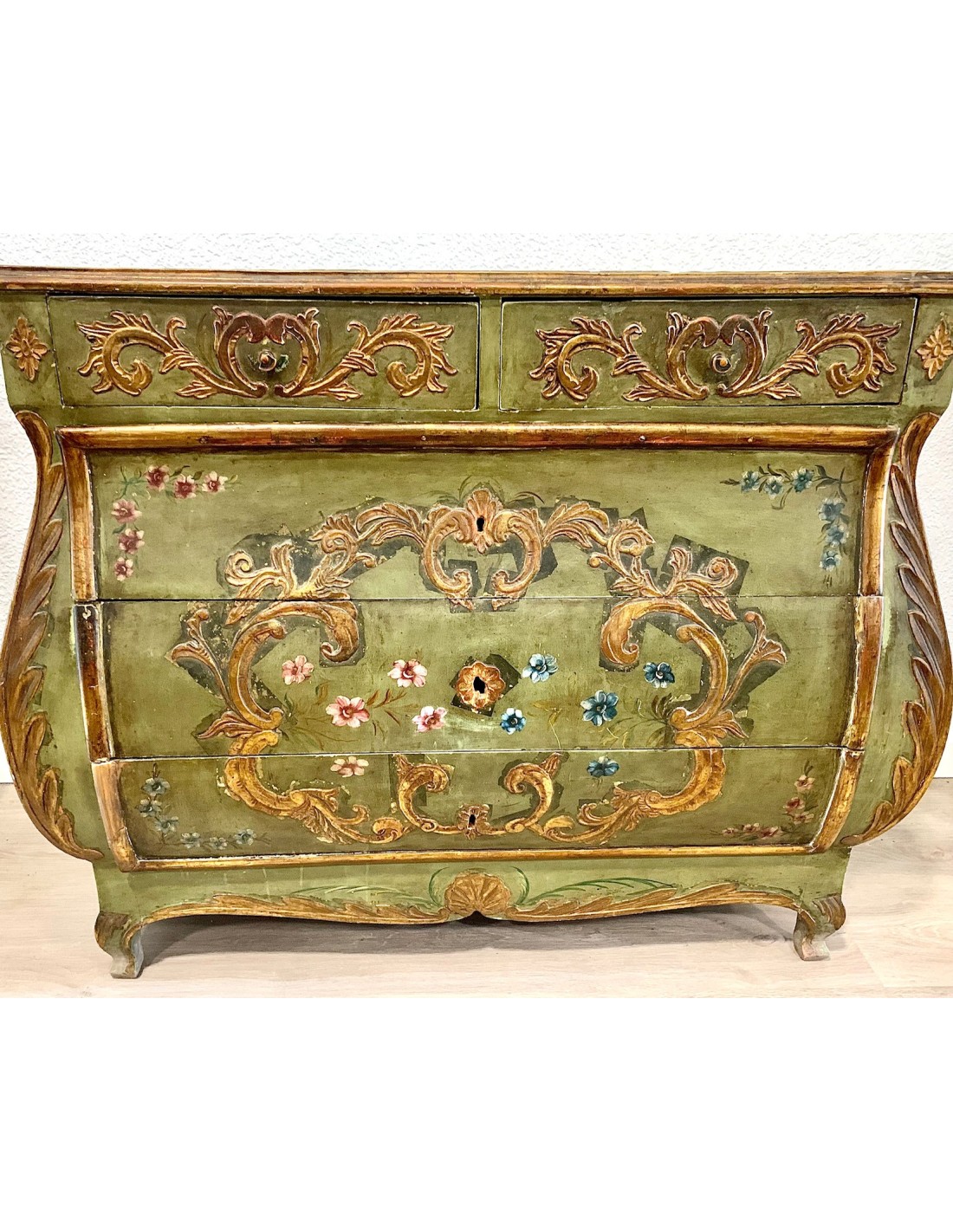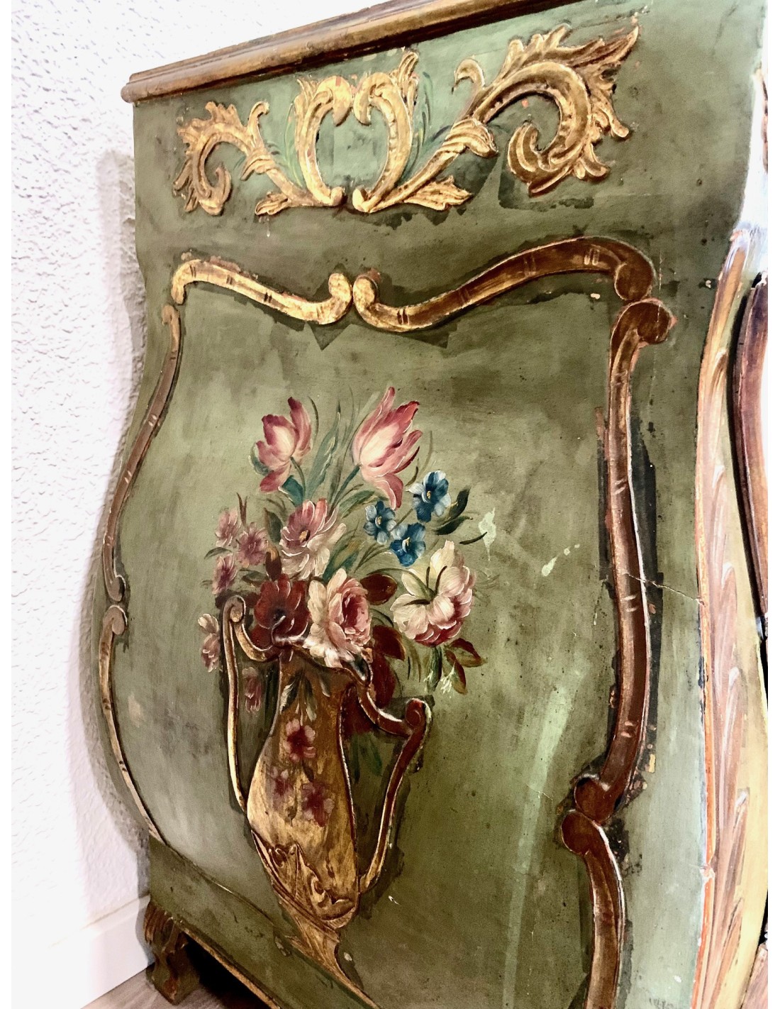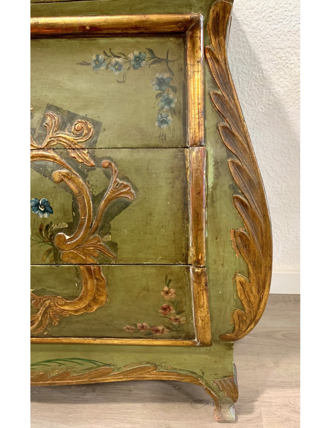 Comó del XIX secolo bombato e laccato con fondo verde, con decorazioni policromate floreali nel piano superiore e i due laterali, lesene in basso rilievo dorate. Due cassetti superiori, tre piú grandi nella parte inferiore. Buono stato di conservazione.